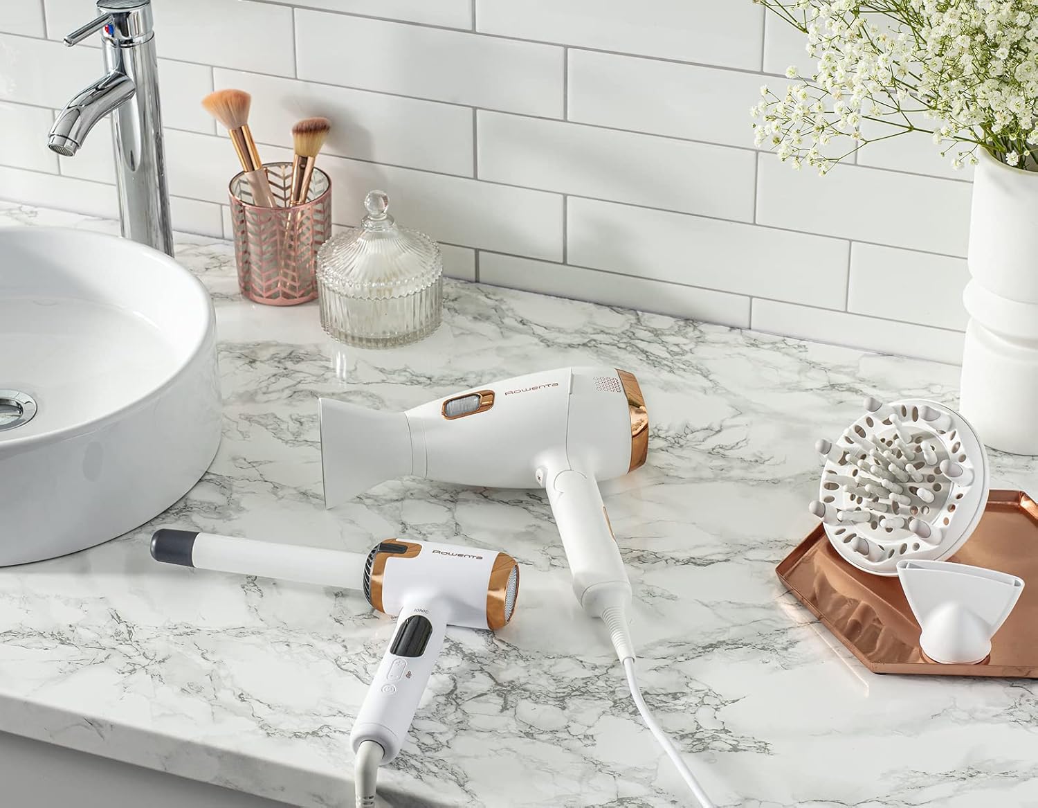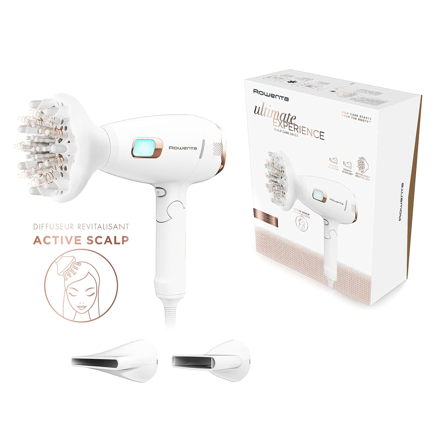 سشوار ماساژور Rowenta Ultimate Experience، 2200 وات، موتور دیجیتال با کارایی بالا، تقویت کننده یون، چرخش ملایم انگشتان، خشک کردن 2 در 1 با ماساژ سر احیا کننده، سفید/مسی، سشوار 1 تکه با عملکرد ماساژ