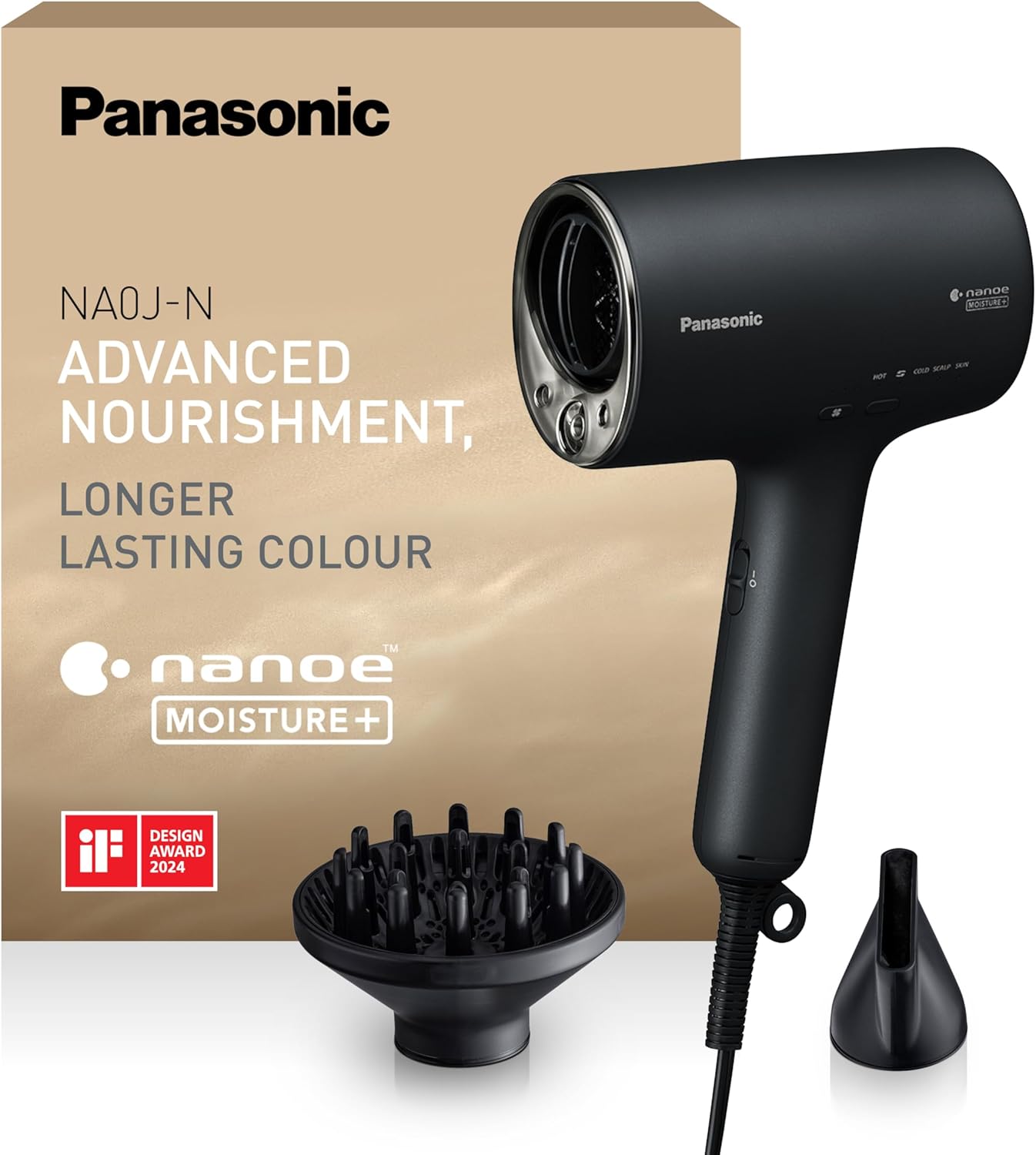 سشوار پاناسونیک EH-NA0J-N825 nanoe™ MOISTURE+ و Mineral، برنده جایزه طراحی iF، نازل پخش کننده و متمرکز کننده، حالت متناوب گرم و سرد، مراقبت از پوست، پوست سر و انتهای مو، 1600 وات، مشکی