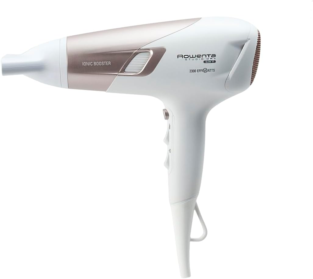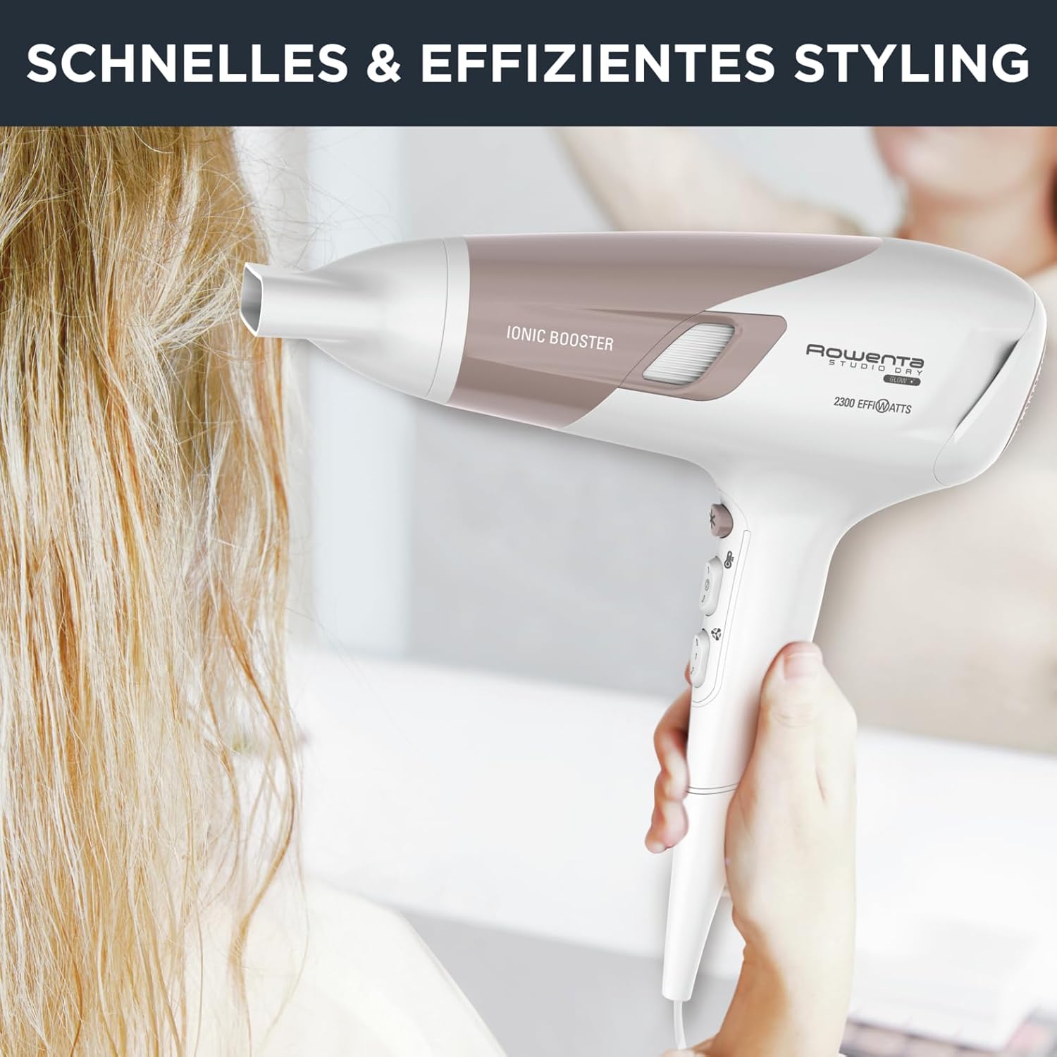 عملکرد حرفهای با ۲۱۰۰ وات و عملکرد یون برای درخشندگی بیشتر المنت گرمایشی با روکش سرامیکی برای خشک کردن ملایم و افزایش اثر یون سری متمرکز کننده برای حالت دادن دقیق و سری پخش کننده برای موهای فر یک دکمهی تنظیم سرعت باد، مدل مو را در پایان خشک شدن تنظیم میکند؛ ۳ حالت دما و ۲ حالت سرعت. امتیاز Stiftung Warentest: خوب (2.5)، آزمایش شده: 14 سشوار؛ 9 مورد خوب، 5 مورد نامناسب اقلام همراه: سشوار Rowenta CV5830 Studio Dry (سفید/رزگلد)، متمرکزکننده، پخشکننده، دفترچه راهنما