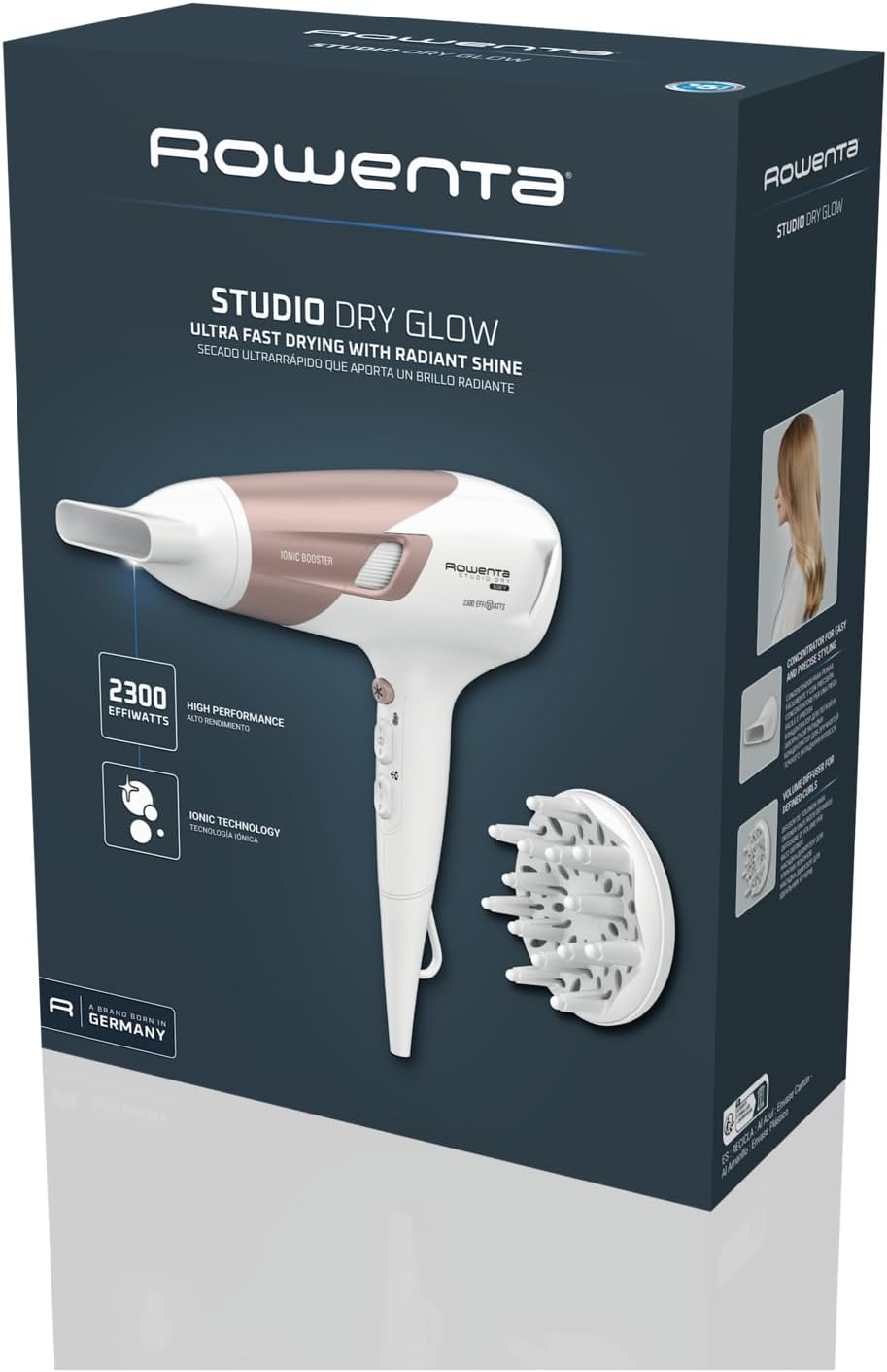 Rowenta Studio Dry Glow Haartrockner, 2100 Watt, Föhn mit Diffusor für Locken, 3 Temperatur- und 2 Geschwindigkeitsstufen, Ionenfunktion, Kaltlufttaste, weiß/roségold, CV5830 Weiß | 1 Zubehör | قیمت یورویی 26.99€