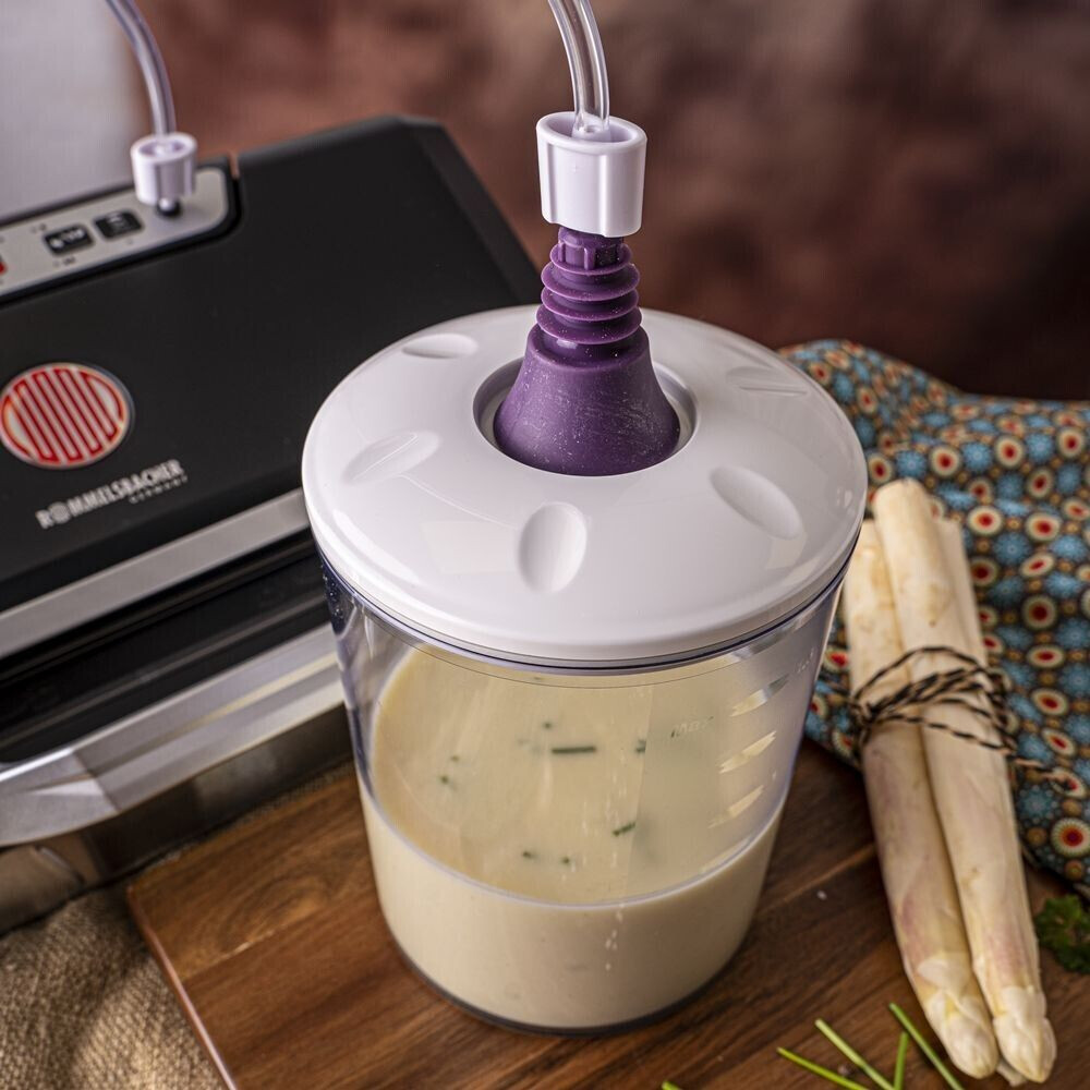 ظرفهای VCK 525 ساخت مجموعه MagicVac® روملزباخر برای تازه نگهداشتن مواد غذایی شما طراحی شدهاند. استفاده از وکیوم برای حذف هوا از داخل ظرف باعث کاهش اکسیداسیون، جلوگیری از فاسد شدن و افزایش ماندگاری مواد میشود.