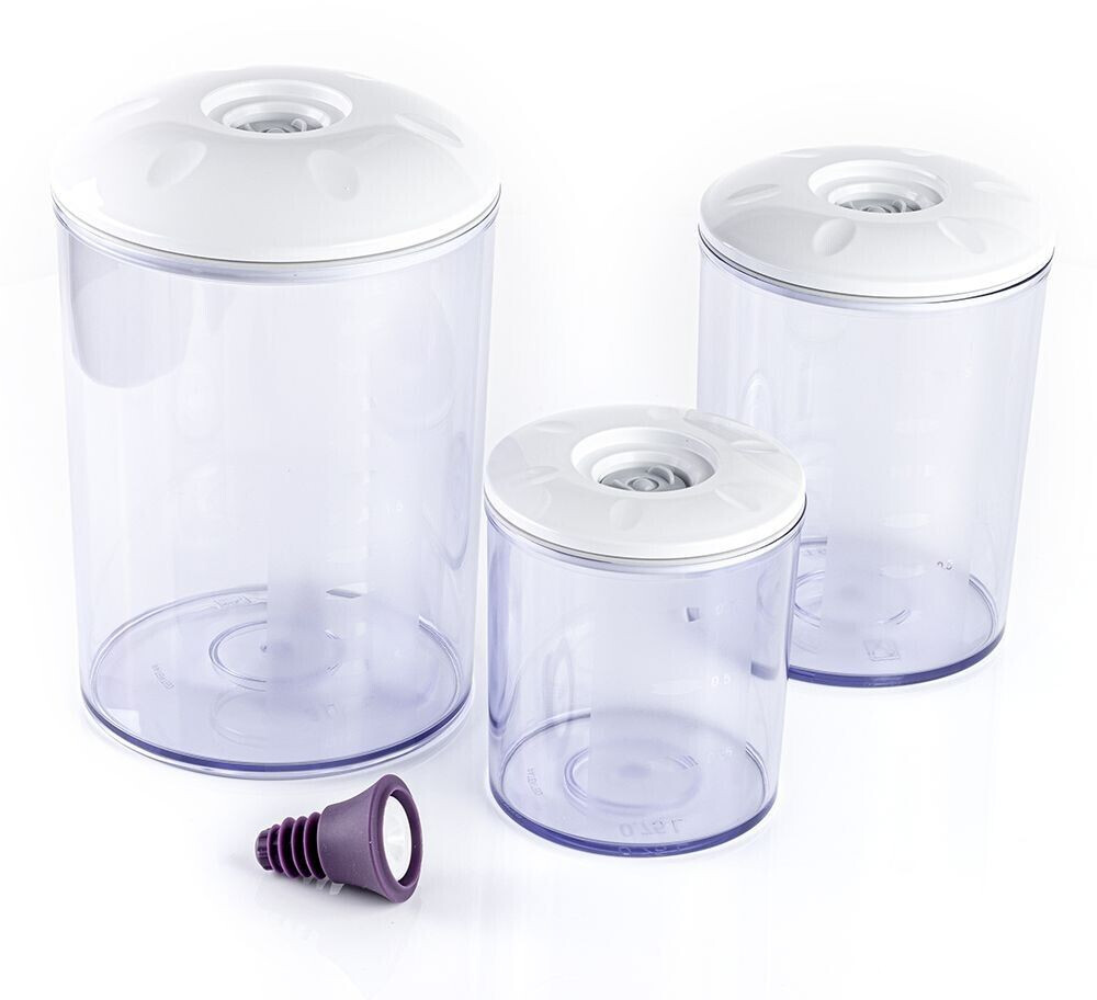 ست ظرفهای نگهداری وکیوم روملزباخر آلمان VCK 525 شامل سه ظرف با ظرفیتهای ۰.۷۵ لیتر، ۱.۵ لیتر و ۳ لیتر است که مواد غذایی روزمره را تازه و بدون هوا نگه میدارد.