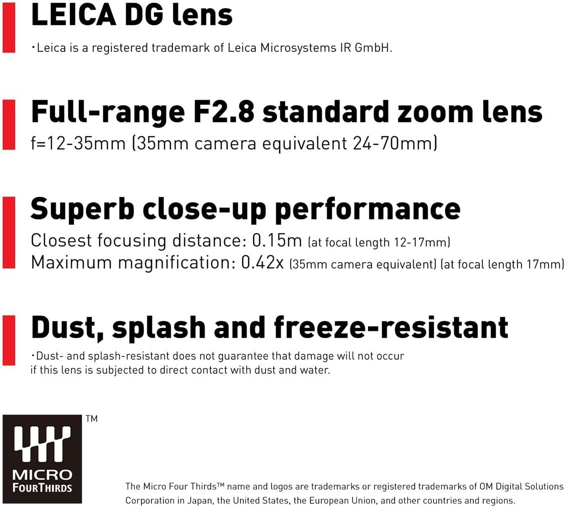 ULTIMATIVE OPTIK: Dieses Leica-zertifizierte Objektiv enthält 14 Elemente in 9 Gruppen, darunter 4 ASPH, 1 UED und 1 UHR Objektiv, um Aberrationen zu minimieren und eine hervorragende Auflösung zu gewährleisten. VIELSEITIGER ZOOM: Die Brennweite von 12-35 mm (35 mm: 24-70 mm) deckt Weitwinkel- bis mittlere Aufnahmen ab und gibt Ihnen Flexibilität für Standbilder und Videos. Die F2.8-Blende liefert tolles Bokeh und hochwertige Aufnahmen bei schlechtem Licht. NAHAUFNAHMEN: Mit einer maximalen Vergrößerung von 0,42x (entspricht 35 mm) und einem minimalen Fokusabstand von nur 15 cm können Sie mit diesem Makroobjektiv aus nächster Nähe unglaubliche Details aufnehmen. BILDSTABILISIERUNG: Dieses Lumix Objektiv verfügt über eine integrierte optische Bildstabilisierungstechnologie (OIS), die sicherstellt, dass Ihre Aufnahmen großartig aussehen, mit scharfen, verwacklungsfreien Konturen über das gesamte Bild. IDEAL FÜR VIDEOS: Dieses Digitalkameraobjektiv bietet einen schnellen, präzisen Autofokus und einen sanften Blendenübergang, perfekt für die einfache Aufnahme hochwertiger 4K-Videos und Standbilder. STAUB-, SPRITZ- UND FROSTBESTÄNDIG: Dieses Lumix Objektiv hält dank seiner speziellen staub-, spritzwasser- und frostbeständigen Konstruktion den härtesten Bedingungen stand, sodass Sie bei Temperaturen von bis zu -10 °C fotografieren können. | قیمت یورویی : 899€