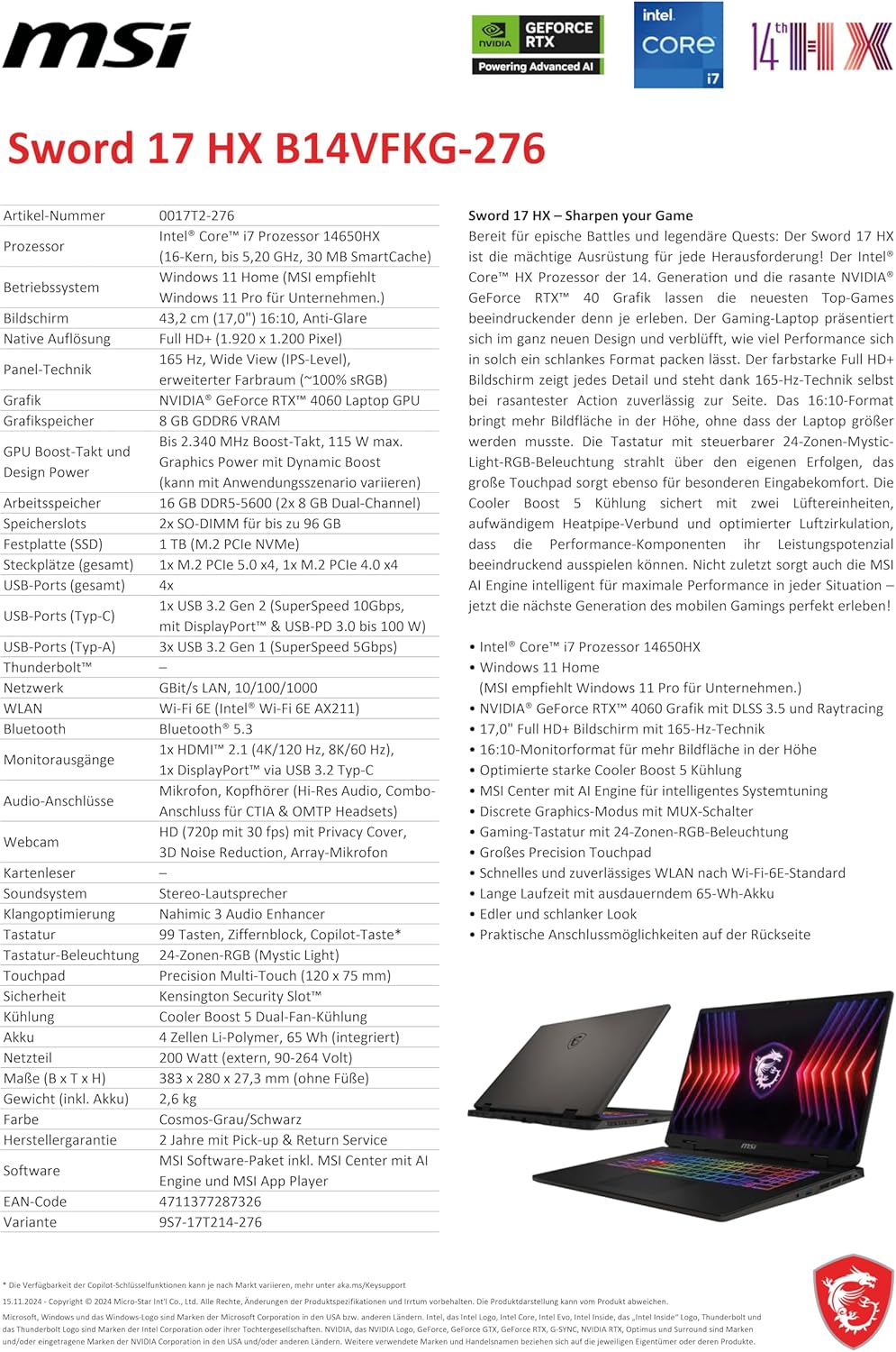MSI Sword 17 HX, Gaming Laptop, 17,0" FHD+, Intel Core i7 Prozessor 14650HX, 16 GB DDR5-5600 RAM, 1 TB, NVIDIA GeForce RTX 4060, Windows 11 Home, inkl. 1 Monat GamePass, QWERTZ Tastatur, B14VFKG-276 Intel Core i7- 14650HX RTX4060 8GB | قیمت یورویی 899€