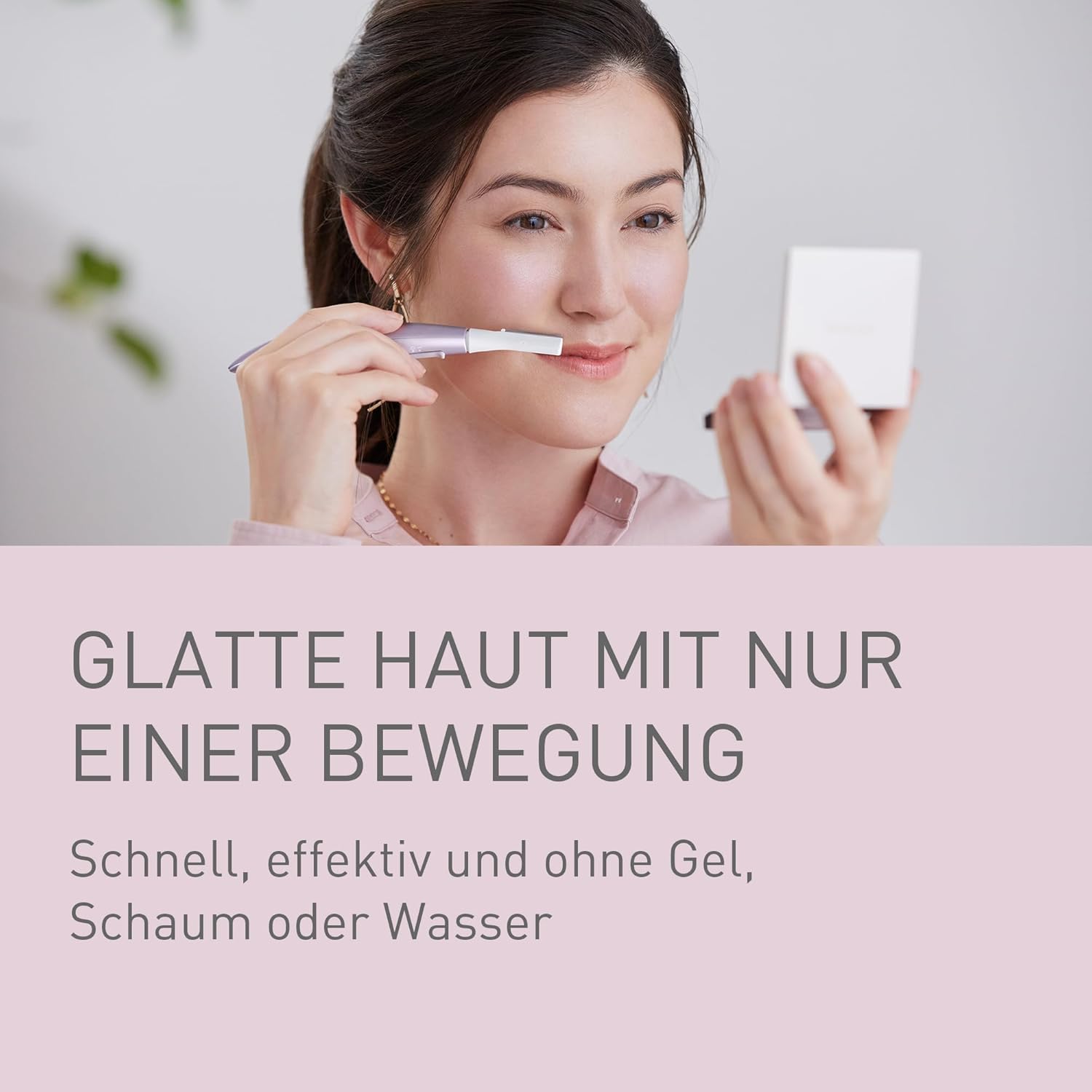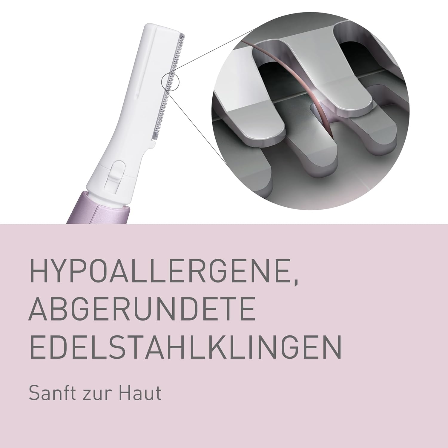 2-IN-1 KLINGENSYSTEM: Die zwei austauschbaren Klingen dieses kabellosen Trimmers entfernen unerwünschte Gesichtshaare, für präzises Styling und die Entfernung von feinen Härchen SANFTE HAARENTFERNUNG: Eine sanfte Gesichtshaarentfernung dank der abgerundeten Edelstahlklingen dieses Gesichtsrasierers für Frauen, die empfindliche Haut schonen und Haare effizient entfernen FLEXIBLER SCHWENKKOPF: Ein gründliches, glattes Ergebnis dank flexiblem Schwenkkopf dieses Damen-Trimmers, der den Gesichtskonturen folgt und feine Härchen erfasst, ohne die Haut zu reizen HYPOALLERGENE KLINGEN: Die hypoallergenen Edelstahlklingen dieses leichten Damenrasierers sorgen für lang anhaltende Schärfe und reduzieren Hautirritationen TROCKENTRIMMUNG: Unerwünschte Gesichtshaare und Flaum ganz ohne Creme oder Seife entfernen mit diesem kompakten Trimmer für schnelles Nachbessern zu Hause oder unterwegs KOMPAKT & TRAGBAR: Dieser tragbare Trimmer passt mit nur 31 g Gewicht und schlankem Design leicht in die Reisetasche | قیمت یورویی : 21.99€