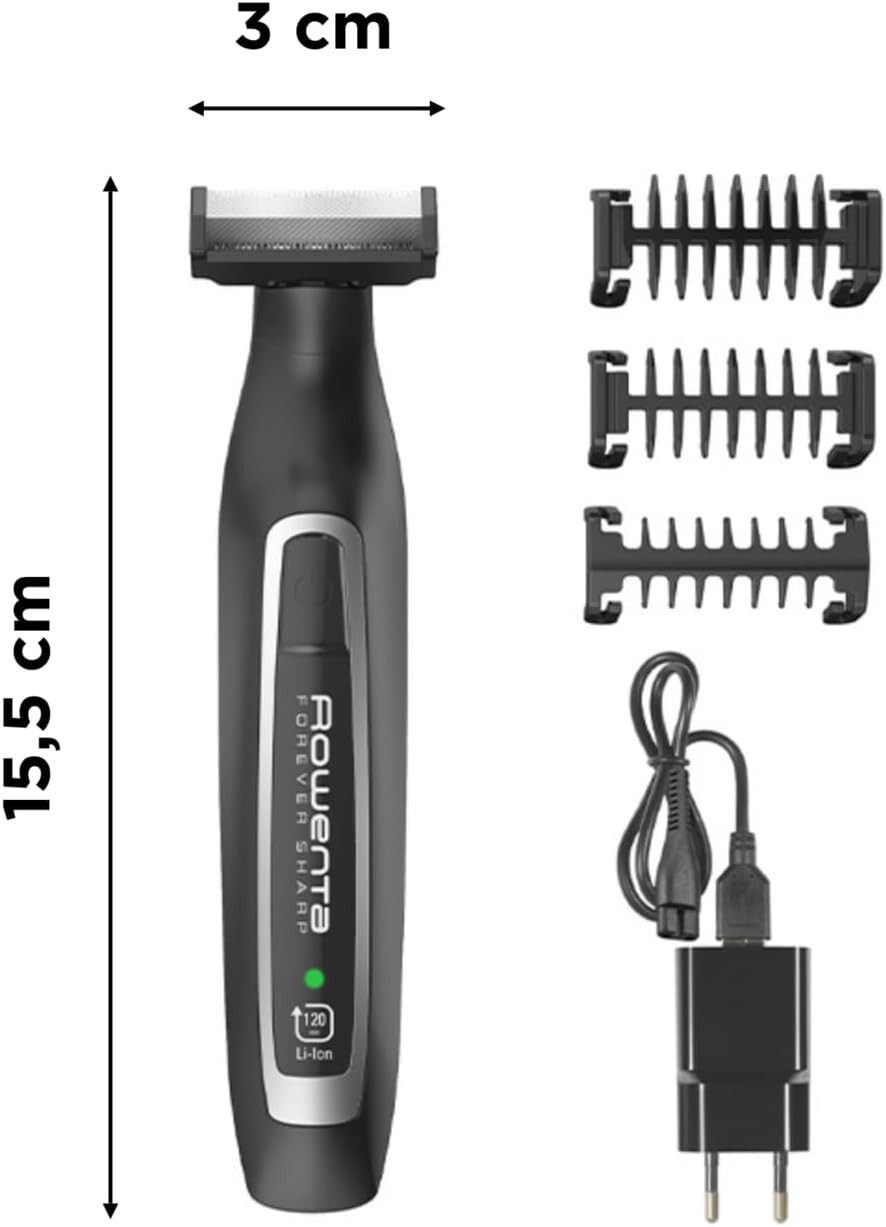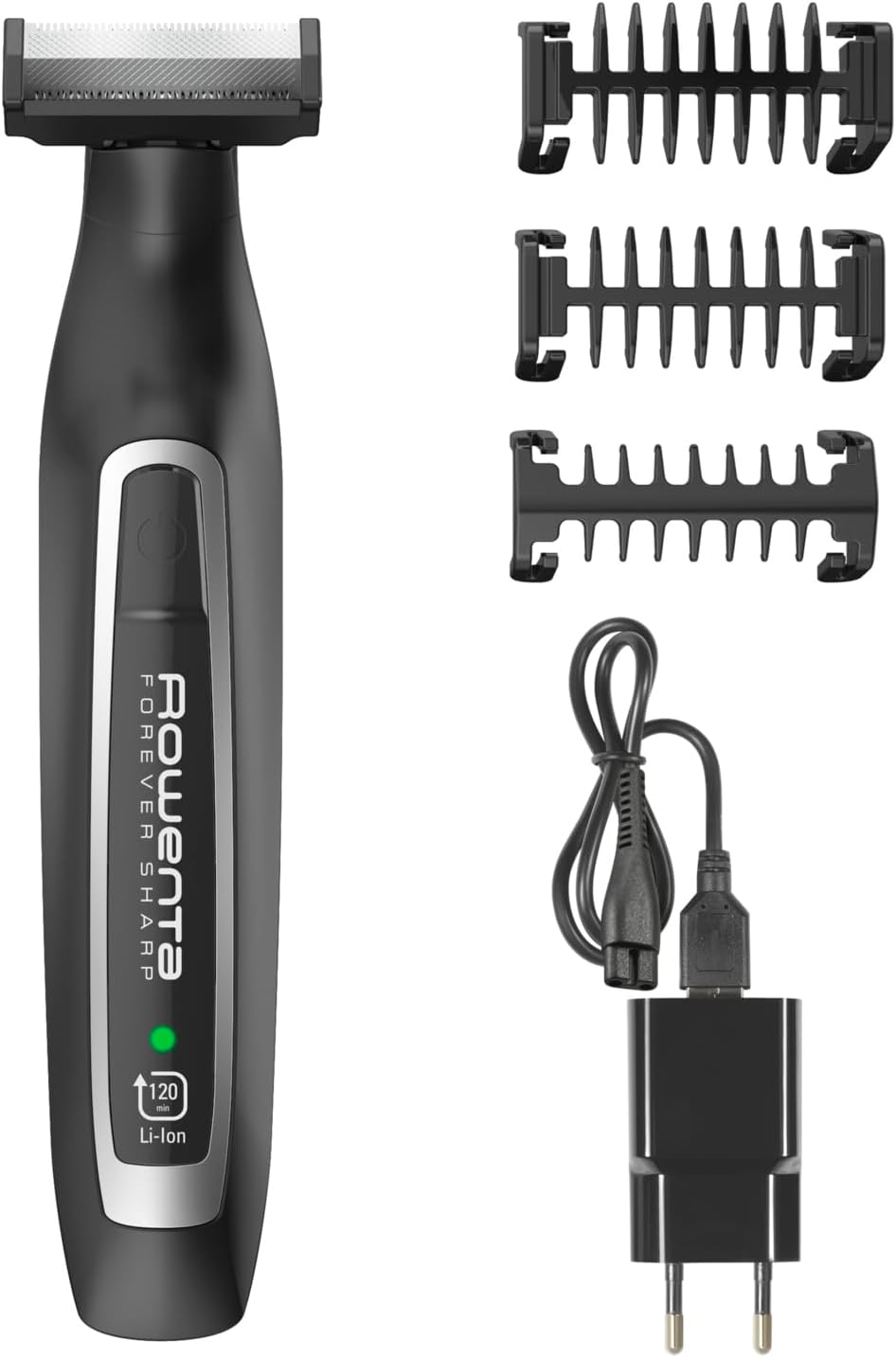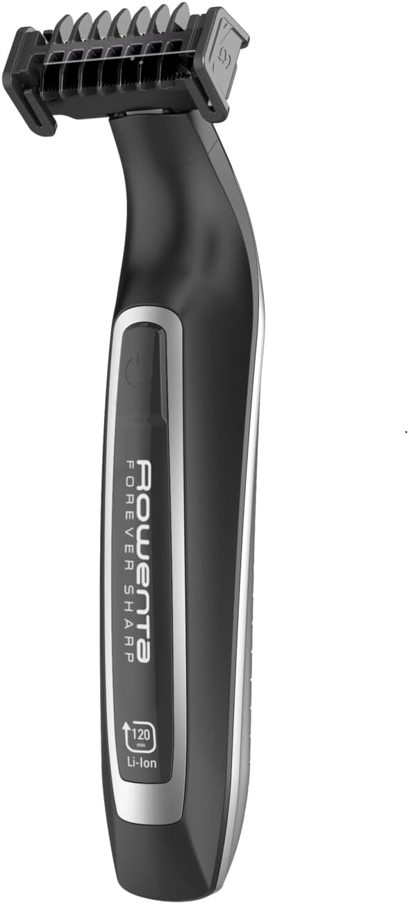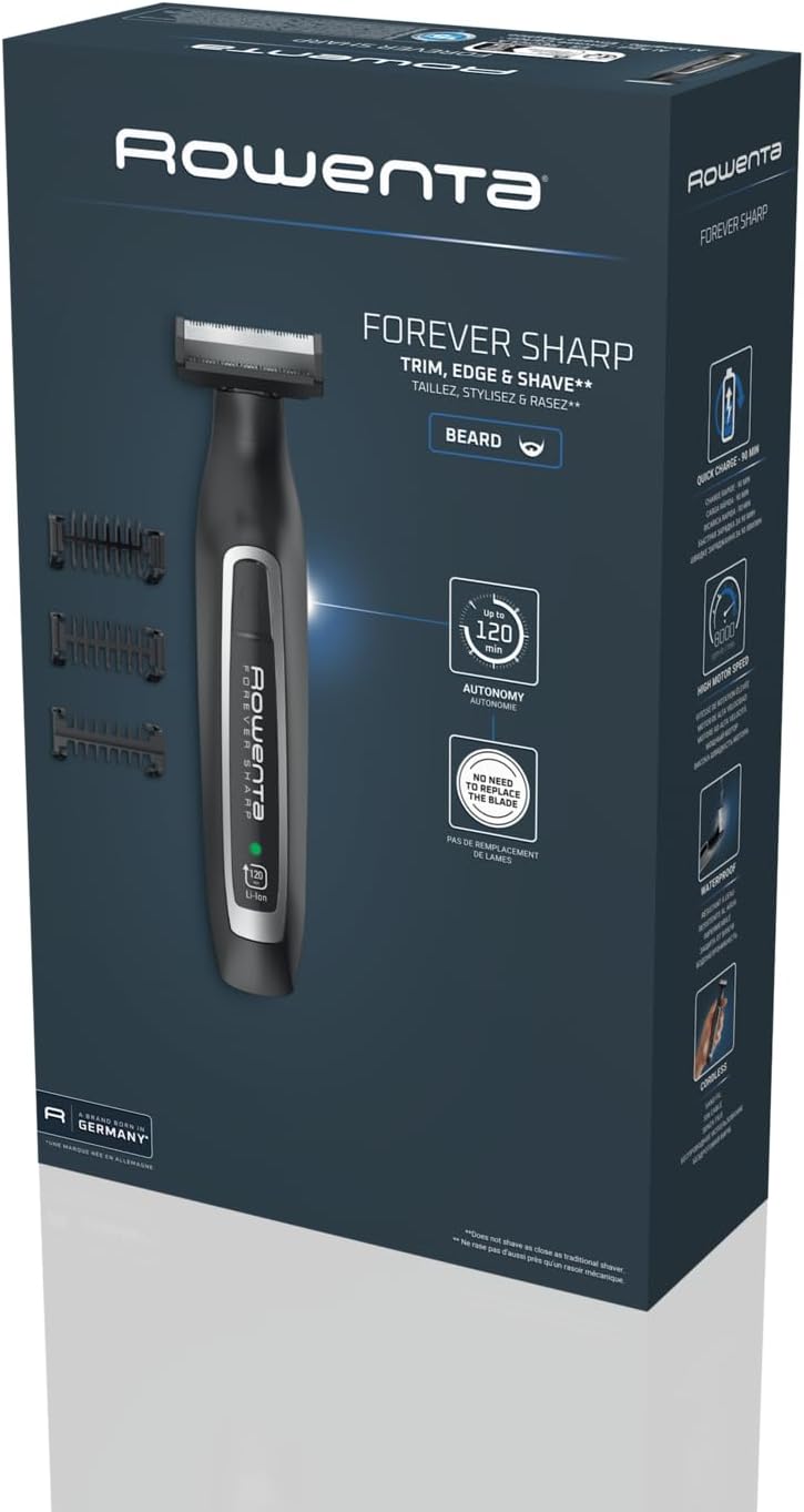 Rowenta Forever Sharp Bartschneider TN6000, Einstellbare Bartlängen: 1, 3, 5mm, 120 Min. Laufzeit, Batteriestandanzeige, Edelstahlklingen, kabellose Anwendung, Trimmen und Rasieren, Schwarz Schwarz | 4 Zubehörteile