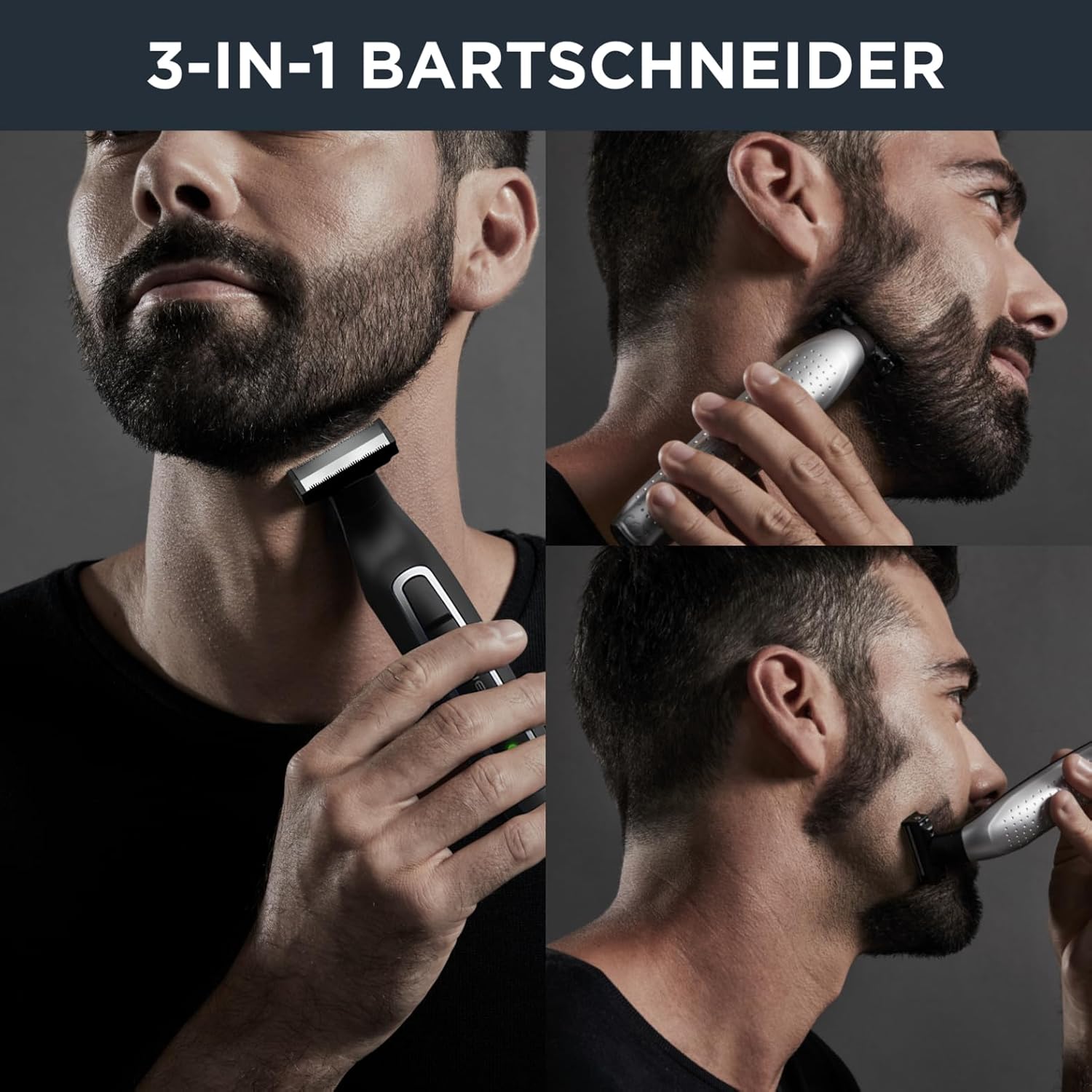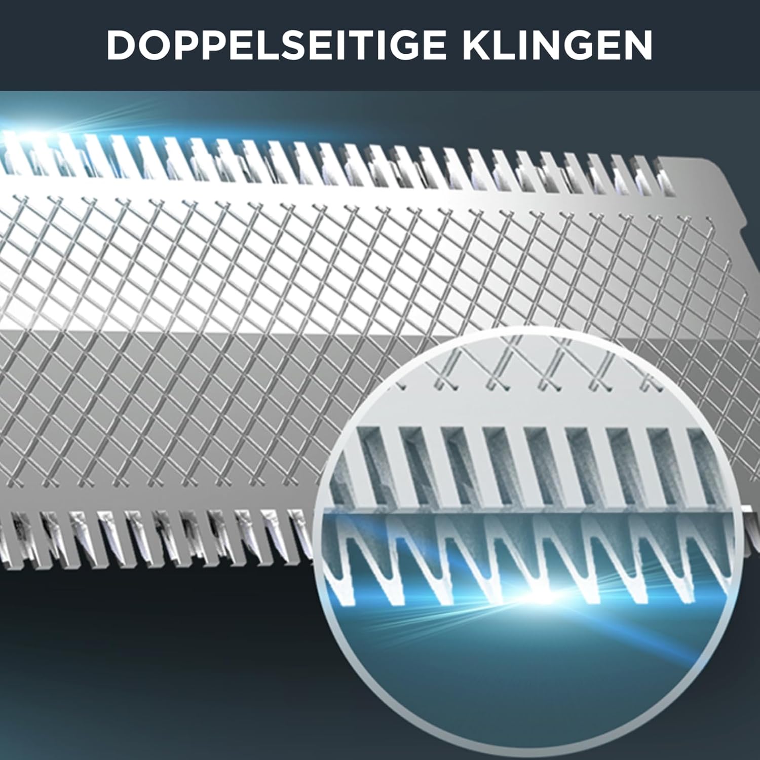 Auswechseln der Klingen nicht erforderlich: Selbstschärfende Klingen aus 100 Prozent Edelstahl sorgen für hohe Beständigkeit und einzigartige Leistung Beispiellose Autonomie: Schnellladender Li-Ionen-Akku mit 120 Minuten Laufzeit 3-in-1 Barttrimmer: Schneiden, stutzen und rasieren Sie jede Bartlänge dank der drei enthaltenen Kämme (1, 3, 5mm) Der perfekte Schnitt: Zweiseitige, ultrascharfe Klinge für präzises Styling und Schneiden in einem Durchgang Bedienkomfort: Kompakt und leicht, mit intelligenter Batteriestandsanzeige Einfache Reinigung des kabellosen Trimmers: Wet & Dry Technologie und herausnehmbare Klingen für eine hygienische Reinigung | قیمت یورویی : 31.56€