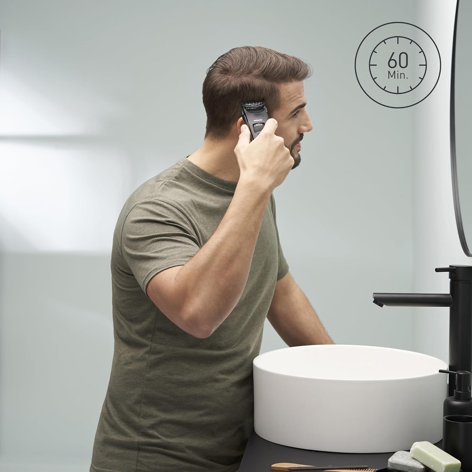 ULTRASCHNELLER MOTOR: Der ultraschnelle Linearmotor dieses kabellosen Haarschneiders sorgt für schnelles, sanftes Schneiden bei jeder Haardicke und eine konstante Leistung bei jedem Akkustand. FORTSCHRITTLICHE KLINGEN: Langlebige, superscharfe und breite 45°-Klingen aus japanischem Edelstahl schneiden durch jeden Haartyp und jede Haarstärke und erfassen mit jedem Strich mehr Haare. Für einen schnellen, effizienten und komfortablen Haarschnitt. 20 LÄNGENEINSTELLUNGEN: Dieser wiederaufladbare Haarschneider verfügt über ein intuitives Einstellrad mit 20 Längen von 0,5 bis 10 mm in Abständen von 0,5 mm, um einen mühelosen und individuellen Schnitt zu ermöglichen. PROBLEMLOSE REINIGUNG: Dank des wasserdichten IPX7-Designs können Sie die Haarschneidemaschine und den Kammaufsatz sicher unter fließendem Wasser abspülen. Für eine schnelle, einfache und hygienische Reinigung. EINFACHE BEDIENUNG: Dieser ergonomische Trimmer lädt sich in 1 Stunde vollständig auf, sodass Sie ihn 60 Minuten lang kabellos nutzen können. Er hat eine Ladestation, eine LED-Akkuanzeige, eine Reisesperre und bietet kabellosen und kabelgebundenen Betrieb. | قیمت یورویی : 101.29€