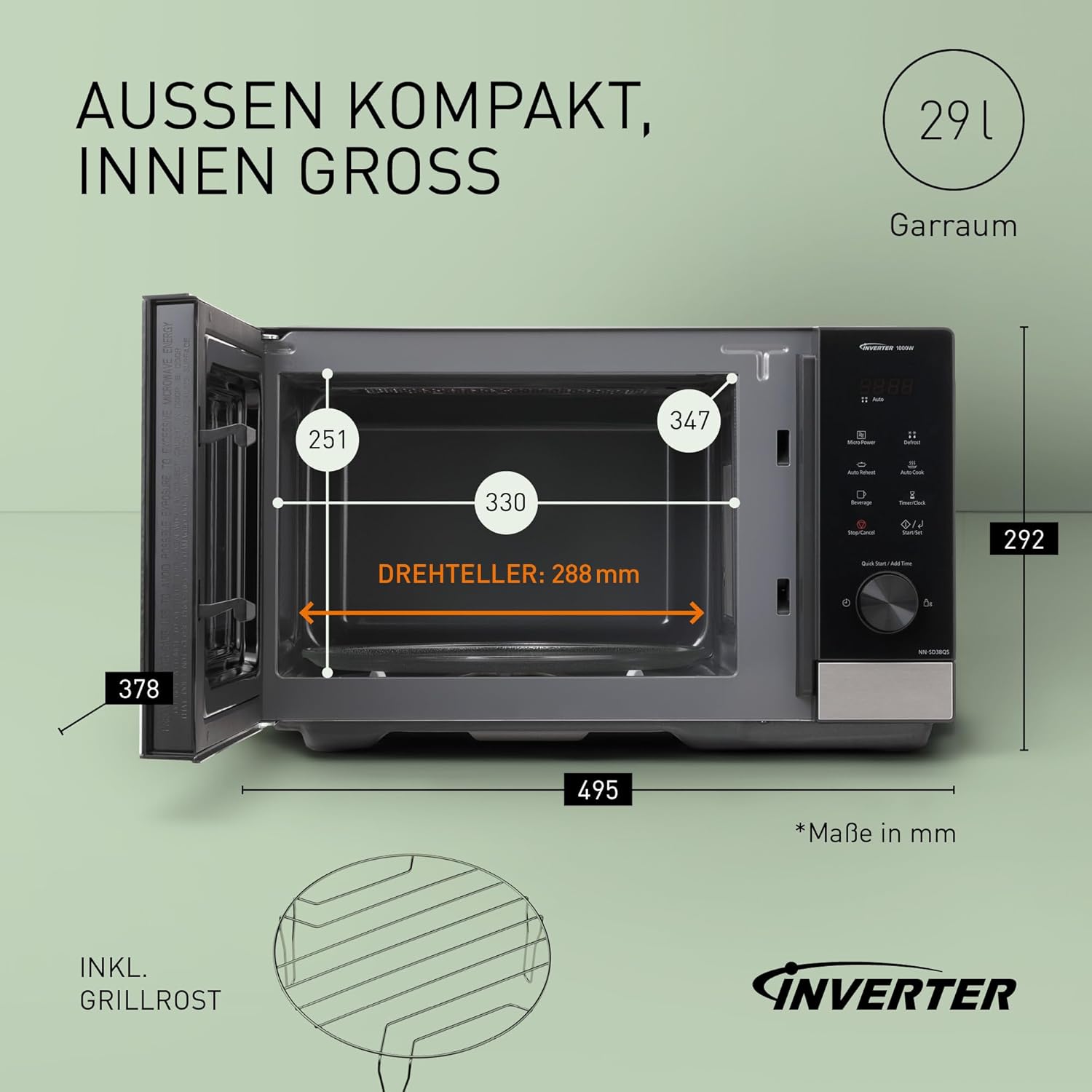 OPTIMALE KOCHLEISTUNG: Bereiten Sie mit dieser kompakten Mikrowelle eine große Auswahl an Gerichten zu, mit über 7 Leistungsstufen bis zu 1000 W und einer präzisen Steuerung, für optimalen Geschmack, Konsistenz und Nährstoffe GLEICHMÄSSIG AUFWÄRMEN & AUFTAUEN: Kochen Sie Lebensmittel schonend, gleichmäßig und präzise dank der Inverter-Technologie, wodurch Nährstoffe erhalten bleiben und ein Überkochen verhindert wird 11 AUTOMATIKPROGRAMME: Vereinfachen Sie Ihr Kochen mit einer Vielzahl automatischer Programme, darunter automatisches Aufwärmen, frisches Gemüse, frischer Fisch, Pellkartoffeln und Reisauflauf AUTOMATISCH AUFTAUEN: Machen Sie Schluss mit dem Rätselraten bei der Essenszubereitung mit 3 speziellen automatischen Auftauprogrammen, die die Hitze automatisch dem Gewicht anpassen, damit Textur und Geschmack erhalten bleiben KOMPAKTES PREMIUM-DESIGN: Sparen Sie Platz mit dem schlanken, minimalistischen Design dieser 29-l-Premium-Mikrowelle, ideal für große Gerichte | قیمت یورویی : 169.99€