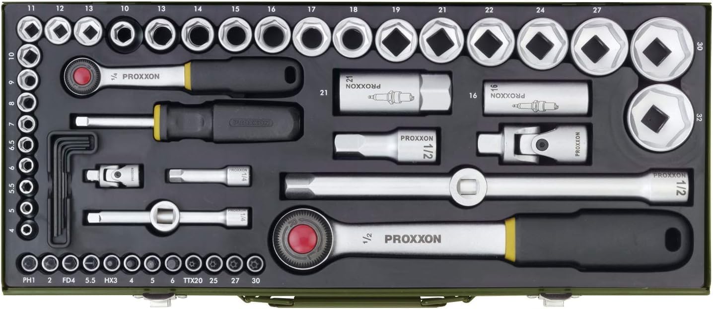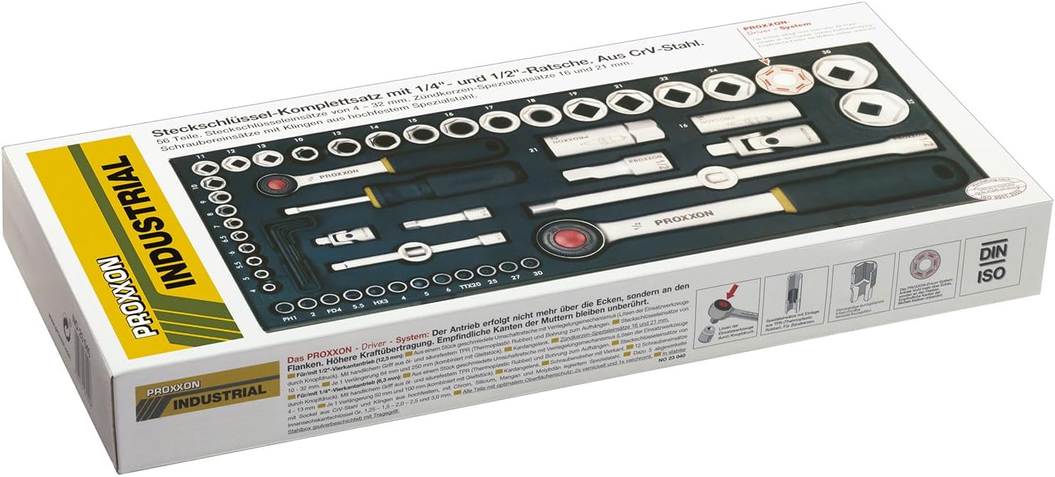 Praxisorientierter Steckschlüsselsatz 1/2“ und 1/4" mit Standardratsche, Ohne unnötige Füllgrößen für professionelle Anwender Herausragende Materialqualität dank kaltgeschmiedeten 31 CrV 3-Stahls für ideale Härte und Zähigkeit, Zweifach vernickelt und matt-verchromt Werte für Härte und maximales Drehmoment sind deutlich höher, als von DIN/ISO gefordert, Klar lesbare Schlüsselweiten mit Lasermarkierung Hochfeste, flexible Formeinlagen aus gespritztem Polypropylen, Für eine einfache Entnahme der Werkzeuge ohne Klemmung, Kompakter Stahlkasten Lieferumfang: 1 x PROXXON Steckschlüssel-Komplettkasten, 56-teilig, Gewicht: 5,7 kg, Außenmaße: 450 x 200 x 55 mm, Artikelnummer: 23040 | قیمت یورویی : 74.03€
