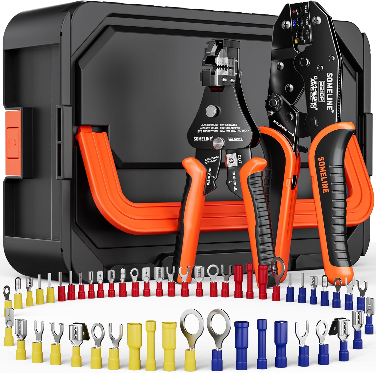 SOMELINE Crimpzange Kabelschuhe Set, 51 Arten [0,34–6 mm²] Kabelschuhe, mit Kabelschuhzange und Automatischer Abisolierzange, Kabelschuhe Set – Crimpzange – Crimpzange Set 51 Typen + 2 Werkzeuge (Version A)