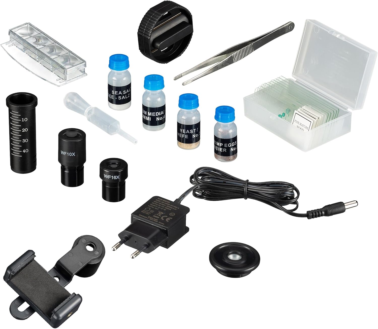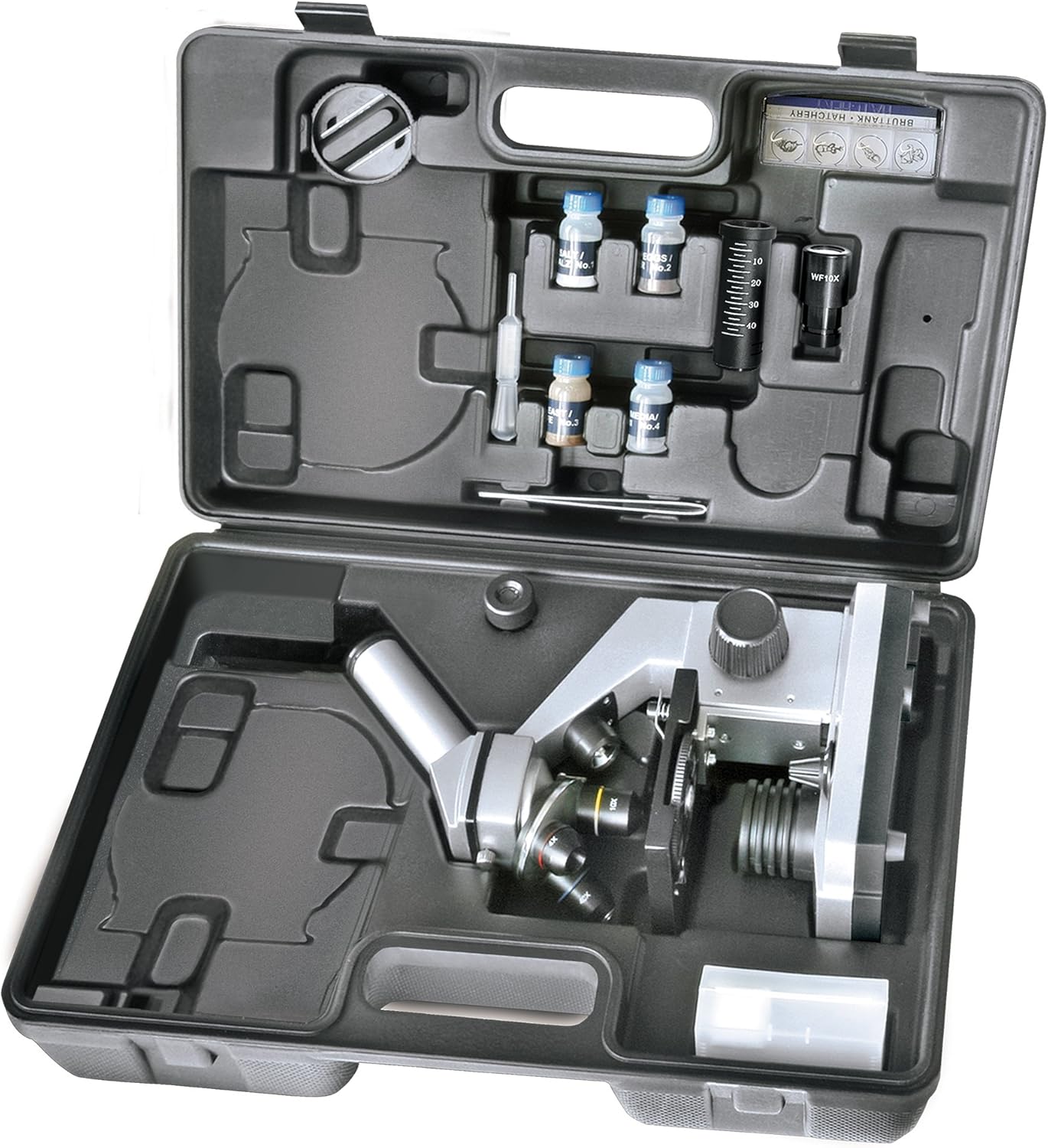Das hochwertige monokulare Mikroskop mit LED-Beleuchtung, einer hohen Vergrößerung und seinem umfangreichem Zubehör ist ideal zum Einstieg in die Welt der Mikroskopie. Dank der batteriebetriebenen Beleuchtung eignet es sich für den mobilen Einsatz. Auf dem höhenverstellbaren Objekttisch werden die Untersuchungsobjekte mit der Durchlicht- und Auflicht-Beleuchtung optimal ausgeleuchtet und mit den enthaltenen Okularen können bis 1024-fache Vergrößerungen erzielt werden. Die Pull-Out Barlow Linse ermöglicht stufenloses Zoomen und mit dem enthaltenen Smartphone-Adapter können Sie eigene Bilder von den untersuchten Objekten machen. Im praktischen Transportkoffer findet alles seinen Platz. Abmessungen: 145x100x290 mm / Gewicht: 1,24 kg; batteriebetrieben mit 3x AA Batterien (enthalten im Lieferumfang) Lieferumfang: Mikroskop; Transportkoffer,;Smartphonehalter,;2 Okulare (WF10x, WF16x),;3 Objektive (4x,10x,40x); Barlowlinse; Objektträger; Deckgläser (je 5); Pipette; Einschlussmittel; Mikrotom; Zucht-Set für Garnelen (Artemia); Batterien; Anleitung | قیمت یورویی : 103.99€