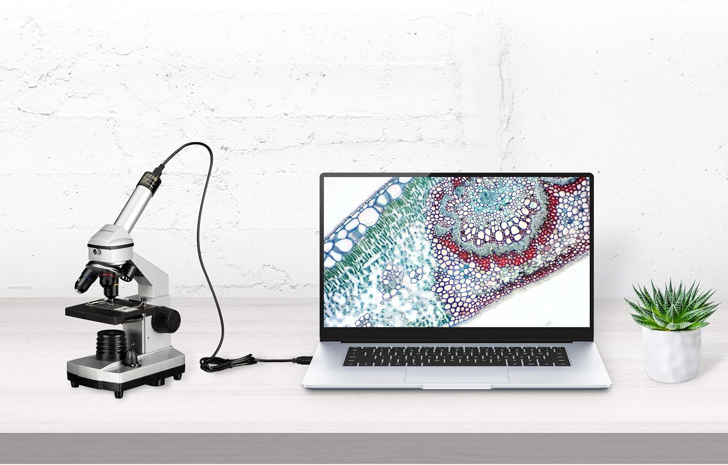 مجموعه میکروسکوپ Bresser Junior با بزرگنمایی 40x-1024x به همراه دوربین USB و روشنایی LED روشن برای مشاهدات با نور عبوری، شامل یک بسته لوازم جانبی جامع و کیف سخت محکم. شامل کیف سخت (تکی).