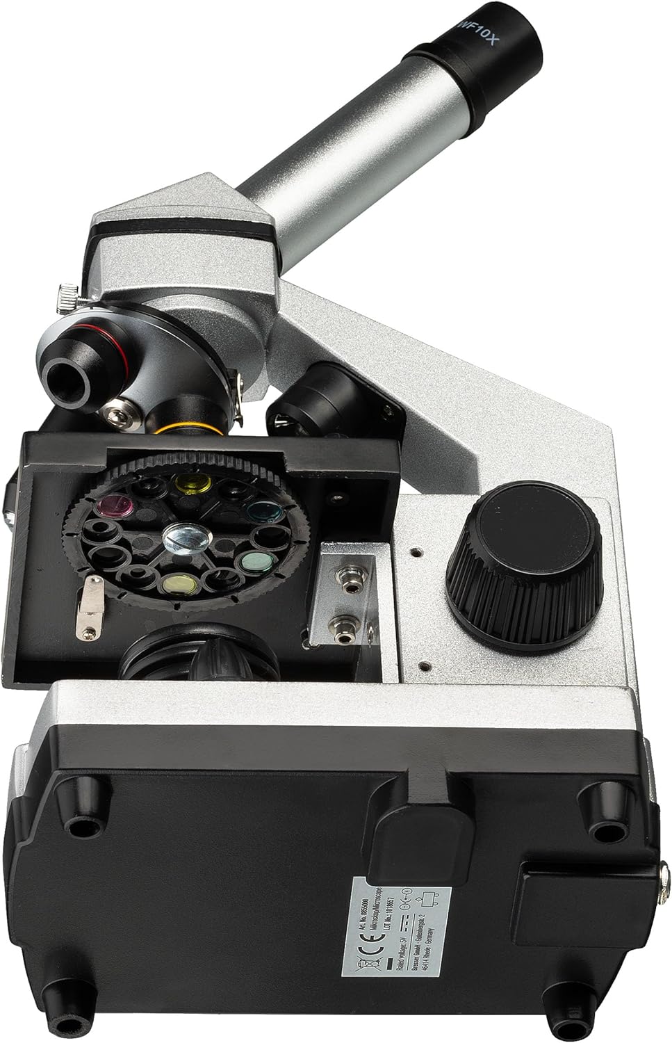 Das hochwertige Einsteigermikroskop im klassischen Design mit LED-Beleuchtung besitzt eine hohe Vergrößerung. Es ist mit einem USB-Okular zum Anschluss an einen PC ausgestattet und ermöglicht erste Einblicke in die Welt Mikroskopie. Die enthaltenen Okulare liefern Vergrößerungen von 40x-1024x und der monokulare Aufsatz ermöglicht den Anschluss einer USB-Okularkamera und die Betrachtung und Bearbeitung am Computer. Die helle LED-Beleuchtung mit Auf- und Durchlicht sorgt für eine optimale Objektausleuchtung und mit dem umfangreichen Zubehör mit vielen Proben können Sie direkt loslegen. Abmessungen: 153x267x100 mm / Gewicht: 2,7 kg; Das Gerät wird über den Netzstecker (enthalten im Lieferumfang) mit Strom versorgt. Lieferumfang: Mikroskop; USB Okular; 5 Objektträger und 5 Deckgläser; Garnelenbrutanlage; Einschlussmittel; Weitfeldokulare; Hartschalenkoffer; Pipette, Pinzette, Mikrotom; Staubschutzhülle; Hefe, Seesalz, Garneleneier; Barlow-Linse; ,Netzteil | قیمت یورویی : 109.9€