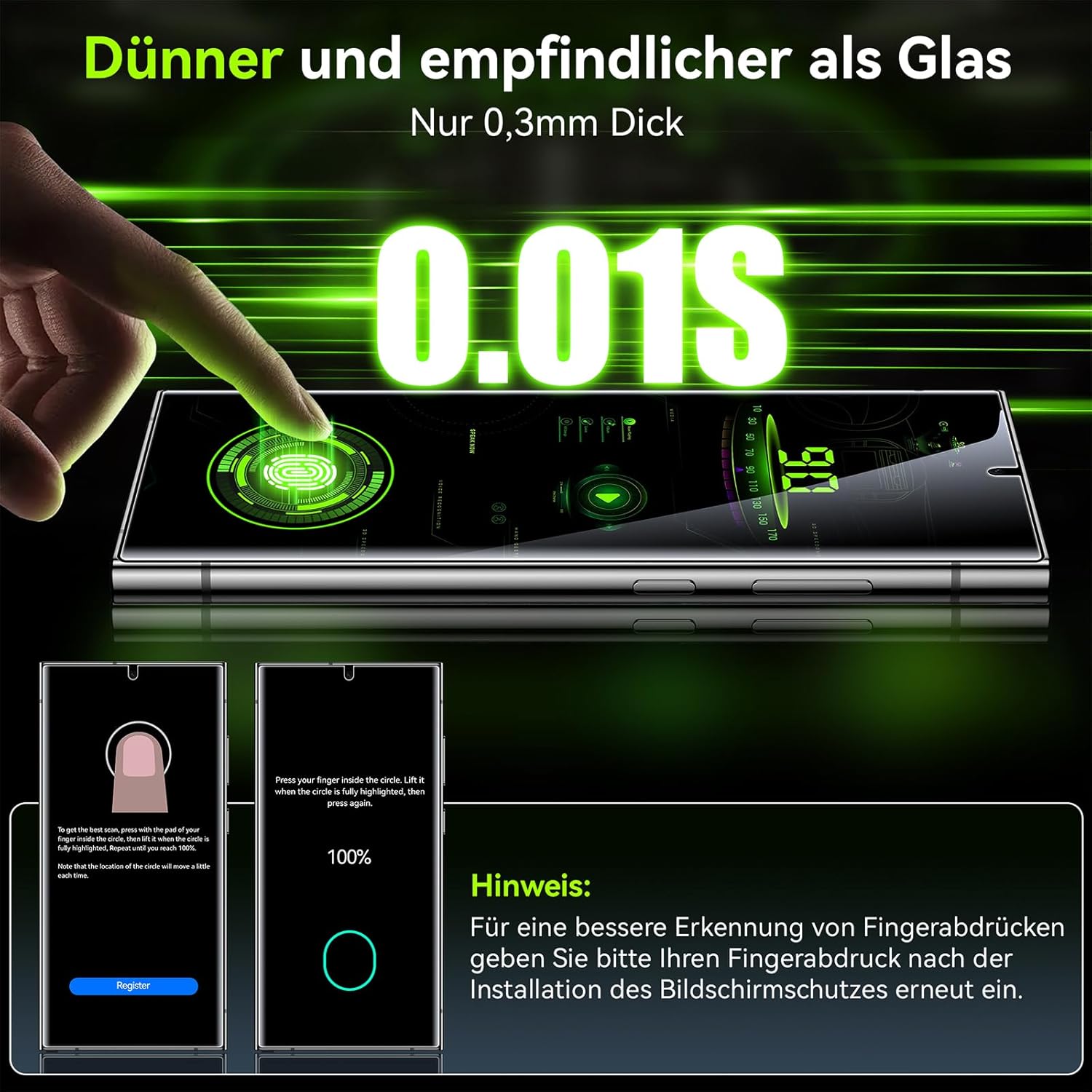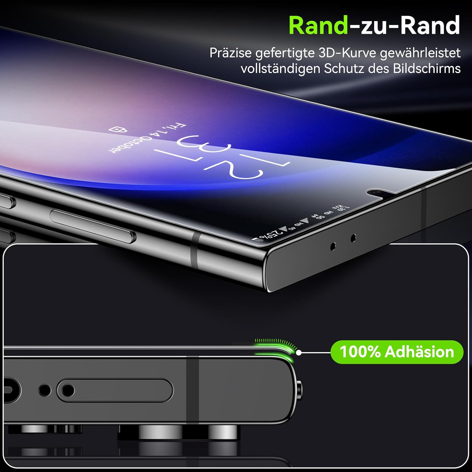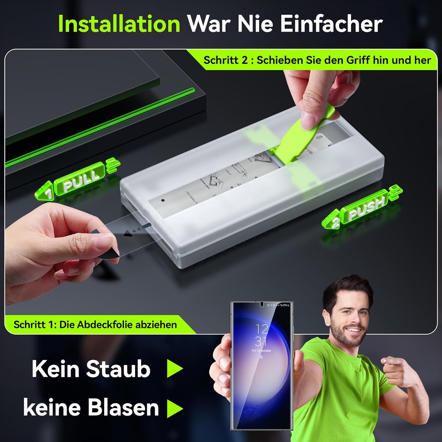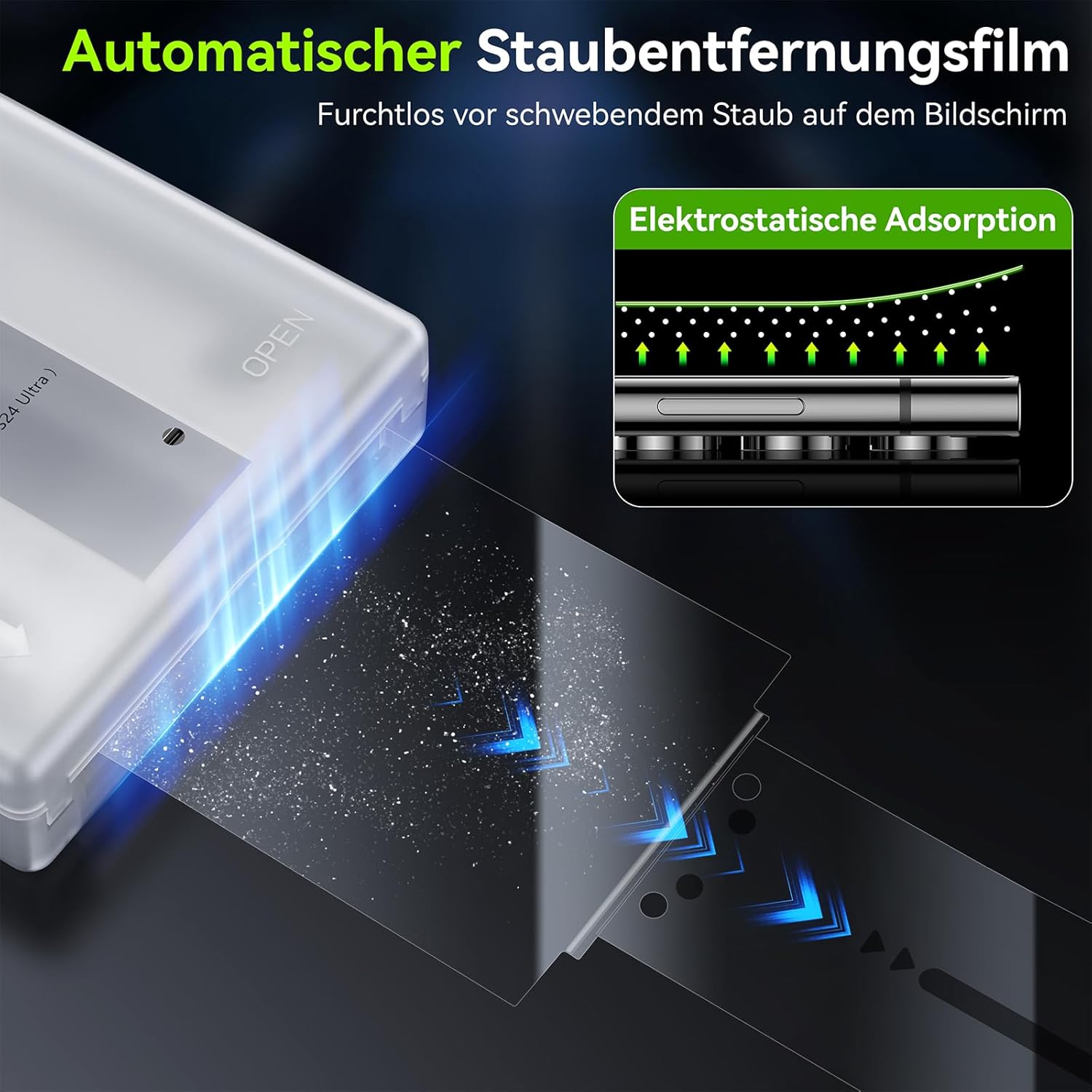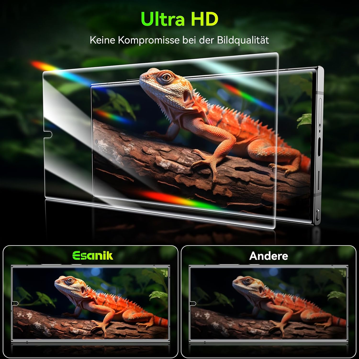 Professionellste Montagebox: Esanik für Samsung Galaxy S22 Ultra/ S23 Ultra Schutzfolie Montagebox nutzt die innovative Technologie von 2024, um eine automatische Ausrichtung zu realisieren - ein Schieben, um die Installation einfach und effizient abzuschließen. Fingerabdruck Unterstützen: Im Gegensatz zu weichen TPU-Materialien (die den Bildschirm nicht schützen) und dickeren Glasmaterialien (Fingerabdruckerkennung ist schwierig), ist die Esanik S22 Ultra/ S23 Ultra Folie spezielle PET-Material sorgt dafür, dass die Fingerabdrücke unserer Produkte besser erkannt werden können, und gleichzeitig erreicht die Härte 7H. 100% Ultra-HD: Esanik PET Panzerfolie ist Kristallklar und mit 99.9% Transparent (Full HD) hergestellt, es verfälscht die Displayfarbe nicht. Die ultradünne Samsung Galaxy S22 Ultra/ S23 Ultra Displayschutzfolie mit einer Dicke von 0,3 mm behält ein "True-to-touch"-Gefühl, hohe Berührungsempfindlichkeit und Unterstützung mit Face ID. Automatische Reparatur & Volle Deckung: Die Esanik S22 Ultra/ S23 Ultra Panzerfolie ist vollständig in 3D gehalten und schützt den gesamten Bildschirm vor Kratzern durch Münzen, Schlüssel oder andere harte Gegenstände. Die Oberfläche der Folie verfügt über eine automatische Reparaturfunktion, gewöhnliche Kratzer können nach 24 Stunden automatisch repariert werden. Was ist enthalten: 2 Stück S22 Ultra/ S23 Ultra PET Folien, 2x Reinigungsset, 1x Autom Montagerahmen | قیمت یورویی : 16.96€