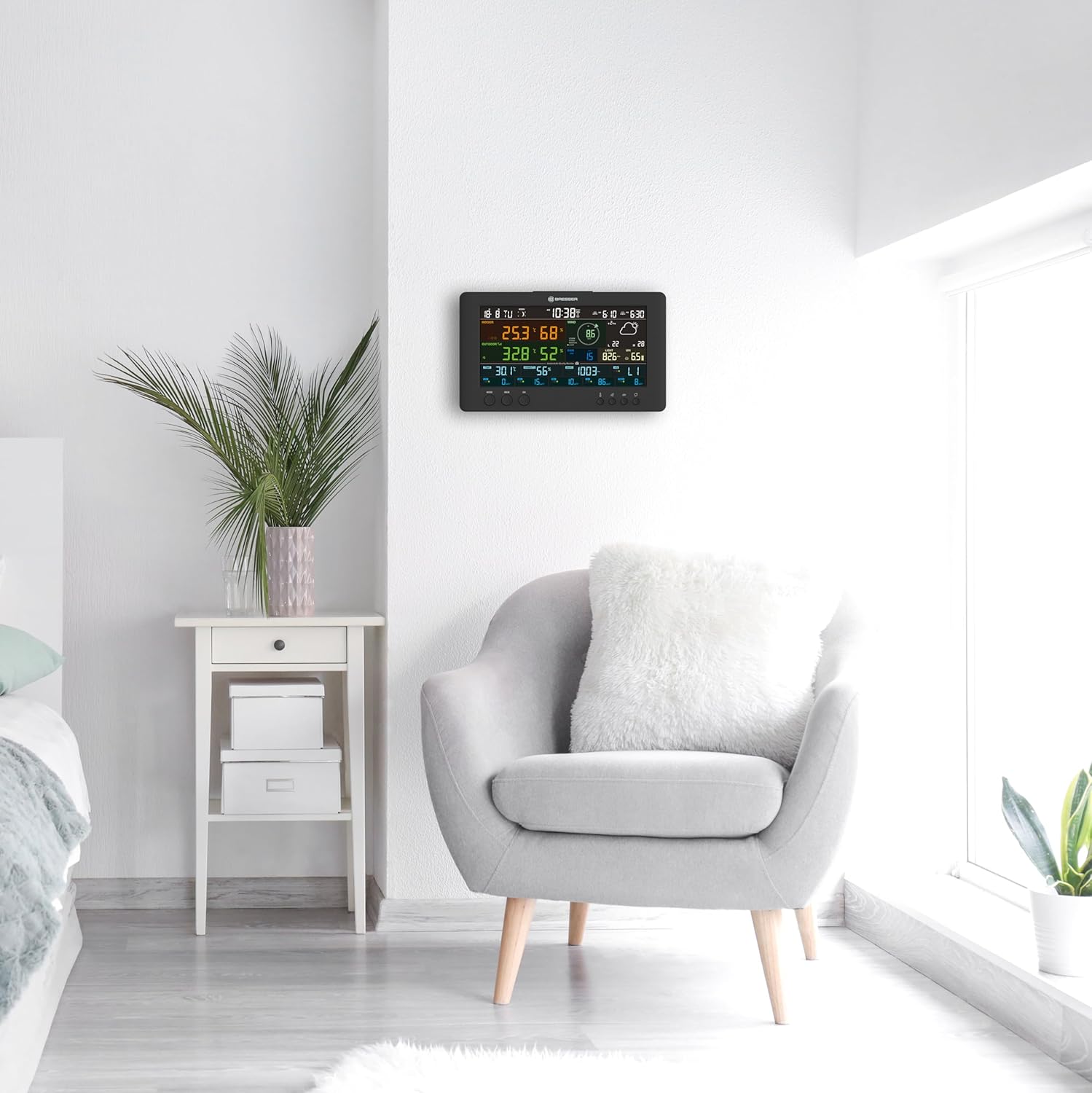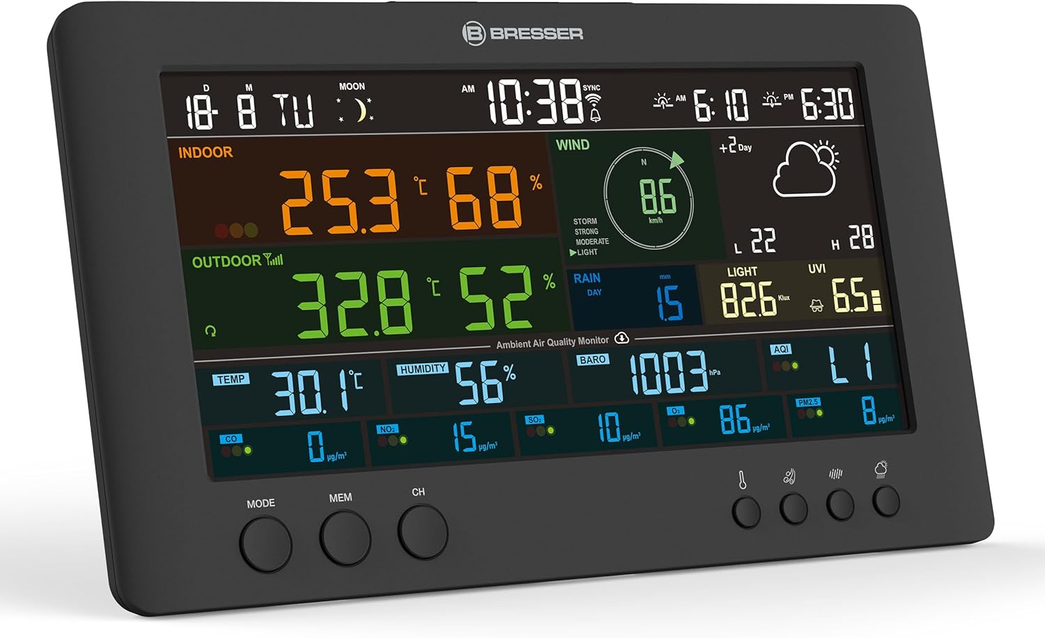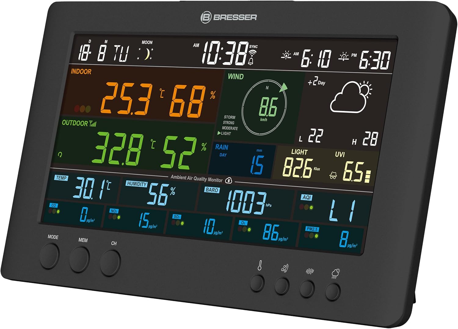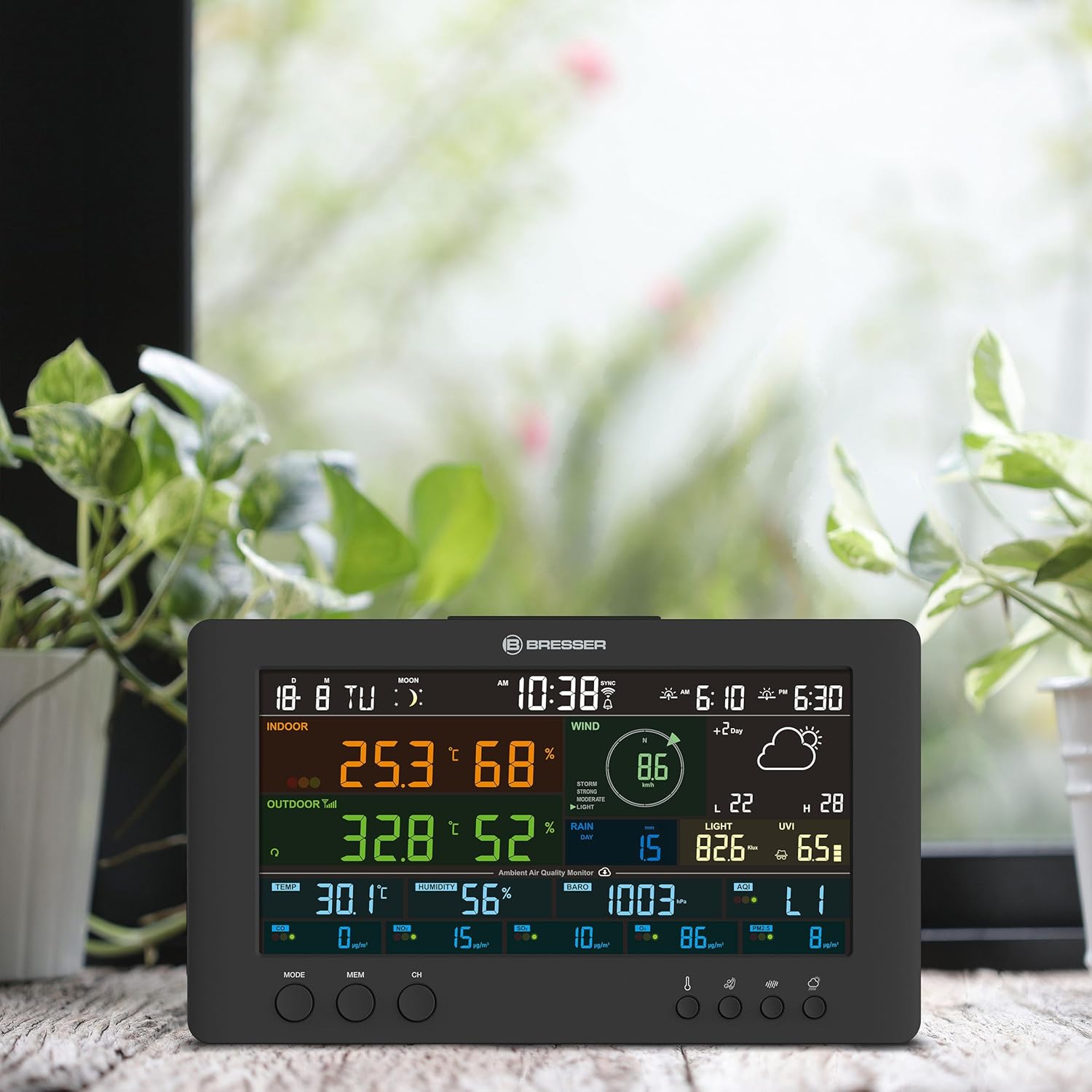 مرکز هواشناسی هفت کاره Bresser مدل Air-Mon: ایستگاه هواشناسی با وایفای، مانیتور کیفیت هوا، اپلیکیشن، صفحه نمایش رنگی، پیشبینی ۷ روزه، حسگر دما و رطوبت، فشارسنج، سطح اشعه ماوراء بنفش، نشانگر سطح آسایش