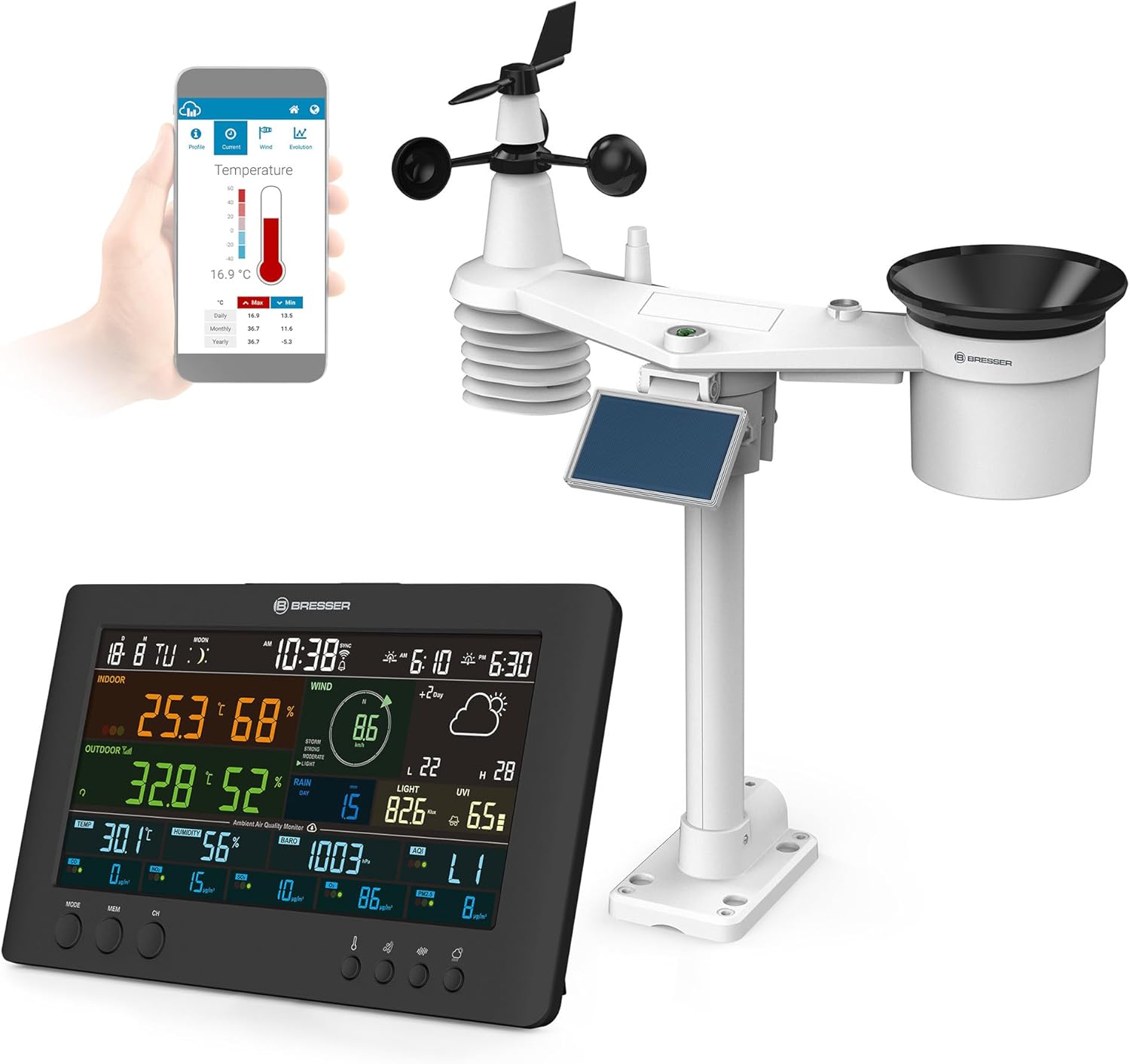 Bresser 7-in-1 Wetter Center Air-Mon: Wetterstation mit WLAN, Luftqualitätsmonitor, App, Farbdisplay, 7-Tage-Vorhersage, Thermo-Hygrosensor, Barometer, UV-Level, Komfortlevel-Ampel لینک آمازون : https://www.amazon.de/dp/B0BBVM73BX?th=1&psc=1 نظارت جامع بر آب و هوا: اندازهگیری دما، رطوبت، سرعت/جهت باد، بارندگی، میزان اشعه ماوراء بنفش، شدت نور و فشار هوا. نظارت پیشرفته بر کیفیت هوا: شاخص کیفیت هوای محلی (AQI) و آلایندههای اصلی (PM2.5، PM10، NO2، SO2، O3، CO) را با نشانگر سطح آسایش نمایش میدهد. پیشبینی آب و هوای ۷ روزه: پیشبینیهای دقیق و قابل اعتماد آب و هوا را برای ۷ روز، از جمله بالاترین و پایینترین دما، ارائه میدهد. قابلیت ارتقا: سازگار با سنسورهای اضافی (شامل نمیشود) برای نظارت سفارشی، از جمله سنسورهای ترمو-رطوبت، خاک، استخر، PM2.5/10، CO2 و HCHO/VOC. رابط کاربرپسند: دارای صفحه نمایش رنگی، اتصال Wi-Fi برای دسترسی از راه دور به دادهها و ادغام با برنامه ProWeatherLive برای بهروزرسانیهای لحظهای در هر مکان.