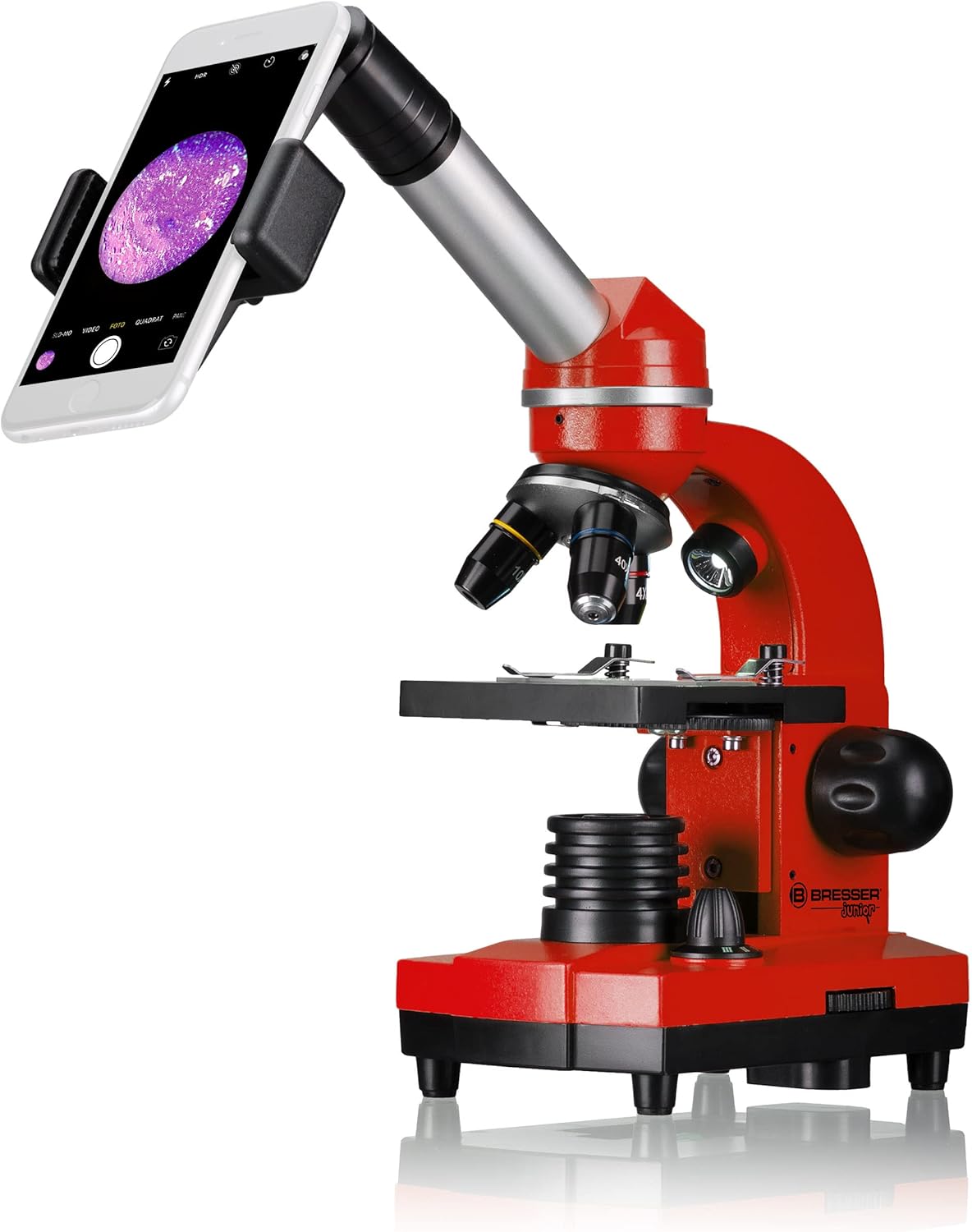 Bresser Junior Schülermikroskop BIOLUX SEL mit Smartphonehalter, reichhaltigem Zubehör und Barlow-Zoom-System für Kinder, Einsteiger und Erwachsene, rot Rot Single | قیمت یورویی 73.69€