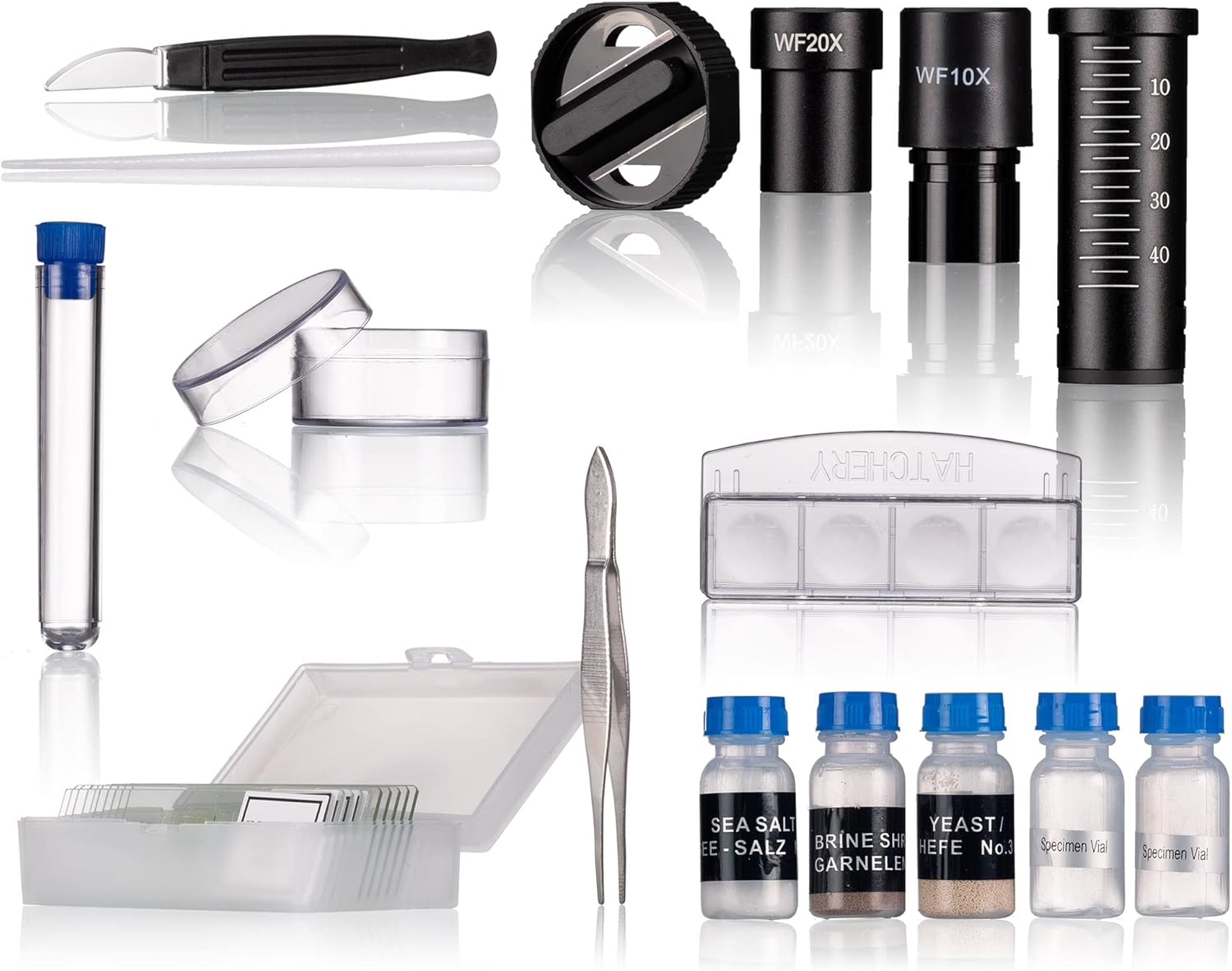 Das hochwertige Mikroskop mit LED-Beleuchtung, einer hohen Vergrößerung und seinem umfangreichem Zubehör ist ideal zum Einstieg in die Welt der Mikroskopie. Dank der batteriebetriebenen Beleuchtung eignet es sich für den mobilen Einsatz. Auf dem höhenverstellbaren Objekttisch werden die Untersuchungsobjekte mit der regelbaren Durchlicht- und Auflicht-Beleuchtung optimal ausgeleuchtet und mit den enthaltenen Okularen können bis 1600-fache Vergrößerungen erzielt werden Die Barlow-Zoom-System ermöglicht stufenloses Zoomen und mit dem enthaltenen Smartphone-Adapter können Sie eigene Bilder von den untersuchten Objekten machen. Das Zubehör enthält neben dem Präparierbesteck auch erste Proben, um direkt loszulegen Lieferumfang: Mikroskop; 2 Weitfeld-Okulare: 10x und 20x; 3 Objektive: 4x, 10x und 40x; Barlow-Linse mit bis zu 2-facher Vergrößerung; Mikroskopierbesteck; Hefe, Seesalz, Garneleneier, Garnelenbrutanlage, Microcut-Mikrotom; leere Objektträger und Deckgläser; Dauerpräparate; Smartphone-Adapter Lieferumfang: Mikroskop, 2 Weitfeld-Okulare: 10x und 20x, 3 Objektive: 4x, 10x und 40x, Barlow-Linse mit bis zu 2-facher Vergrößerung, Mikroskopierbesteck, Hefe, Seesalz, Garneleneier, Garnelenbrutanlage, Einschlussmittel (Gum Media), Microcut-Mikrotom, leere Objektträger und Deckgläser, Dauerpräparate, Smartphone-Adapter | قیمت یورویی : 73.69€