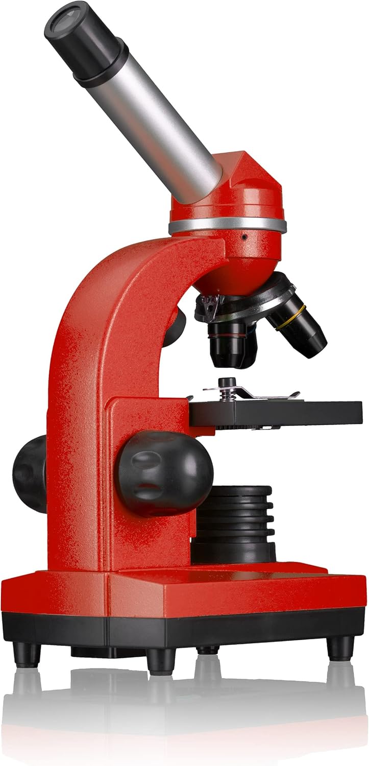 میکروسکوپ دانشآموزی Bresser مدل BIOLUX SEL به همراه پایه گوشی هوشمند، لوازم جانبی گسترده و سیستم زوم بارلو برای کودکان، مبتدیان و بزرگسالان، تک رنگ قرمز