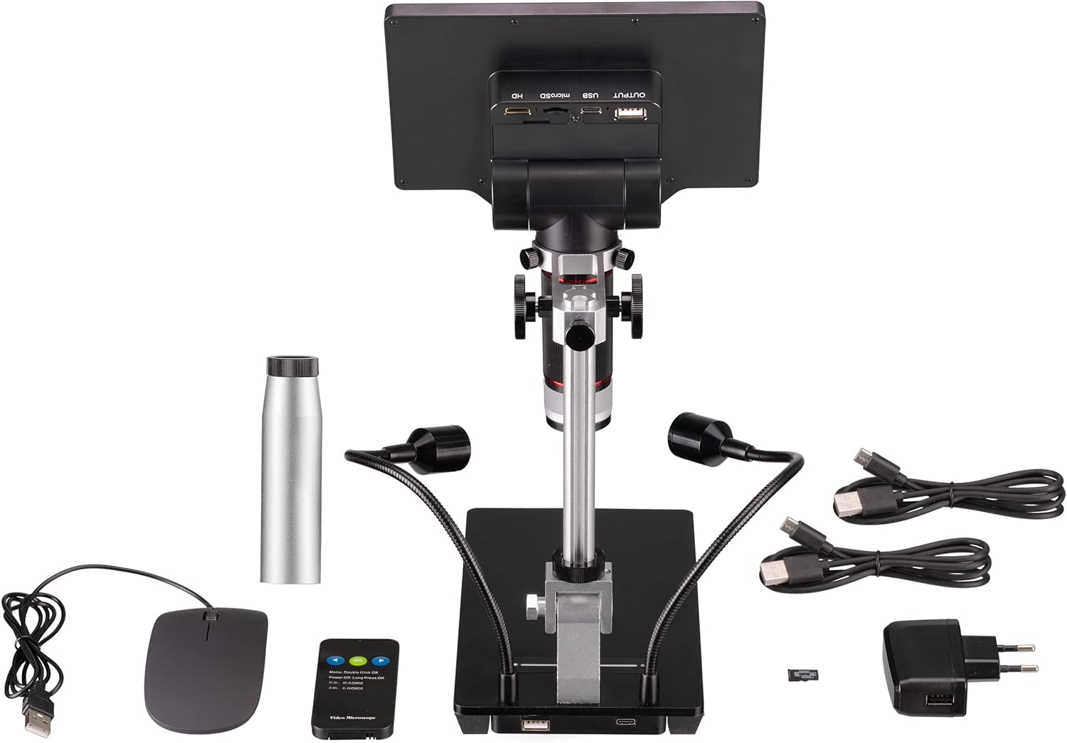 Werkstattmikroskop mit Ringlicht, 2 Schwanenhals-LEDs, HD-Zoom-Objektiv Vergrößerung auf integriertem Bildschirm: 2x – 44x, je nach Konfiguration Digitaler Zoom: 1x – 16x; drehbarer Zoomring zur präzisen Fokussierung Maße: 174 x 129 x 51 mm; Gewicht: 270 g Lieferumfang: Mikroskop, Stand, Verlängerung für Stand, 2x USB-Kabel, HDMI-Kabel, Fernbedienung, Maus, Netzteil 5V 1A, Anleitung | قیمت یورویی : 279.99€