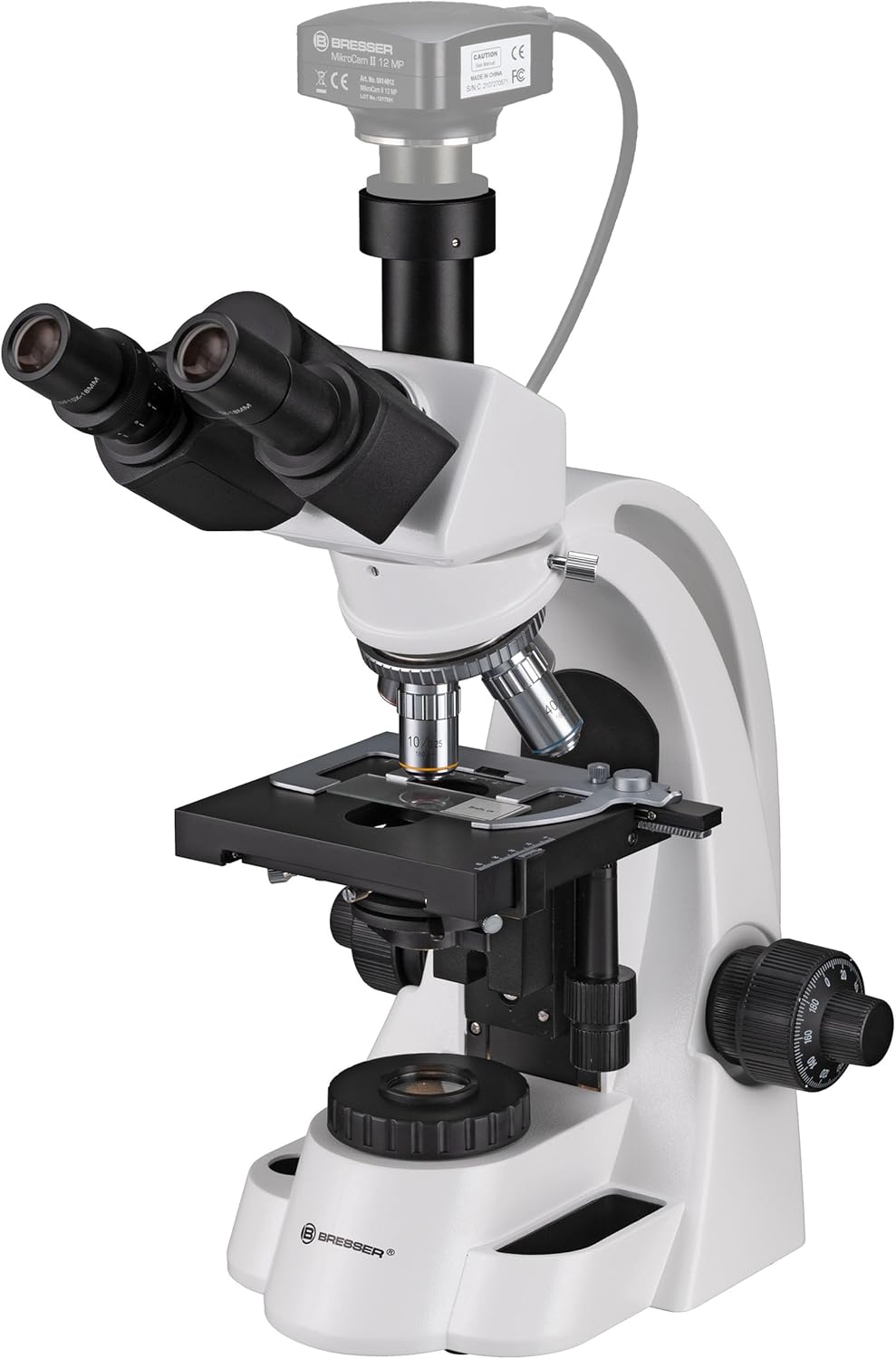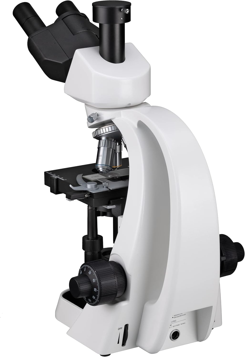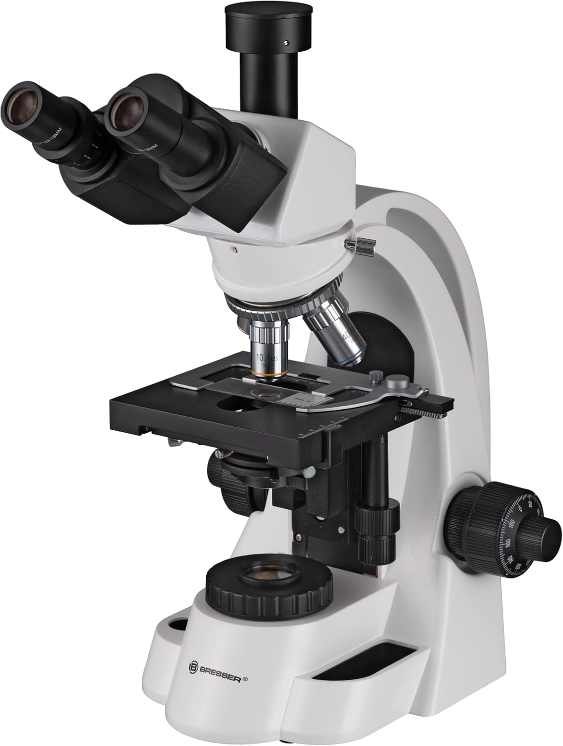 Bresser trinokulares Durchlicht Mikroskop BioScience Trino 40x-1000x Vergrößerung, mit Köhlerscher Beleuchtung, koaxialem Kreuztisch sowie Grob und Feinfokussierung, für gehobene Ansprüche, 5750600 Single لینک آمازون : https://www.amazon.de/dp/B002LIKIWY?th=1&psc=1 یک میکروسکوپ بسیار با کیفیت با سر سه چشمی، پایه مکانیکی با مقیاس ورنیه و عدسیهای شیئی نیمهصفحهای برای کاربران پیشرفته. نور عبوری از LED قابل تنظیم است و برای میکروسکوپی میدان تاریک مناسب است. اپتیکها بزرگنمایی ۴۰ تا ۱۰۰۰ برابر را ارائه میدهند و کندانسور قابل تنظیم، روشنایی بهینه جسم را تضمین میکند. اجسام را میتوان با استفاده از دکمههای تنظیم دقیق و درشت، دقیقاً روی صفحه مکانیکی هم محور تراز کرد. سر سه چشمی امکان اتصال یک میکروکم را فراهم میکند. فاصله بین مردمکهای قابل تنظیم و جبران دیوپتر از ویژگیهای استاندارد هستند. از دیگر ویژگیهای آن میتوان به کندانسور Abbe با نگهدارنده فیلتر و دیافراگم عنبیه و طیف گستردهای از لوازم جانبی اشاره کرد. ابعاد: ۳۷۷x۲۵۰x۴۲۲ میلیمتر / وزن: ۷.۹ کیلوگرم؛ کارکرد از طریق منبع تغذیه (همراه با بستهبندی) محتویات بسته: میکروسکوپ؛ پوشش گرد و غبار؛ ۲ عدد عدسی چشمی؛ ۴ عدد عدسی شیئی؛ ۱ عدد کندانسور؛ روغن ایمرسیون؛ منبع تغذیه ۲۳۰ ولت (۱۲ ولت / ۳ آمپر)؛ دفترچه راهنما