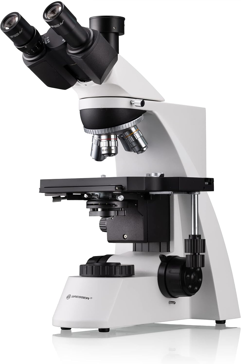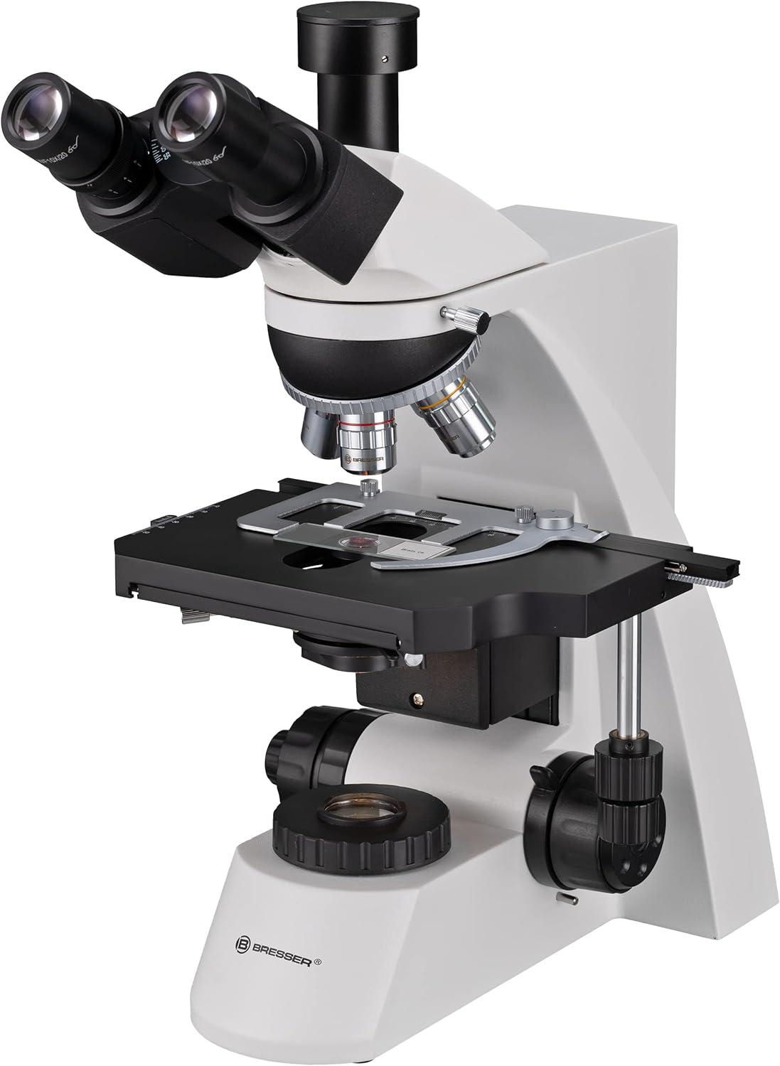 میکروسکوپ نوری عبوری سه چشمی Bresser مدل Science TRM-301 Trino با بزرگنمایی 40-1000 برابر، عدسیهای شیئی مسطح، نورپردازی Köhler، پایه مکانیکی کواکسیال و لوله نوری، برای کاربردهای حرفهای (تکی)
