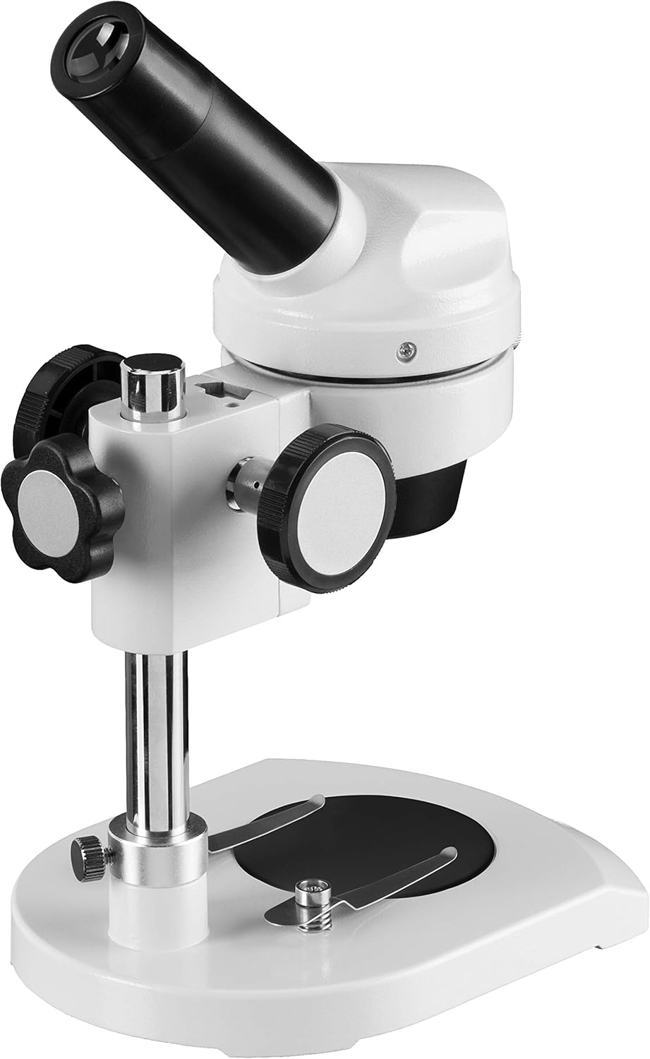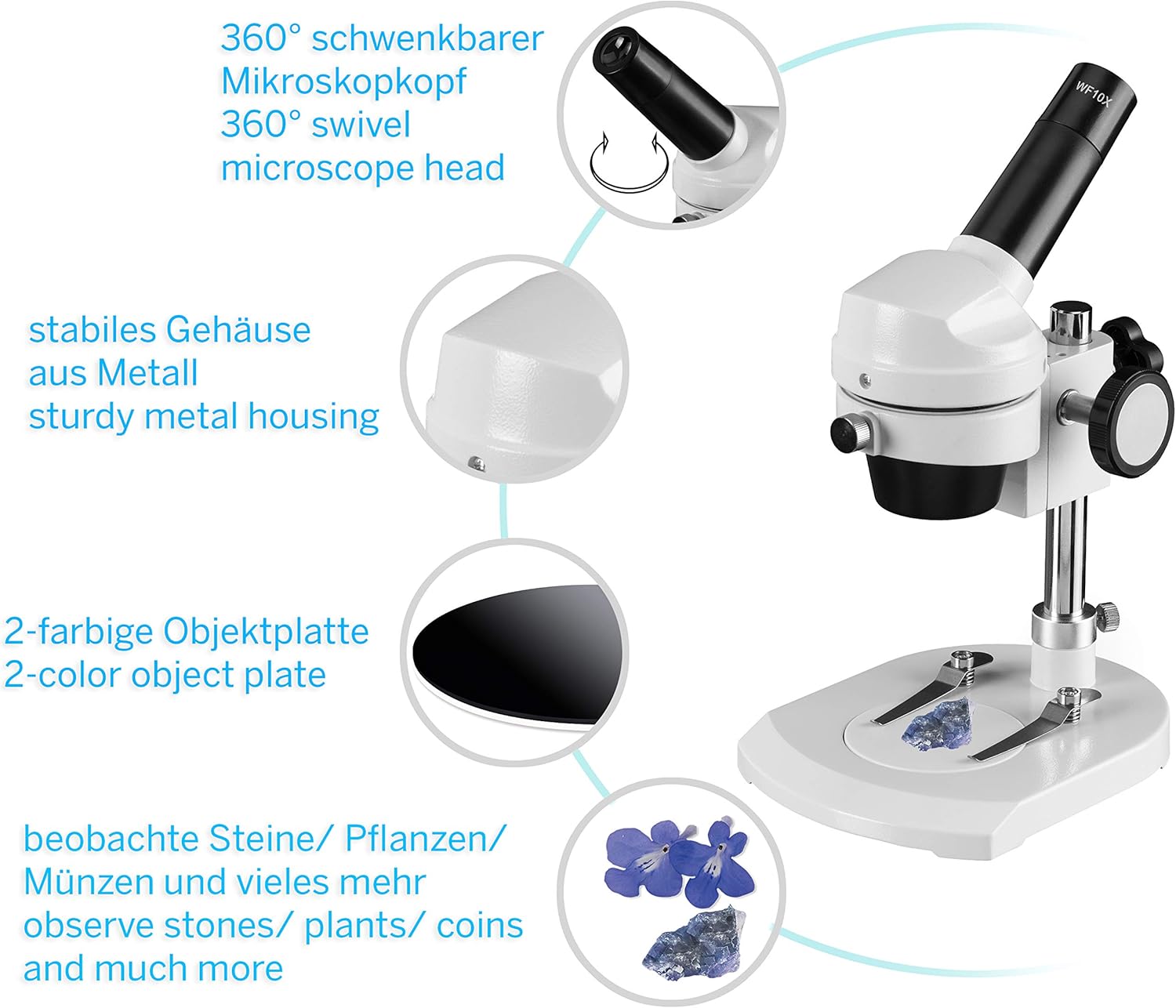 Das Junior Stereomikroskop mit einer bis zu 20x Vergrößerung und Auflicht-Beleuchtung ist optimal um große Gegenstände zu untersuchen. Der robuste Metallkörper sorgt für einen festen Stand. Der Mikroskopkopf mit monokulare Einblick ist um 360° drehbar und ermöglicht eine angenehme Objektbetrachtung. Durch die schwarz/weiße Objektplatte können helle, wie auch sehr dunkle Objekte betrachtet werden. Der großzügige Arbeitsabstand erlaubt die Untersuchung von Objekten mit einer Größe von bis zu 80 mm. Das Mikroskop eignet sich hervorragend um alltägliche Dinge perfekt zu beobachten und bis zu 20x zu vergrößern. Abmessungen: 160x110x210 mm / Gewicht: 860 g Lieferumfang: Mikroskop; zweifarbige Objekplatte; Anleitung | قیمت یورویی : 69.24€
