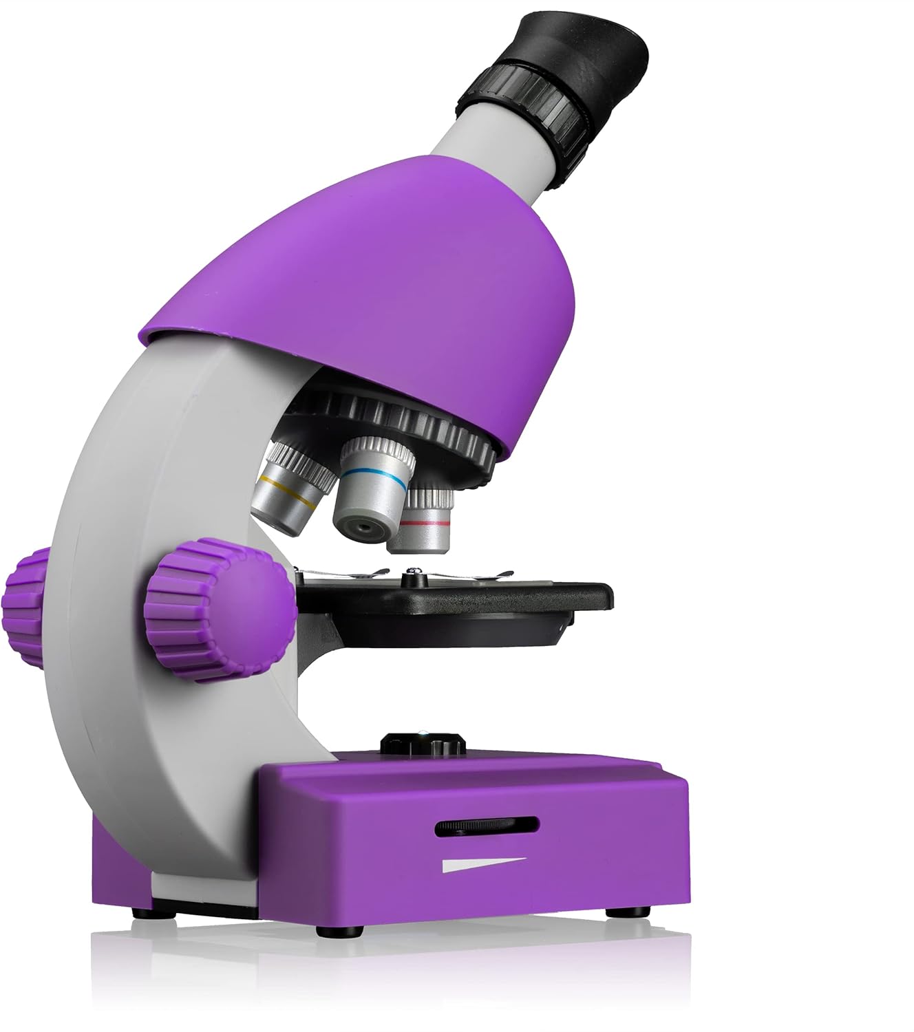 میکروسکوپ Bresser Junior Beginner 40-640x با نورپردازی LED عبوری و 3 عدسی شیئی، شامل لوازم جانبی گسترده مانند اسلایدهای آماده، لامها و ابزارهای میکروسکوپی، بنفش (تکی)