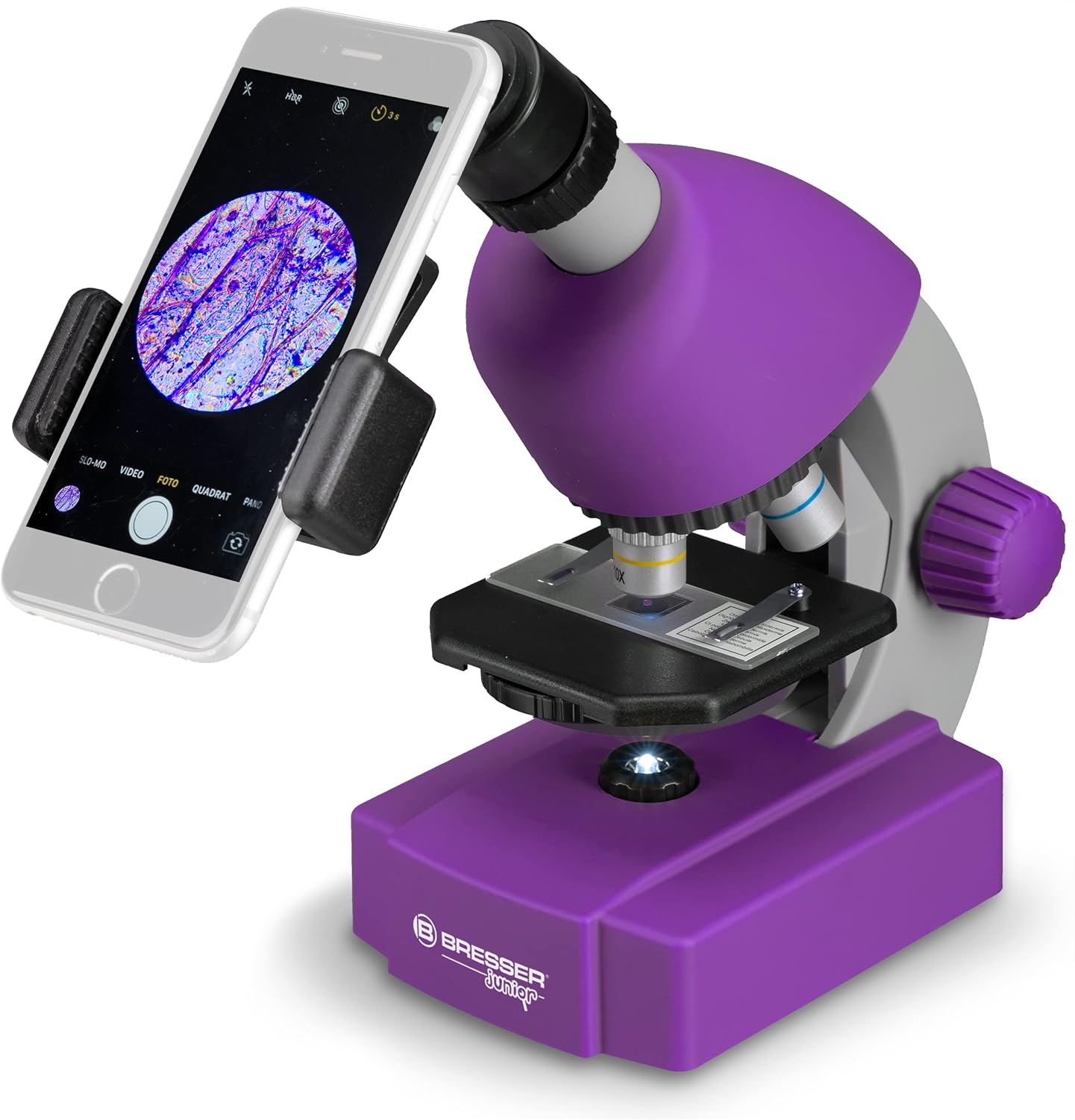 Bresser Junior Einsteiger Mikroskop 40-640x mit Durchlicht LED-Beleuchtung und mit 3 Objektiven, inklusive umfangreichem Zubehör wie Dauerpräparaten, Objektträgern und Mikroskopierbesteck, lila Lila Single | قیمت یورویی 39.9€