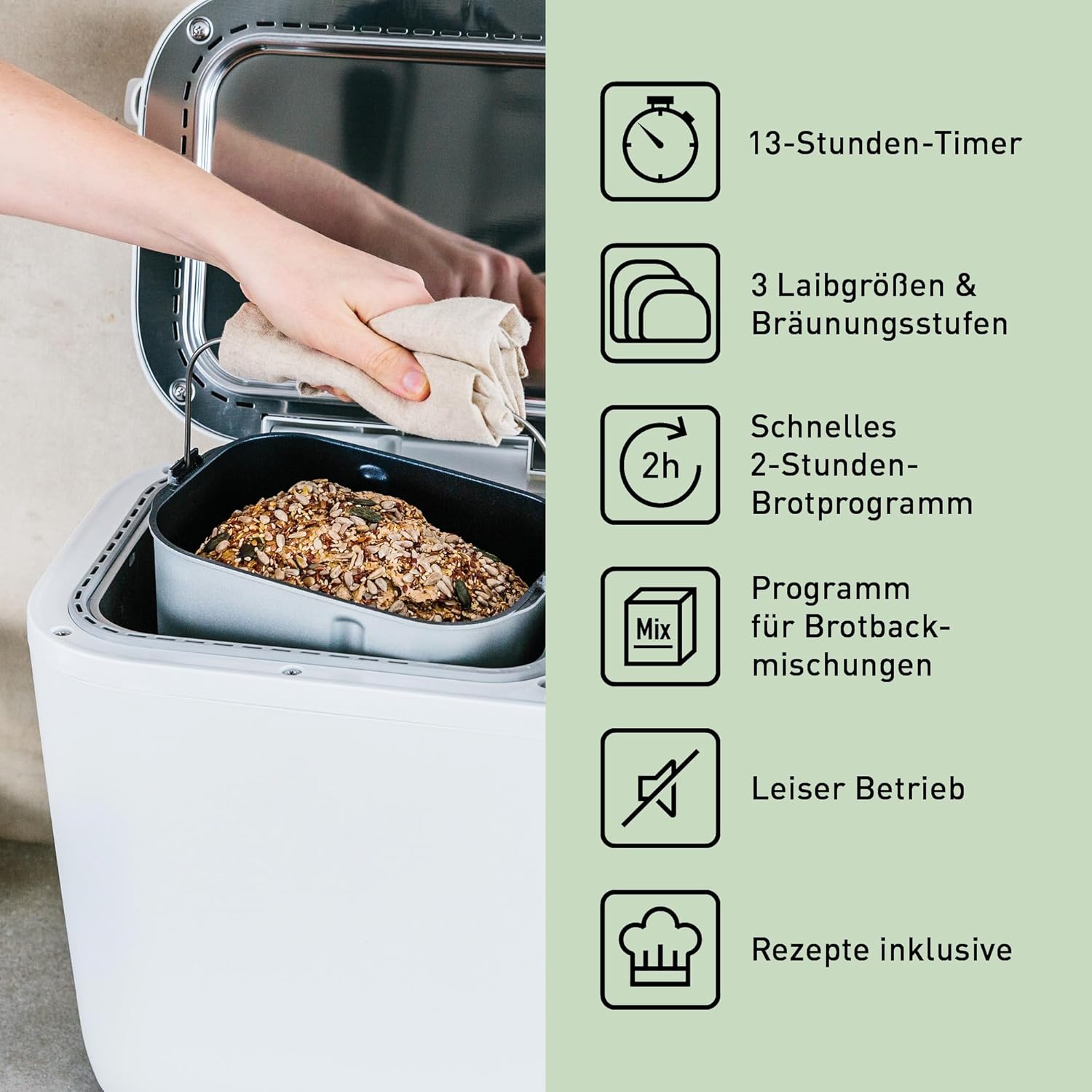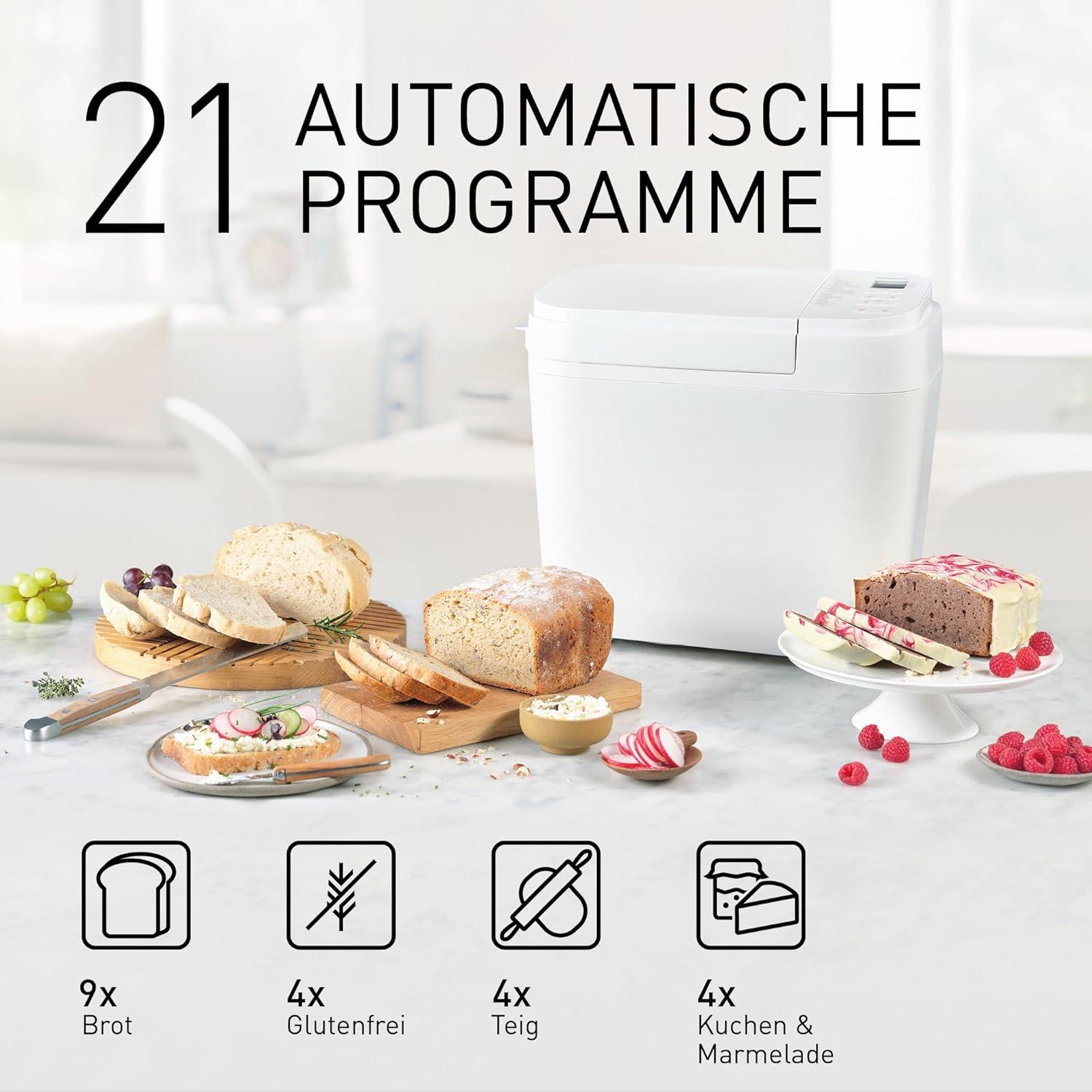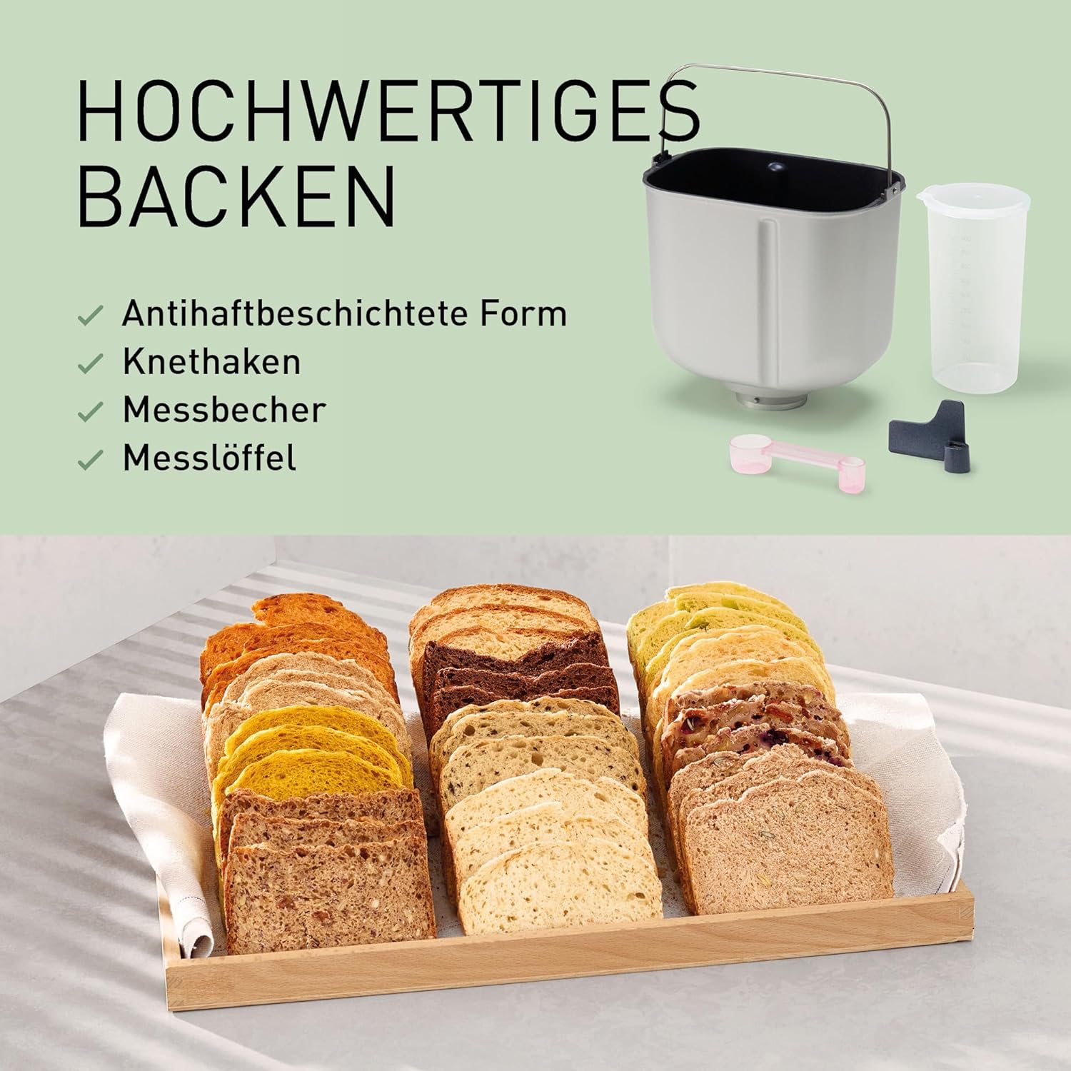2 TEMPERATURSENSOREN: Dieser Brotbackautomat verfügt über 2 integrierte Sensoren zur Bestimmung der Innen- und Außentemperatur, um jedes Programm zu optimieren und Ihnen die bestmögliche Brotqualität zu bieten KNETEN NACH HANDWERKLICHER ART: Dieser Brotbackautomat verfügt über einen innovativen Knethaken mit speziell platzierten Lamellen in der Backform, um Handkneten nachzuahmen und Ihnen jedes Mal das beste Brot mit der idealen Textur zu servieren AUTOMATIKPROGRAMME: 21 automatische Programme wie Vollkorn, Brioche, Kuchen und Pizza erleichtern das Backen – einfach Wasser zur Brotmischung hinzufügen und voilà! GLUTENFREIES BACKEN: Dieser Brotbackautomat bietet Ihnen 4 benutzerfreundliche Automatikprogramme für köstliches glutenfreies Brot, Kuchen, Pizzateig und Nudelteig ZEITVORWAHL: Lassen Sie sich jeden Morgen vom verlockenden Duft von frisch gebackenem Brot wecken – einfach abends die Zutaten hinzufügen und den Timer auf den nächsten Morgen einstellen (bis 13 Stunden im Voraus) | قیمت یورویی : 151.8€