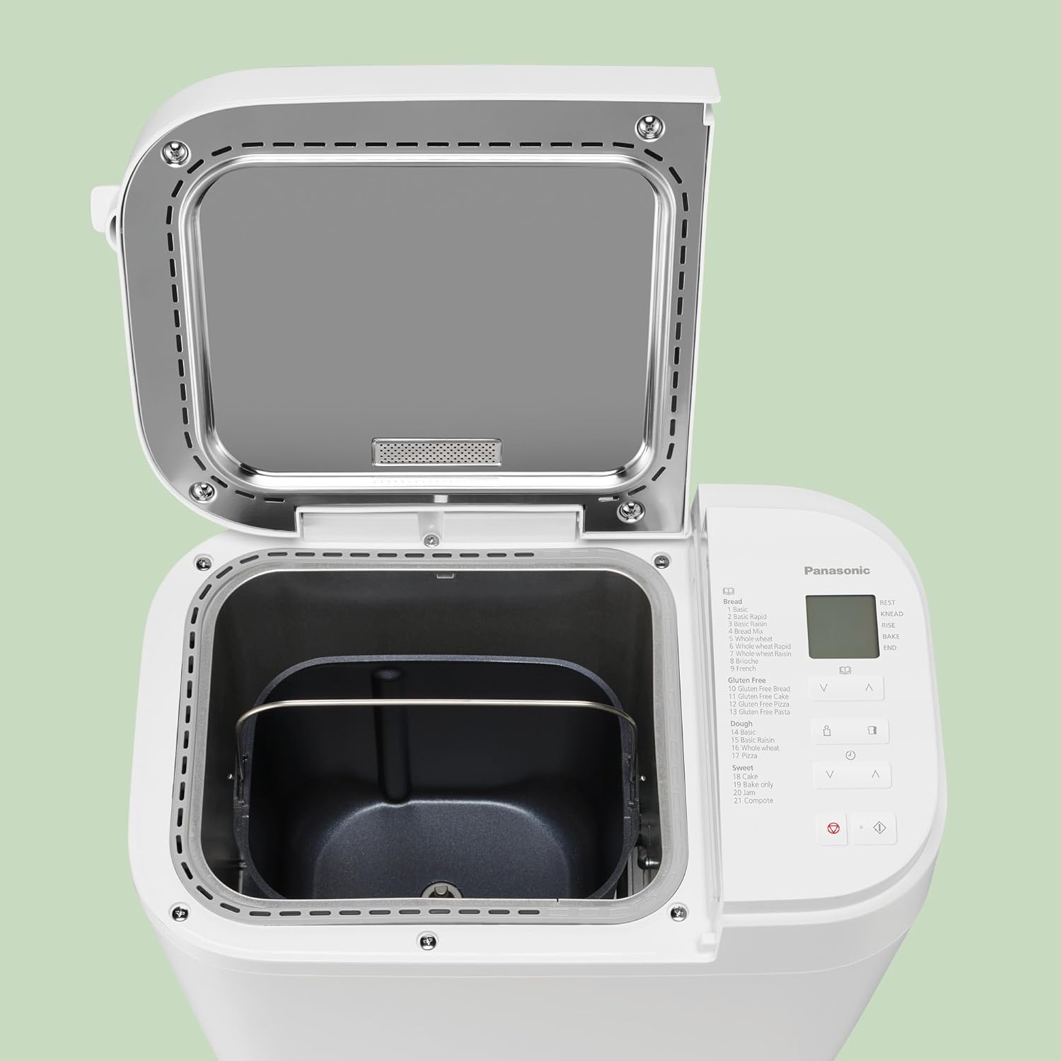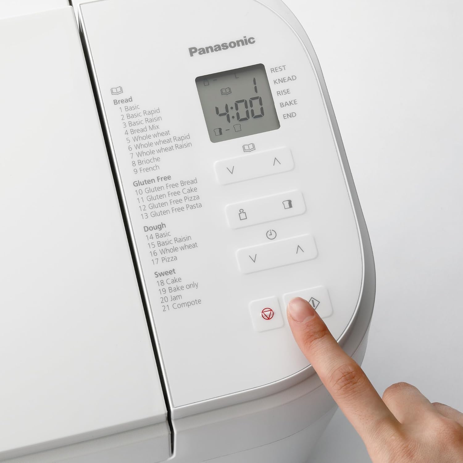 Panasonic SD-B2510W Vollautomatischer Brotbackautomat, 4 glutenfreie Programme, horizontales Design, 21 automatische Programme, 2 Temperatursensoren, 13 Stunden Zeitvorwahl, LCD-Display, Weiß
