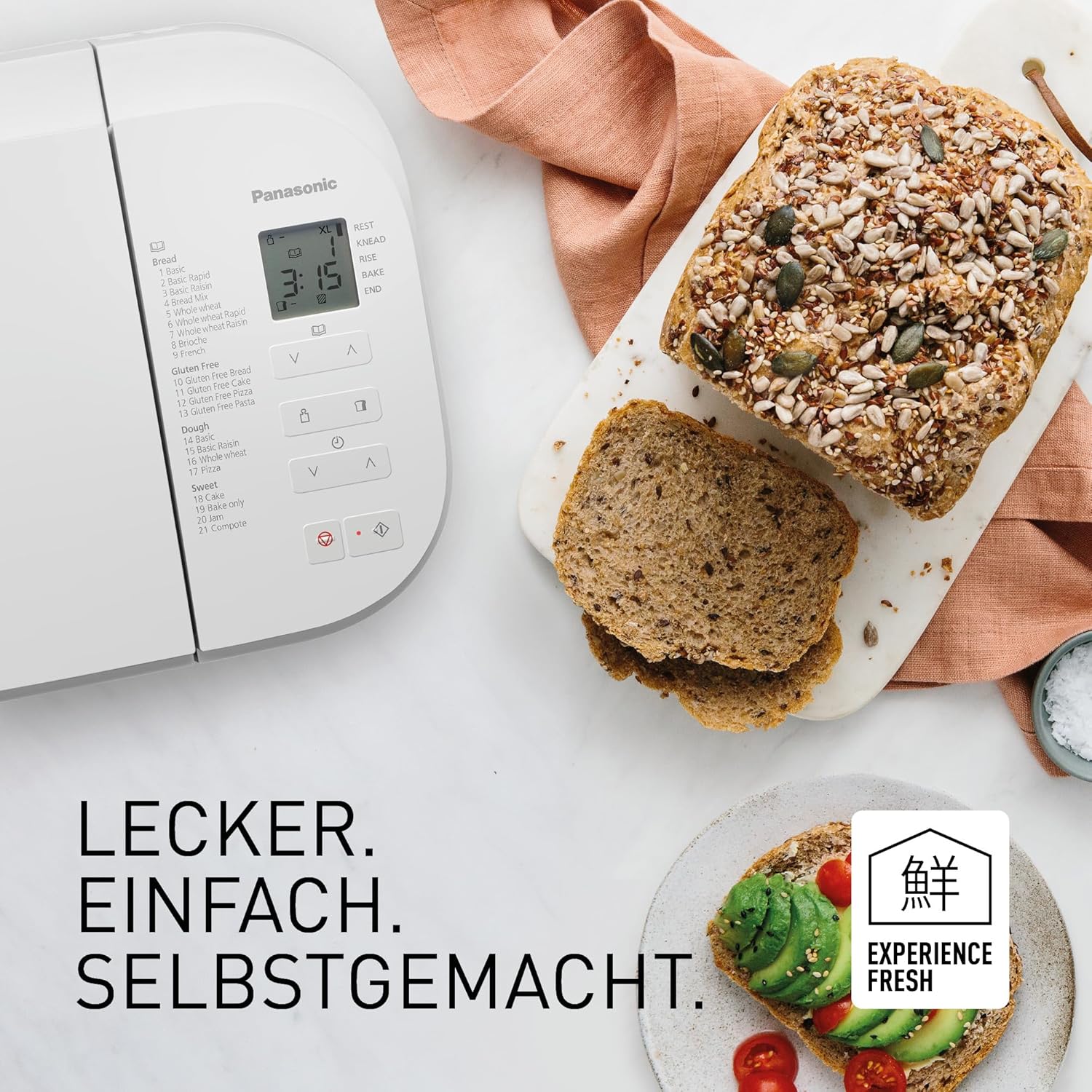 Panasonic SD-B2510W Vollautomatischer Brotbackautomat, 4 glutenfreie Programme, horizontales Design, 21 automatische Programme, 2 Temperatursensoren, 13 Stunden Zeitvorwahl, LCD-Display, Weiß | قیمت یورویی 151.8€
