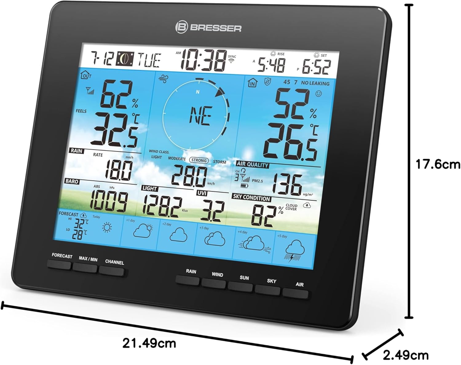 نمایشگر رنگی مرکز آب و هوای Bresser مدل 7003210 با قابلیت نمایش وضعیت آب و هوای اتاق به صورت 6 روزه و 4CAST به همراه نشانگر دمای اتاق و ساعت زنگ دار یکپارچه با قابلیت هشدار یخ زدگی، پایه جایگزین، پایه جایگزین تکی