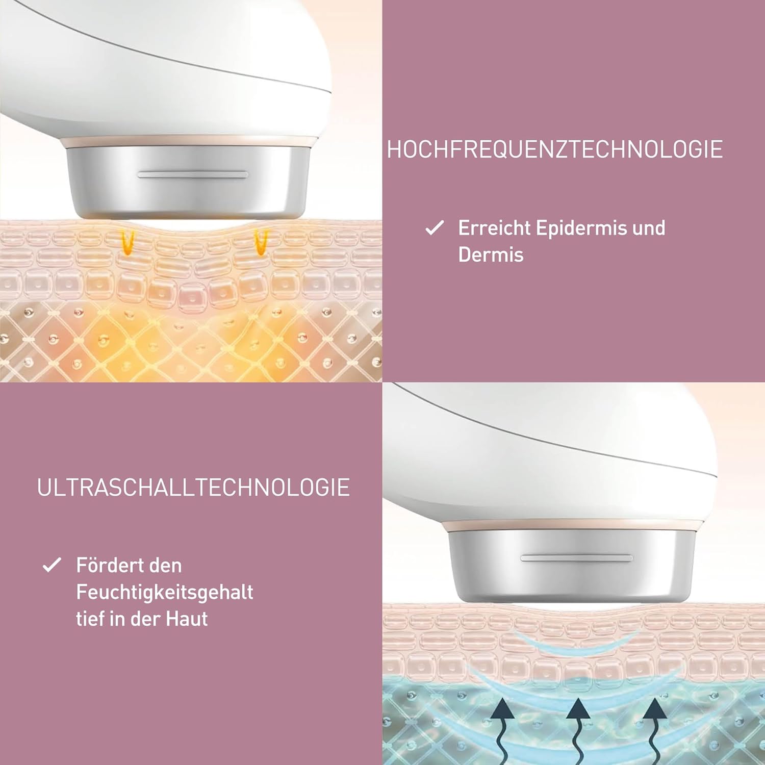 Die Kombination aus Radiofrequenz- und Ultraschalltechnologie ermöglicht eine Gesichtsbehandlung wie im Kosmetikstudio - für eine spürbare Hautstraffung und sichtbare Glättung. Die Radiofrequenz-Technologie erwärmt die Dermis und stimuliert so die Produktion von Kollagen. Dies erhöht die Elastizität der Haut - für straffere Haut und geglättete Falten, speziell auf der Stirn. Kombination aus Radiofrequenz- und Ultraschalltechnologie: Mit 1 Million Ultraschall-Mikrovibrationen pro Sekunde wird die Haut sanft massiert. Das verbessert den Feuchtigkeitsgehalt der Haut und lässt sie frischer und praller wirken. Anwendungsbereiche: Die Kombination aus RF- und Ultraschalltechnologie eignet sich speziell für Fältchen der Mund-, Wangen- und Augenpartie. Der Radiofrequenz-Modus wirkt gezielt gegen Stirnfalten. Im Lieferumfang ist das leitende Ultraschallgel EH-4R02 enthalten, welches die Haut optimal auf die Anwendung vorbereitet und die Ultraschallwellen besonders gut in die Haut eindringen lässt. | قیمت یورویی : 345.99€