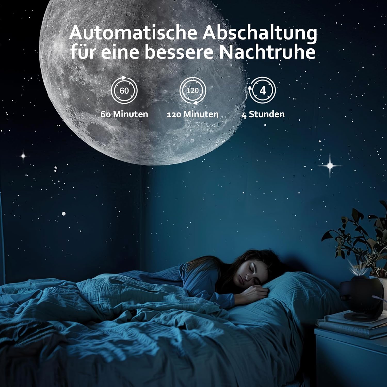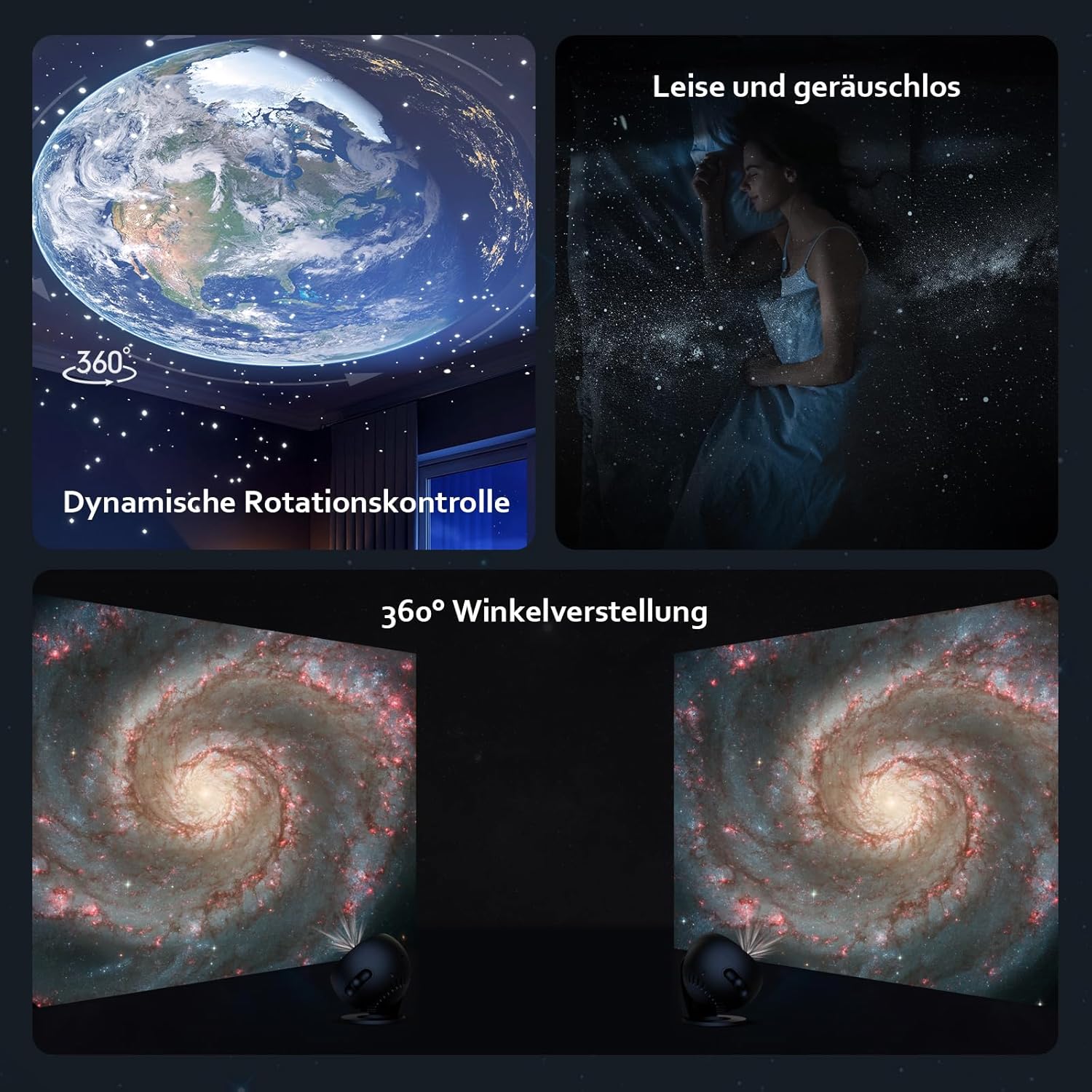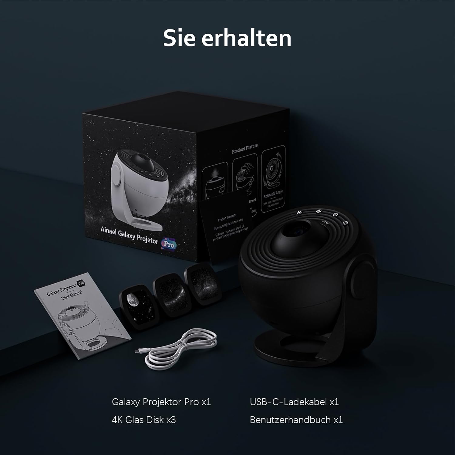 Upgraded Galaxy Projector Pro: Mit der aufgerüsteten 5K-Ultra-HD-Projektionstechnologie und hochpräzisen Glasfolien bietet dieser Sternenprojektor einen klareren und atemberaubenderen visuellen Effekt, der eine breitere und immersivere Szene erschafft, die Sie fühlen lässt, als wären Sie im Universum. Perfekt für Schlafzimmerdecken, Heimkinos und Entspannungsbereiche – er bringt ein unvergleichliches interstellares Abenteuer direkt in Ihr Zuhause! 5K HD Glas Scheiben: Der Galaxy Projektor enthält 3 ultra klare 5K Glasfolien, wechseln Sie mühelos zwischen Sternenhimmel, Mond und Galaxie für ein planetariumähnliches Sternenhimmel Erlebnis; Dieser Planetarium Projektor ist mit den thematischen Filmsätzen unseres Shops kompatibel und bietet endlose kosmische Abenteuer! Schlafhilfe Galaxy Star Projector: Mit 1-Stunden-, 2-Stunden-Timern und 4-Stunden-Auto-Abschaltung, und bietet verstellbare schnelle und langsame Rotationsgeschwindigkeiten; Dank ultra-leiser <20dB-Technologie sorgt er für eine ruhige Schlafumgebung. Der 360° verstellbare Projektionswinkel ermöglicht es Ihnen, Ihren sternenklaren Himmel individuell anzupassen – perfekt als Nachtlichthimmel für Kinder oder beruhigender Begleiter für Erwachsene. Das perfekte Geschenk: Ideal für Geburtstage, Weihnachten, Jubiläen und besondere Anlässe – dieser Weltraumprojektor verwandelt jeden Raum in ein atemberaubendes, sternenübersätes Spektakel. Er ist ein beruhigendes Nachtlicht für Kinder, ein unterhaltsames Lernwerkzeug für die Eltern-Kind-Bindung und eine spannende Möglichkeit, das Universum zu entdecken. Ob für Familie, Freunde oder Liebste, er bringt Freude und eine perfekte Mischung aus Atmosphäre und Praktikabilität. Verpackungsinhalt & Garantie: 1*Galaxy Projector Pro, 3*HD Glasscheiben (Moon in Space, Galaxy Traveler, Star River), 1*USB-C Ladekabel, 1*Benutzerhandbuch; wir bieten eine 12-monatige Garantie. Sollten Sie irgendwelche Probleme haben, kontaktieren Sie uns bitte jederzeit, damit Sie ein sorgenfreies Einkaufserlebnis genießen können! | قیمت یورویی : 50.99€
