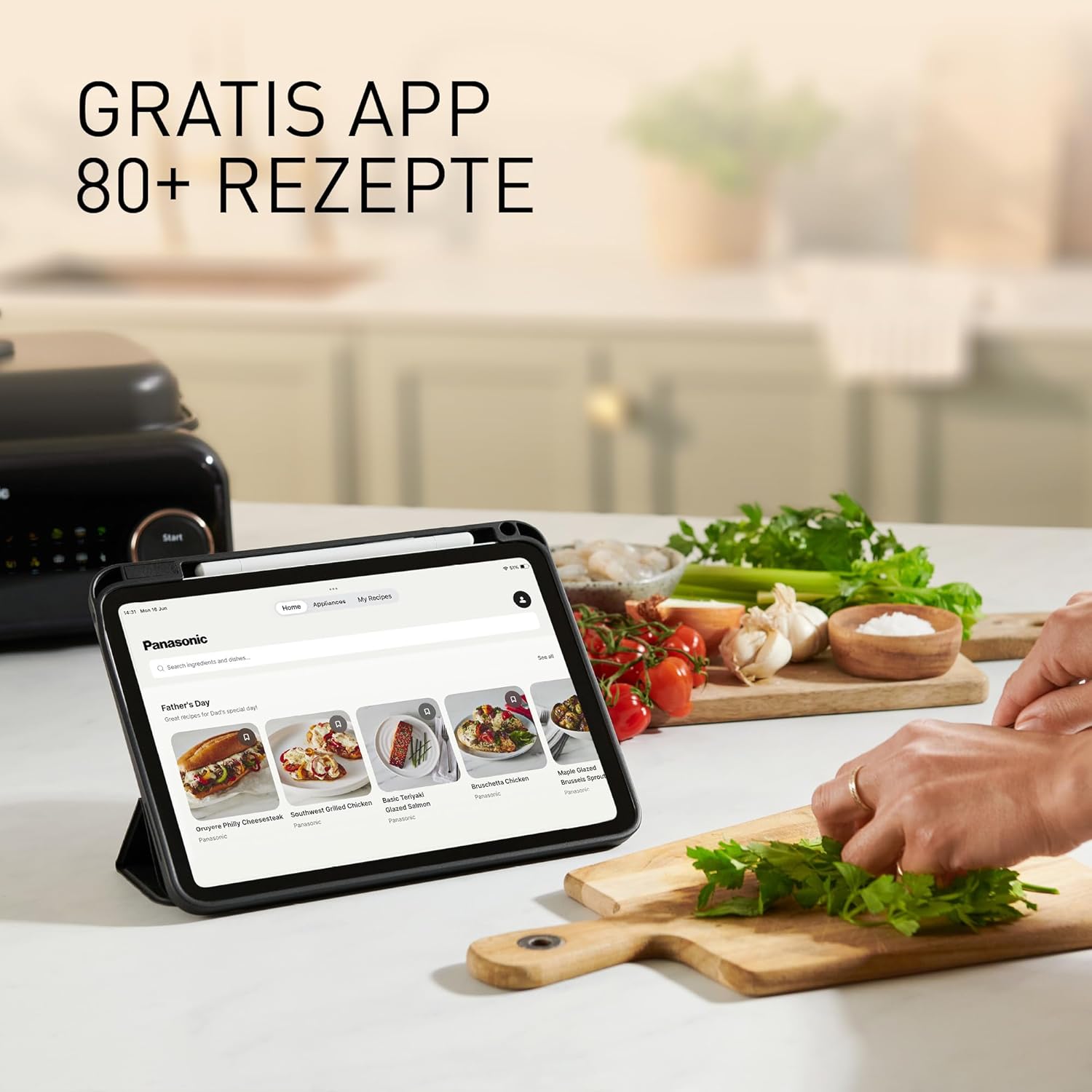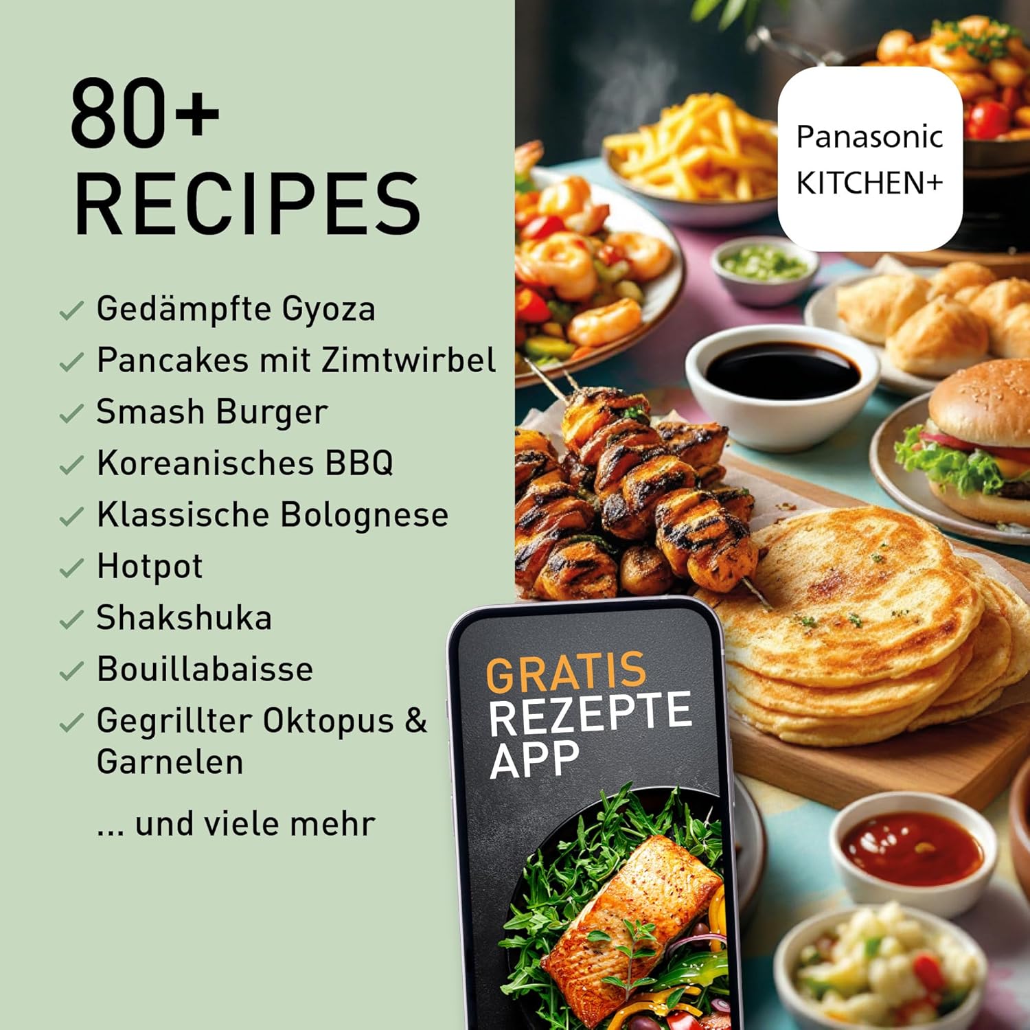 ALL-IN-ONE-KOCHER: Mit diesem Tischgrill, der mehrere Funktionen in einem Küchengerät, inkl. Kebabs über Teppanyaki bis hin zu Burgern alle möglichen Gerichte zubereiten; Tolle Raclette-Alternative INTEGRIERTES ZUBEHÖR: Der Multifunktionskocher enthält 4 Zubehörteile für eine Vielzahl von Gerichten, inkl. tiefen Topf, Dampfgarer, Pfannkuchen und Grill 9 AUTOMATIKPROGRAMME: Vereinfachte Zubereitung mit den 9 Modi des elektrischen Schongarers, inkl. BBQ, Steak, Vorheizen und Warmhalten MANUELLER MODUS: Personalisieren Sie wie Sie mit diesem Dampfgarer dank der flexiblen Temperatureinstellungen und manuellem Timer (5 Minuten bis 12 Stunden) RAUCHFREIER GRILL: Grillen Sie das ganze Jahr über auch in Innenräumen mit dem rauchfreien Tischgrill, welche die Rauch- und Geruchsentwicklung verhindert EINFACHE REINIGUNG: Sparen Sie Zeit mit dem spülmaschinenfesten Zubehör dieses rauchfreien Grills für eine schnelle Reinigung LANGES NETZKABEL: Dieser Slow Cooker findet dank des 2,5 m langen Netzkabels überall Platz KITCHEN+ APP: Genießen Sie über 100 Rezepte und Schritt‑für‑Schritt‑Anleitungen mit der Panasonic Kitchen+ App oder greifen Sie online auf die Rezepte zu. Suchen Sie nach „Panasonic Kitchen+ App“, um mehr zu erfahren | قیمت یورویی : 240.98€