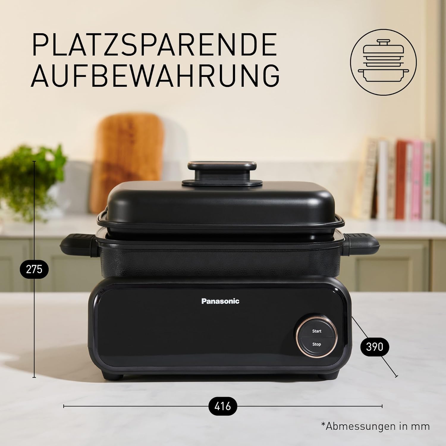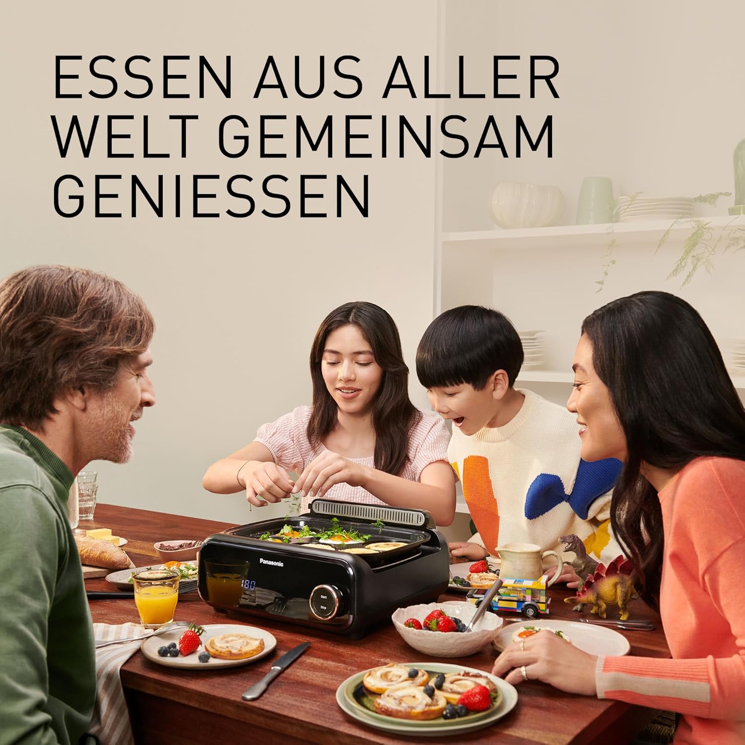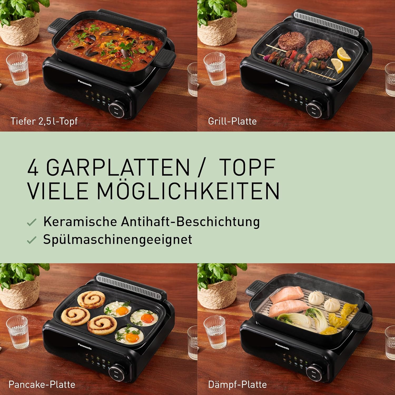 Panasonic NF-GM400KXE 4-in-1 Elektro-Multikocher, Elektro Tischgrill, Braten, Slow Cook, BBQ, Dämpfen, Sautieren, 1400W, 40–250°C, 9 Auto-Modi, 4 Antihaftplatten, Rauchabsaugung, Schwarz 4 Zubehörteile | قیمت یورویی 240.98€