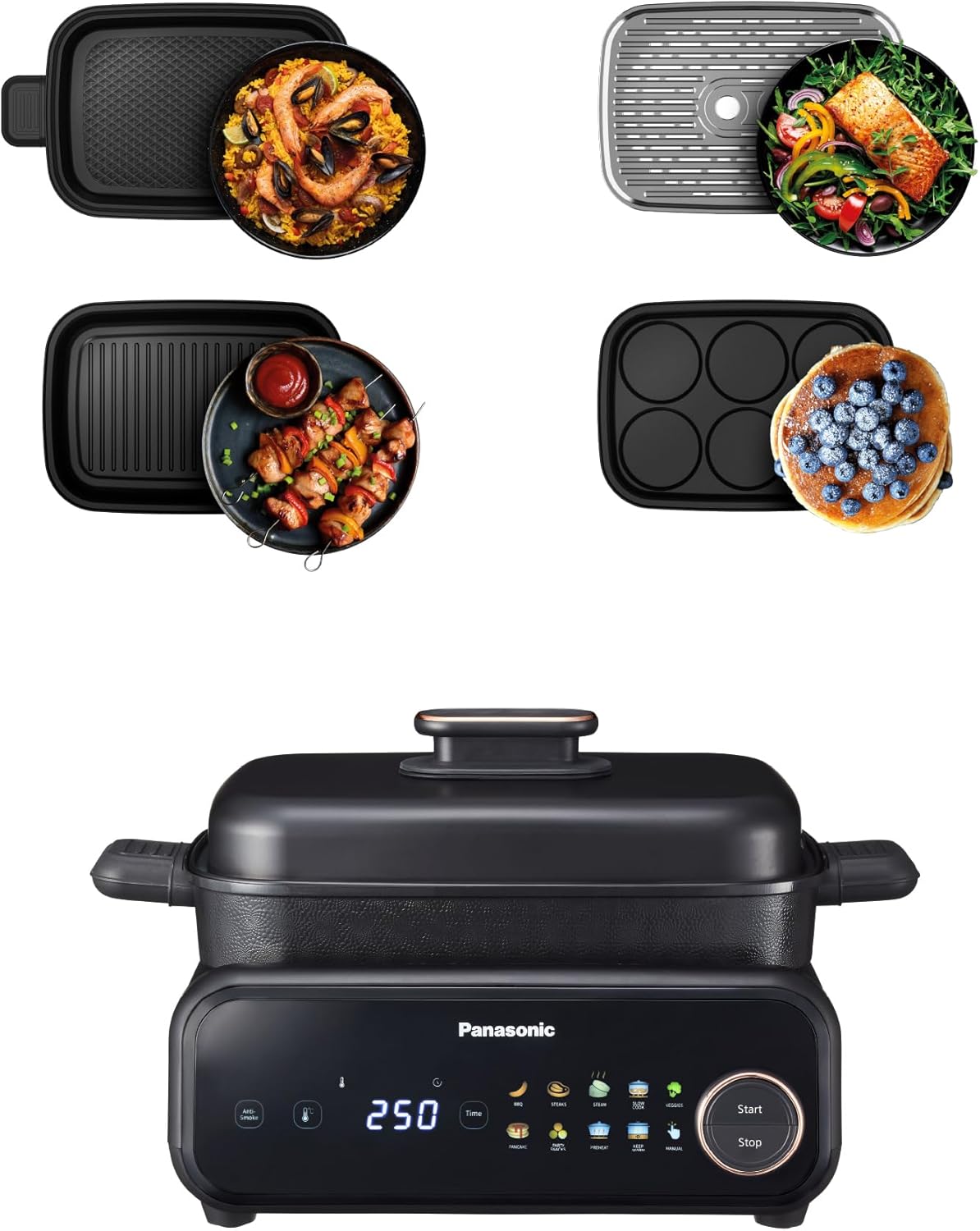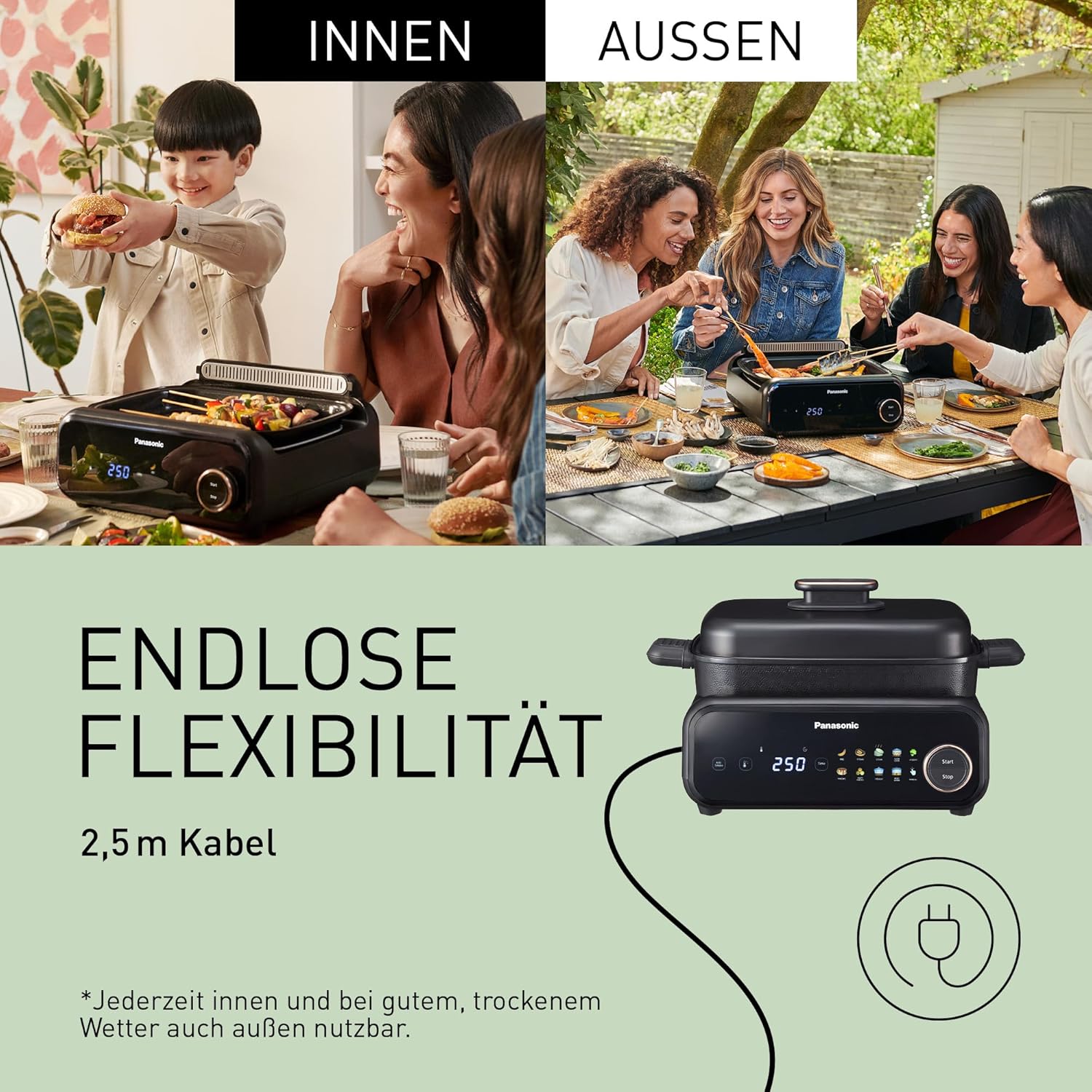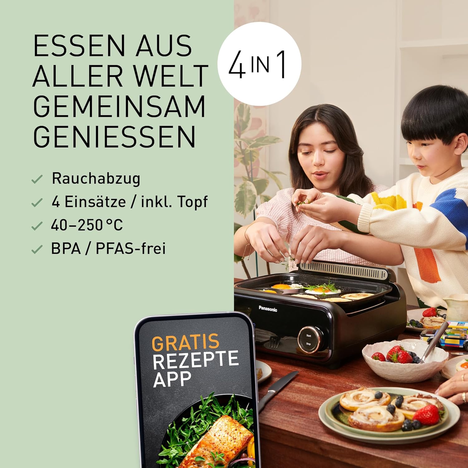 Panasonic NF-GM400KXE 4-in-1 Elektro-Multikocher, Elektro Tischgrill, Braten, Slow Cook, BBQ, Dämpfen, Sautieren, 1400W, 40–250°C, 9 Auto-Modi, 4 Antihaftplatten, Rauchabsaugung, Schwarz 4 Zubehörteile | قیمت یورویی 240.98€