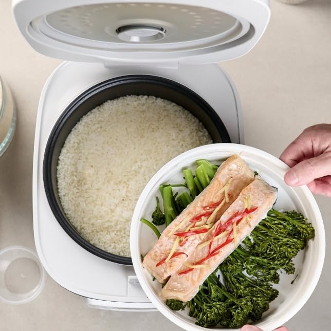 Vielseitig & leistungsstark: 1,5 L Reiskocher & Dampfgarer für bis zu 8 Portionen – ideal für Familien und Alltag. 4 automatische Programme: Weißreis, Naturreis, Congee/Suppe & Schnellkoch-/Dampfmodus. Gesundes Kochen: PFAS-freie, keramisch beschichtete Antihaft-Innenschale, leicht zu reinigen. Komfortfunktionen: Warmhaltefunktion bis 24 Std. & Timer mit Startzeitvorwahl. Praktisch & kompakt: Inklusive Dampfaufsatz, modernes Design, 770 W Leistung. | قیمت یورویی : 111.18€