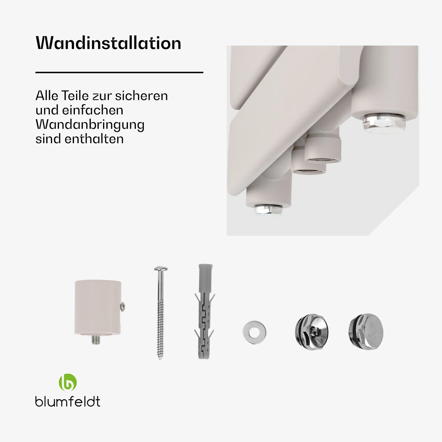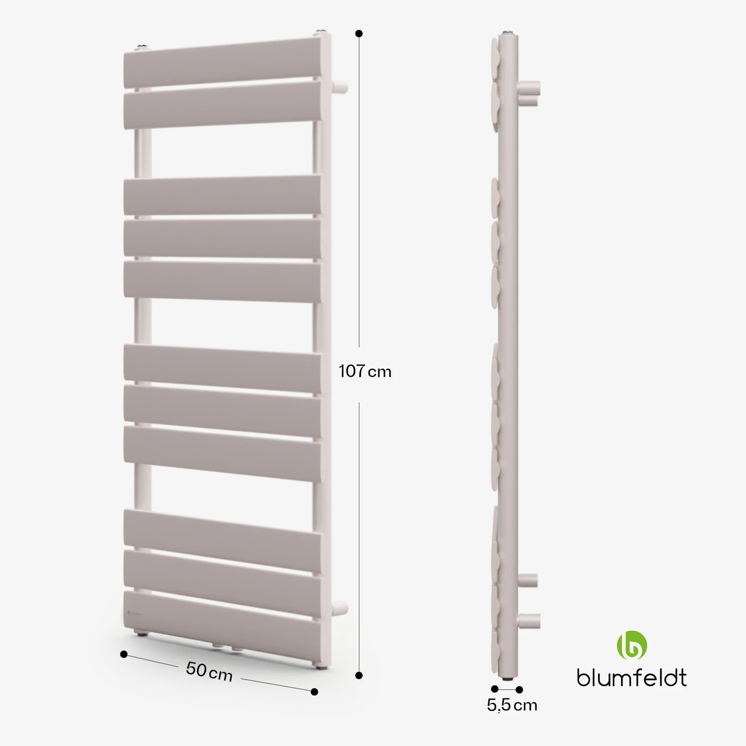 فضاهای یکپارچه برای آویزان کردن و گرم کردن تا چهار حوله، گرمای بیشتری را تضمین می‌کند. و به لطف طراحی مسطح 11 پره گرمایشی، رادیاتور به سرعت و به راحتی تمیز می‌شود. گرمای دلپذیر بلافاصله پس از دوش گرفتن یا حمام کردن، یک تجربه شیک با رادیاتور حمام Blumfeldt Fairmont 50 x 107 است.