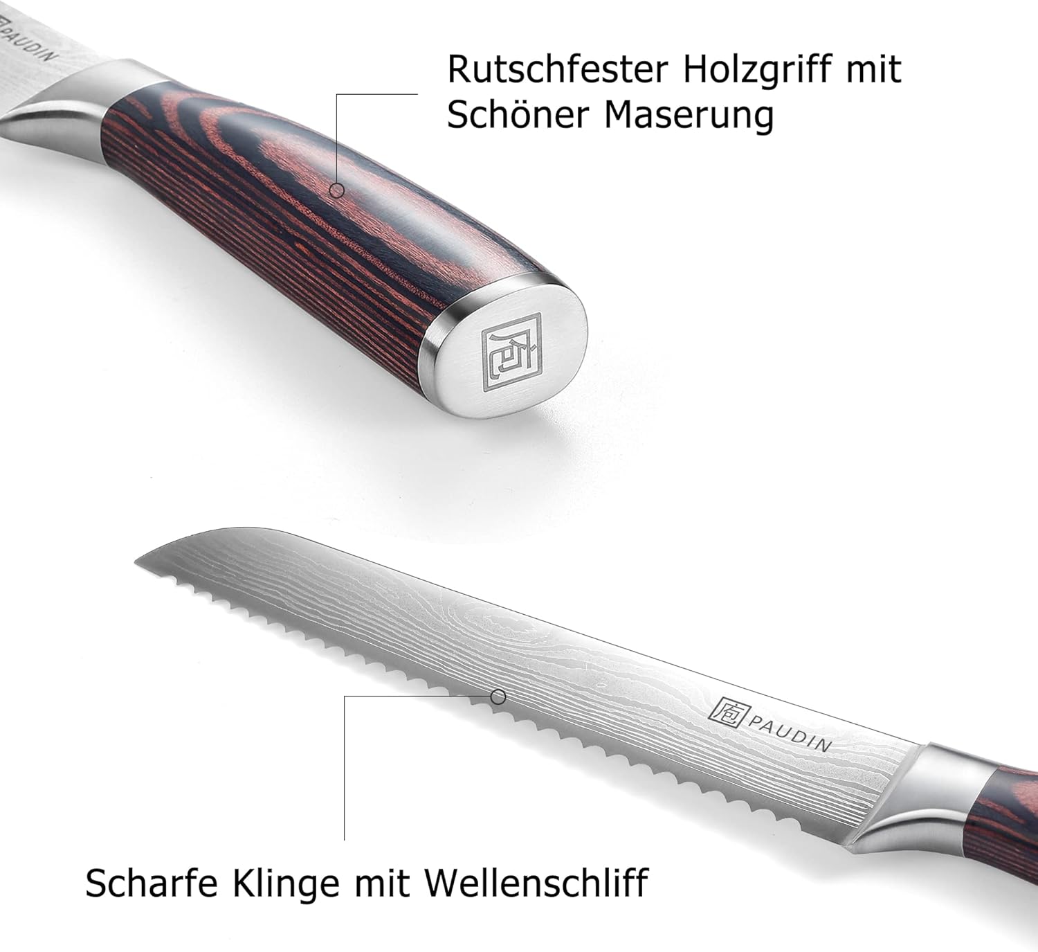 Ultrascharfe Klinge: Die ultra scharfe Klinge ist aus hochwertigem Carbonstahl gefertigt. Die gezackte Schneide reißt mühelos die Kruste von Brot auf und schneidet es in glatte Scheiben. Die Klinge hat keine Beschichtung und sind im Berührung mit Lebensmitteln sehr sicher. Ob zum Frühstück, Mittagessen oder Abendessen, das Brotmesser mit Wellenschliff sorgt stets für perfekte Brotscheiben Hochwertige Materialien: Das professionelle Brotmesser mit 20 cm Klinge ist aus rostfreiem deutschem Edelstahl mit hohem Kohlenstoffgehalt gefertigt (KEIN Damastmesser). Die Klinge ist definitiv rostfrei und hat eine Rockwell-Härte von 56-58, die für ihre hohe Qualität, Schnitthaltigkeit und Langlebigkeit bekannt ist Ergonomischer Griff: Der Griff des Messers ist für seine Handhabung, Komfort, Stärke und Stabilität bekannt. Der Griff ist ergonomisch geformt und besteht aus elegantem Holz mit integriertem Fingerschutz, was eine sichere und schnelle Arbeit ermöglicht. Das PAUDIN Brotmesser ist für unterschiedliche Handgrößen optimal geeignet. Multifunktionales Kochmesser: Ein gezackte Messer ist mehr als nur ein Brotmesser. Mit diesem gezackten Messer können Sie auch hervorragend, gerade weiche Früchten und Gemüse bearbeiten, ohne es zu quetschen. Auch für Braten und Geflügel ist es hervorragend geeignet. Lebenslange Garantie: Wir bieten Ihnen eine 100% Zufriedenheitsgarantie. Sollten Sie Problem haben, kontaktieren Sie uns bitte und wir werden Ihnen den Kauf erstatten oder ersetzen! Lebenslange Garantie auf Material- oder Verarbeitungsmängel. Kaufen ohne Risiko. | قیمت یورویی : 29.99€