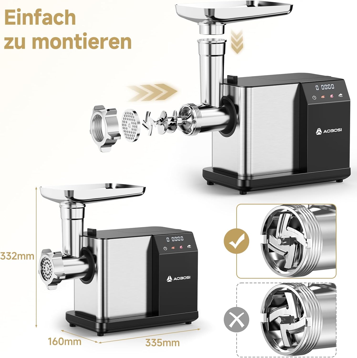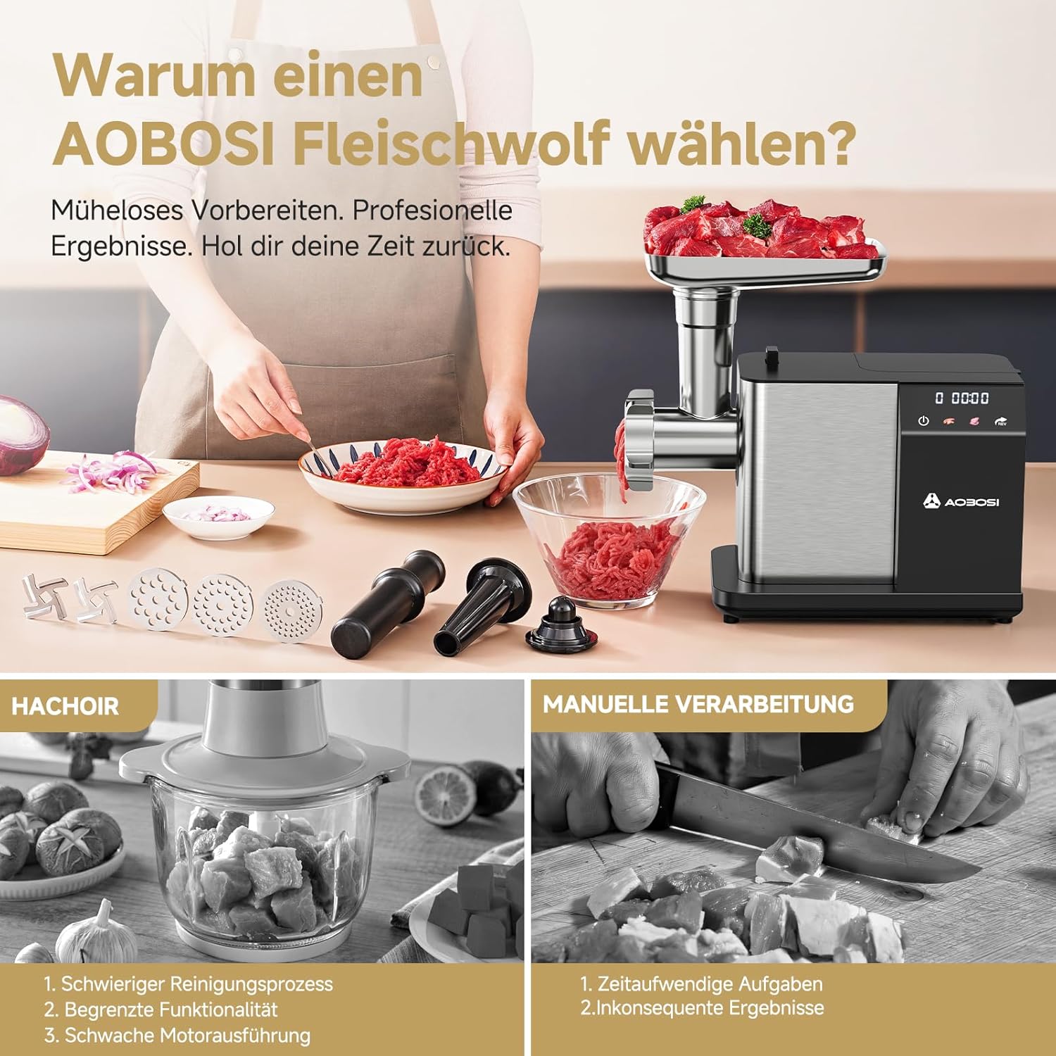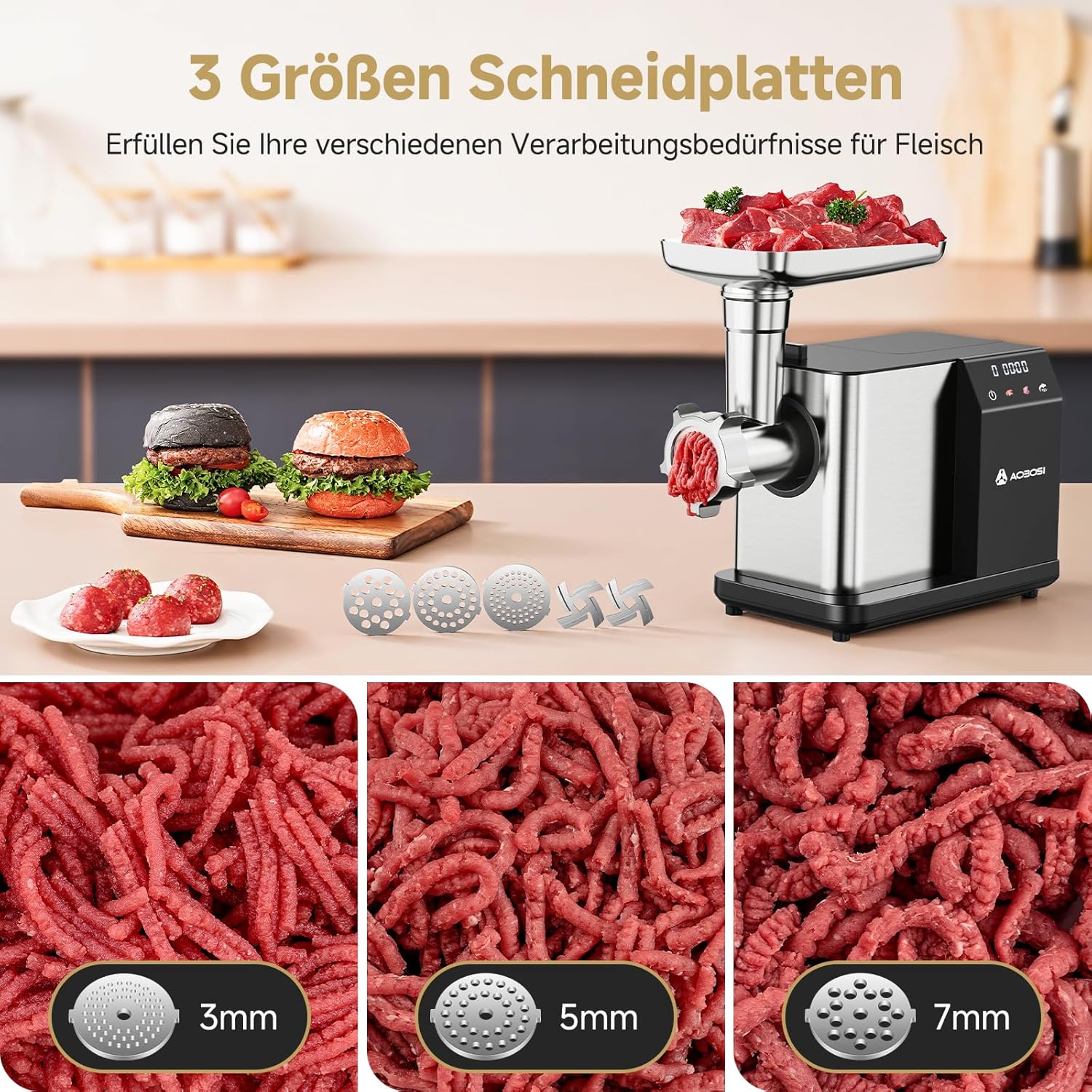 AAOBOSI Fleischwolf Elektrisch [3000W MAX] mit LED-Display,3 Geschwindigkeiten,Fleischwolf mit Anti-Verstopfungstechnik,Eingebauter Speicherbox,Wurstfüller & Kibbe-Herstellung für den Hausgebrauch Standard Silber