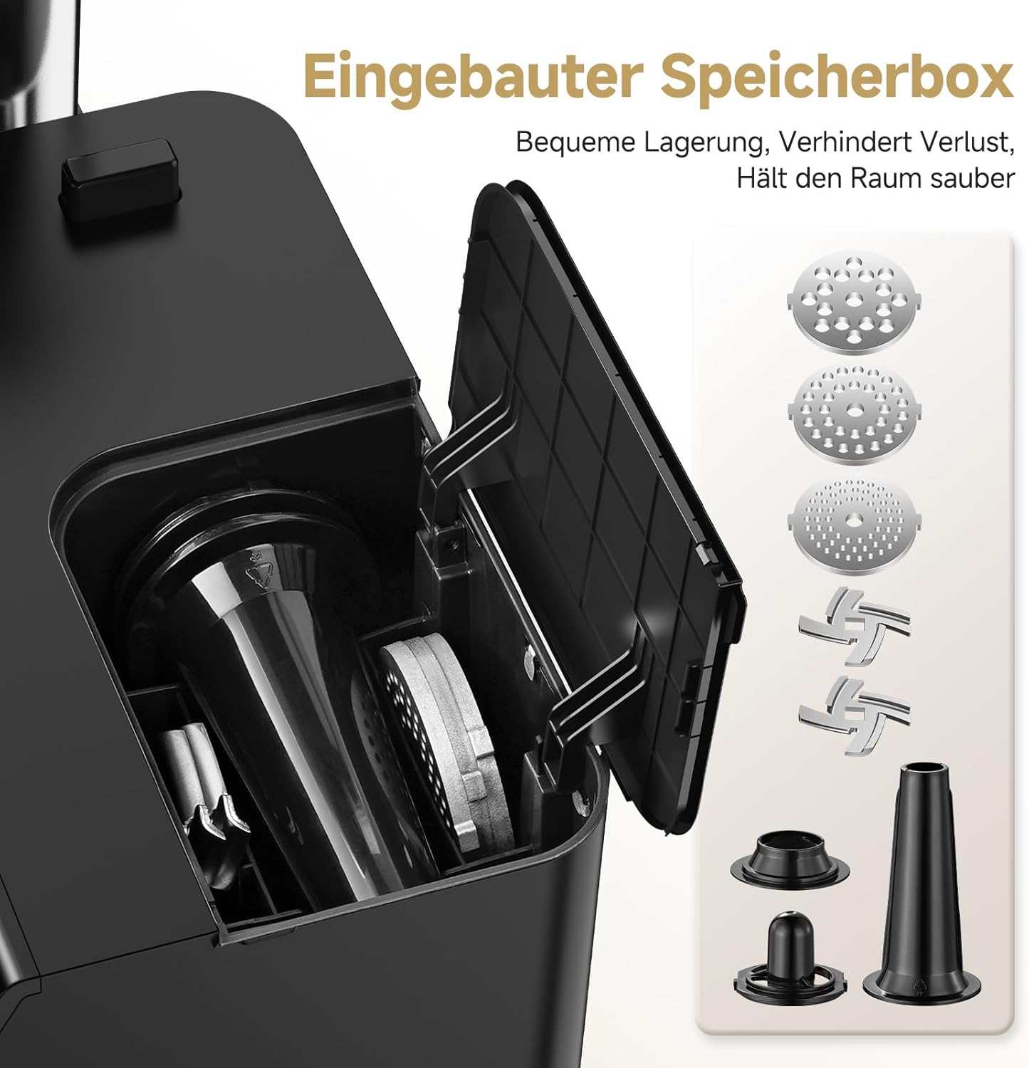 【جعبه نگهداری داخلی و لوازم جانبی کامل】چرخ گوشت برقی ما دارای یک جعبه نگهداری داخلی است تا تمام لوازم جانبی - از جمله ۲ تیغه، ۳ صفحه چرخ گوشت، و یک دستگاه پر کردن سوسیس و کیبه - را به طور مرتب در خود جای دهد. با آشپزخانههای نامرتب خداحافظی کنید - هر آنچه نیاز دارید به طور مرتب در یک مکان نگهداری میشود.