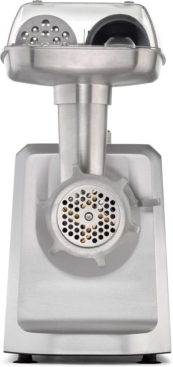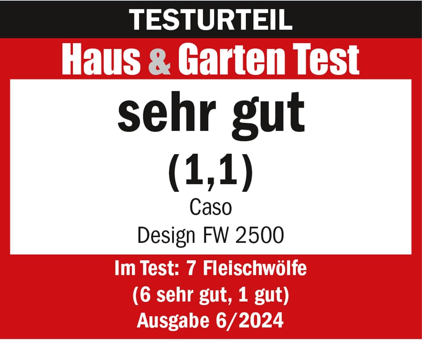چرخ گوشت CASO FW 2500 نقرهای، با قدرت ۲۵۰۰ وات، امتیاز آزمایش: خیلی خوب، تیغه تیتانیومی، عملکرد معکوس، لوازم جانبی شامل همبرگر زن، ۲۵۰۰ وات، نقرهای