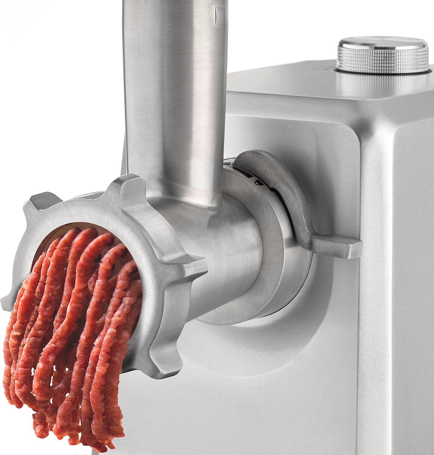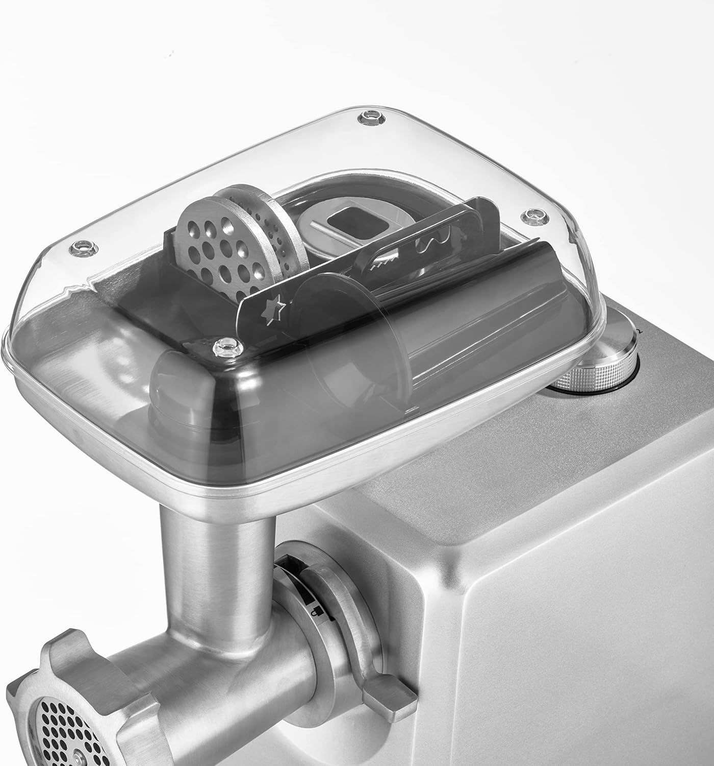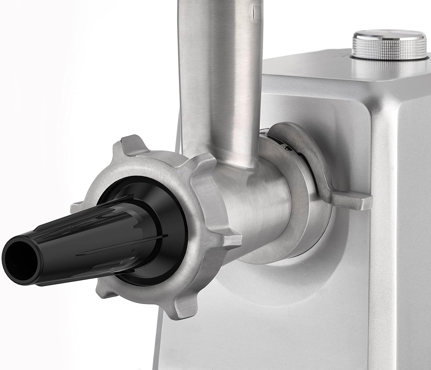 Leistungsstarker Motor: Im silbernen Gehäuse arbeitet ein 2500 Watt starker Motor mit 2 Geschwindigkeitsstufen und einem Rücklauf. Für ein schnelles Verarbeiten von bis zu 2,5 kg Lebensmittel/min. Zahlreiche Herstellungsmöglichkeiten: z.B (Fisch)Frikadellen, Hackfleisch, Burger-Patties, Kartoffelklöße, Gemüsebratlinge, Tofu-Bratwurst, Spritzgebäck, Brotaufstrich, uvm. Mit hochwertiger, langlebiger Titan-veredelter Klinge: Der Fleischwolf zerkleinert problemlos rohes und gegartes Fleisch, Fisch & Gemüse. Dabei ist der Gleichstrom-Motor (DC) geräuschärmer im Vergleich zu AC Motoren. Umfangreiches Zubehör: Burgerpresse für 2 Pattygrößen und für gefüllte Patties, 3 Edelstahl-Lochscheiben (3 mm, 5mm, 8 mm), Wurstfüller, Spritzgebäck-Aufsatz mit 4 Formen, Stopfer. Sicherer Stand und leichte Reinigung: Saugfüße sorgen für einen sicheren Halt. Durch die einfache Montage/Demontage aller Teile, ist der Fleischwolf leicht zu reinigen. | قیمت یورویی : 154.7€