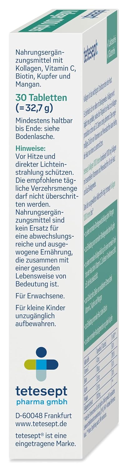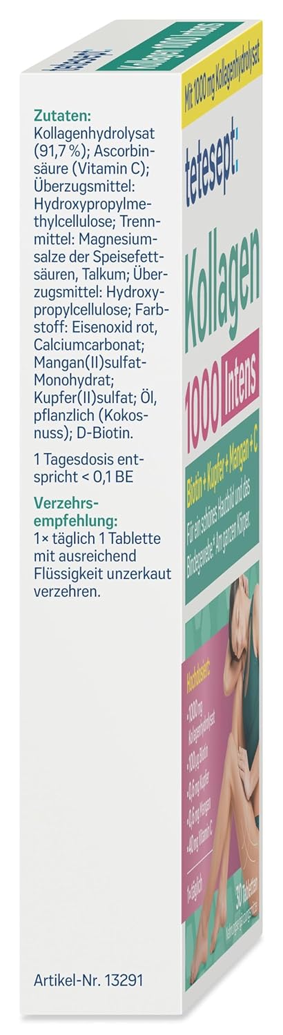 tetesept Kollagen 1000 Intens - Nahrungsergänzungsmittel mit Kollagen, Vitamin C, Biotin, Kupfer & Mangan - Für das Bindegewebe und ein schönes Hautbild - 4 x 30 Tabletten | قیمت یورویی 22.99€