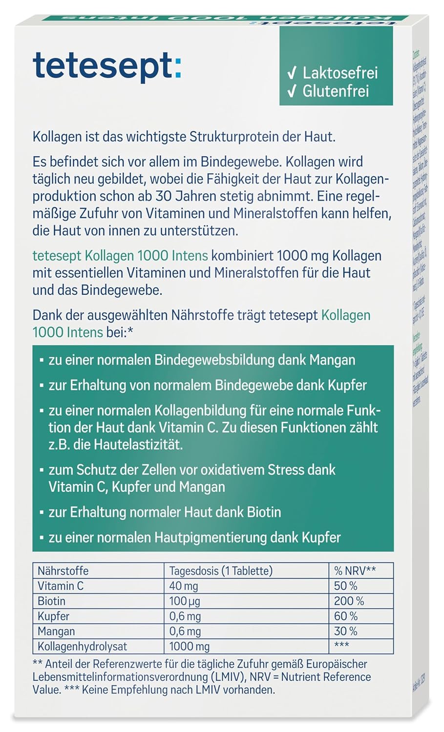 Für das Bindegewebe: Kollagen ist das wichtigste Strukturprotein der Haut und befindet sich vor allem im Bindegewebe - es wird täglich neu gebildet, wobei die Fähigkeit der Haut dazu schon ab 30 Jahren stetig abnimmt. Unterstützung von innen: eine regelmäßige Zufuhr von Vitaminen und Mineralstoffen kann helfen, die Haut von innen zu unterstützen. Ausgewählte Nährstoffe: tetesept kombiniert 1000mg Kollagen mit essentiellen Vitaminen und Mineralstoffen für die Haut und das Bindegewebe - 1 x täglich, hochdosiert. Für die Haut und das Bindegewebe: Vitamin C trägt zur normalen Kollagenbildung für eine normale Funktion der Haut bei, Mangan trägt zu einer normalen Bindegewebsbildung & Kupfer zur Erhaltung von normalem Bindegewebe bei. Lieferumfang: 4 x 30 Tabletten tetesept Kollagen 1000 Intens - für Hautelastizität und Bindegewebe dank Vitamin C, Kupfer, Kollagen und Mangan - hochdosiert | قیمت یورویی : 22.99€