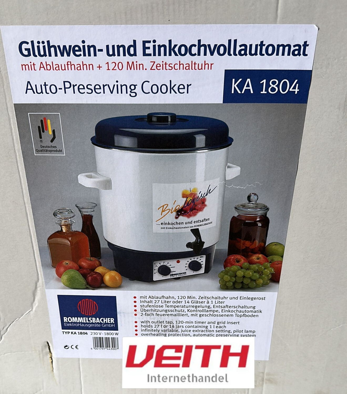 دستگاه کنسرو و پخت روملزباخر آلمان ROMMELSBACHER KA 1804 یک ابزار حرفهای برای نگهداری و کنسرو مواد غذایی در خانه است که با ظرفیت ۲۷ لیتر (حدود ۱۴ شیشه یکلیتری) طراحی شده و برای انواع میوه، سبزیجات، سسها و مربا مناسب است.