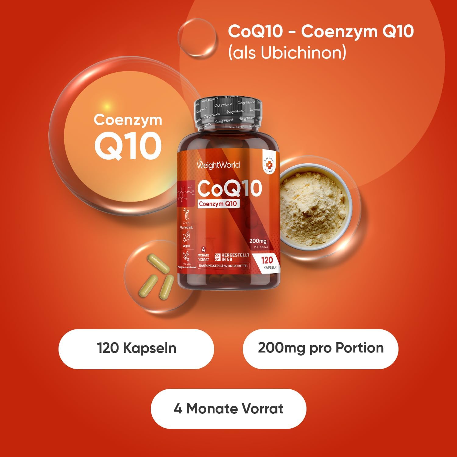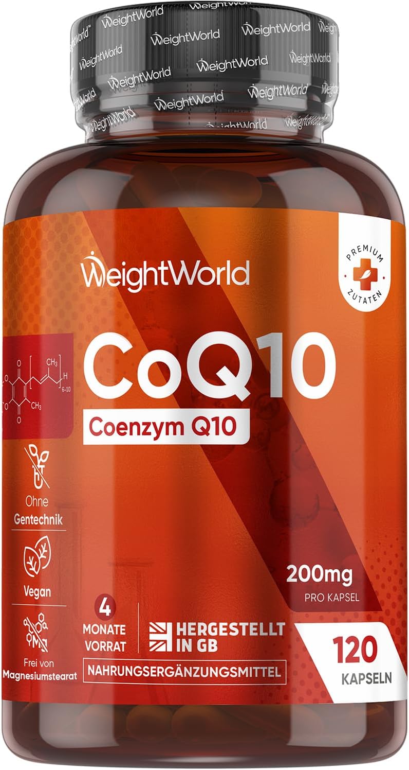 Coenzym Q10-200mg pro Kapsel - 120 vegane CoQ10 Kapseln - 4 Monate Vorrat - 1 Kapsel pro Tag - Frei von Magnesiumstearat, Ohne Gentechnik & Gemäß GMP - q 10 coenzym (als Ubichinon) - Von WeightWorld | قیمت یورویی 16.14€